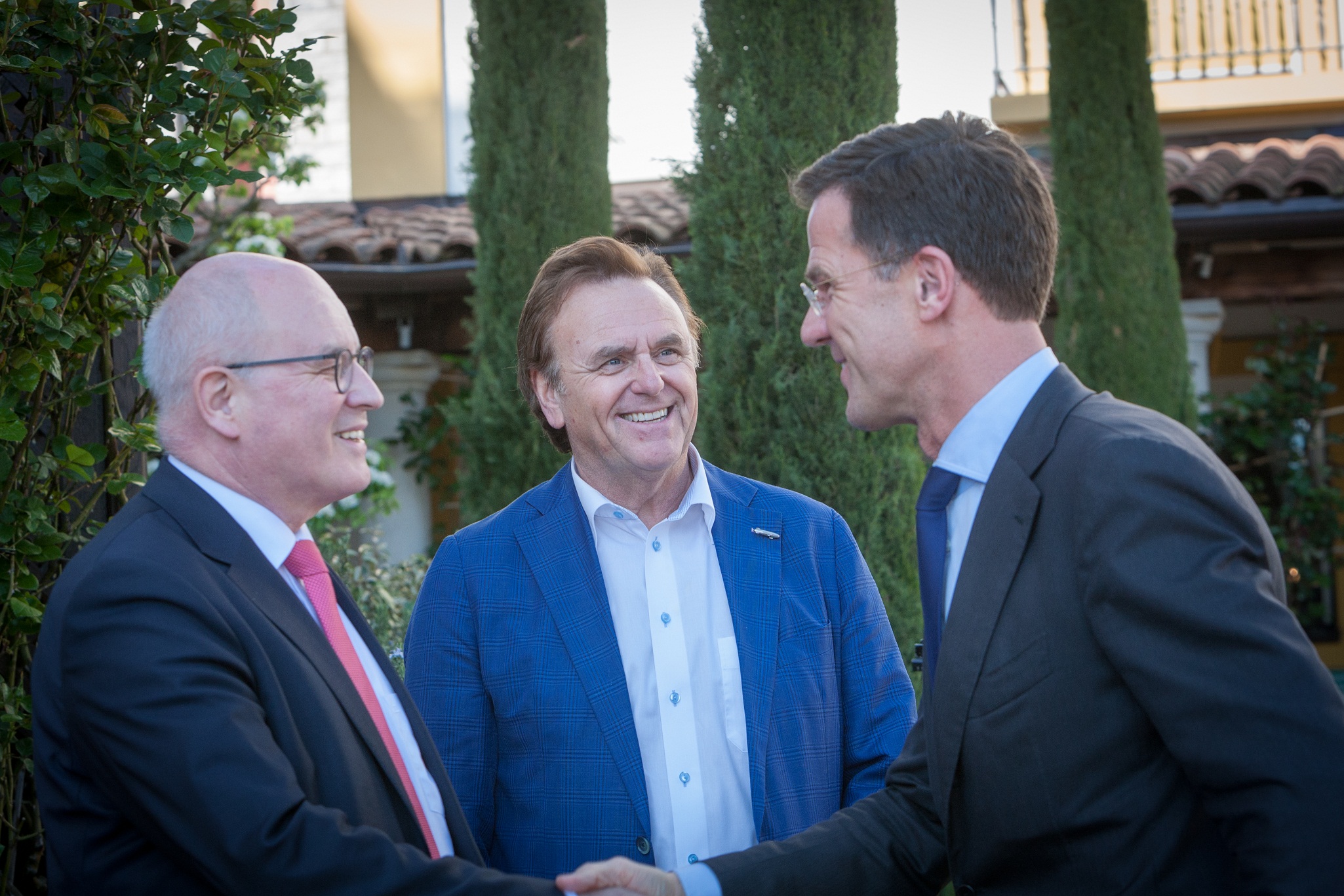 Der Vorsitzende der CDU/CSU-Bundestagsfraktion Volker Kauder und Europa-Park Geschäftsführer Roland Mack begrüßen den niederländischen Ministerpräsidenten Mark Rutte im Europa-Park (v.l.).
