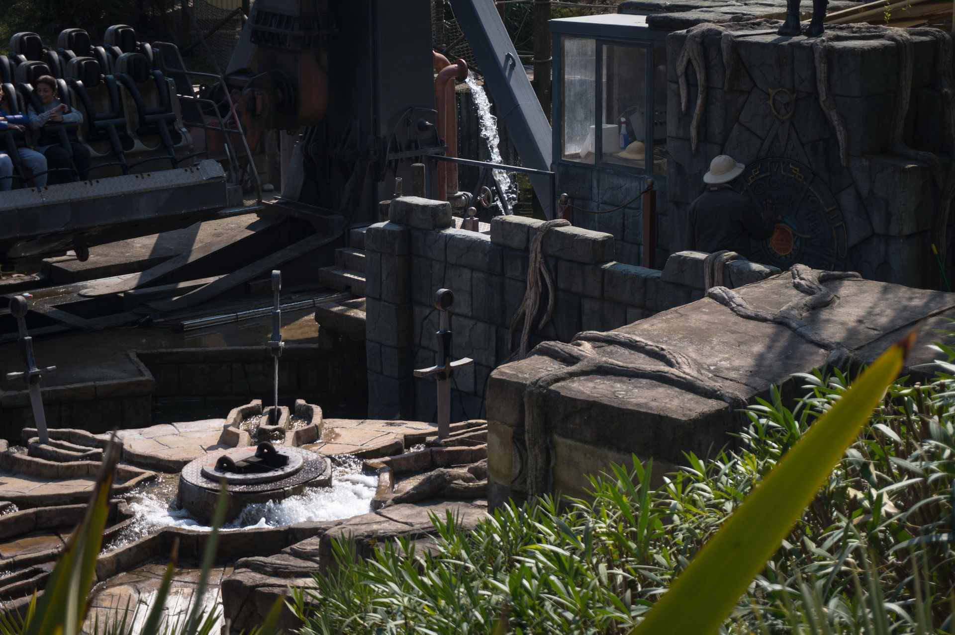 Dadurch ergibt sich nun ein separater Zugang zur Tomb Raider Machine, ein Windshear aus dem Hause Soriani & Moser, welcher großzügig mit Wasser-, Feuer-, Nebeleffekten und etwas Schauspiel inszeniert wird. Gefahren werden können hier grundsätzlich fünf verschiedene Fahrprogramme, die durch eine Wahlscheibe zufällig, sofern der Ride-Op die Scheibe nicht zuvor bremst und sie dann auf eine Mission einstellt, bestimmt werden. Je nach ausgewählter Mission variieren nun Fahrtdauer, Intensität und die verwendeten Effekte. Dabei ist die dargebotene Schau der Anlage durchaus spannender anzusehen als die Fahrt an sich, die doch eher etwas ruckelig daherkommt.