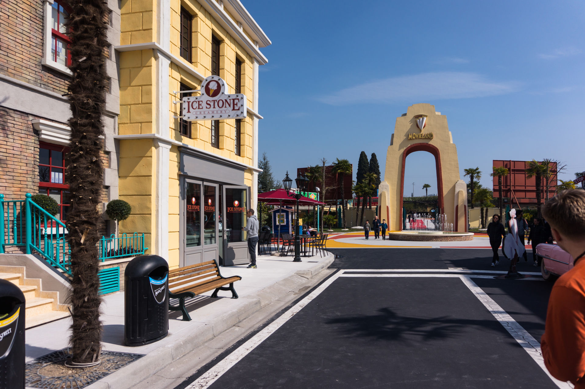 Nachdem man die Tickets an den zentralen Kassen beim Wasserpark gekauft hat folgt man dem Weg entlang der Hauptstraße um zum eigentlichen Vorplatz des Filmparks zu gelangen. Bis zur vorherigen Saison betrat man den Park durch das große Studiotor, nun dienen zwei Busse als neues Eingangsportal.