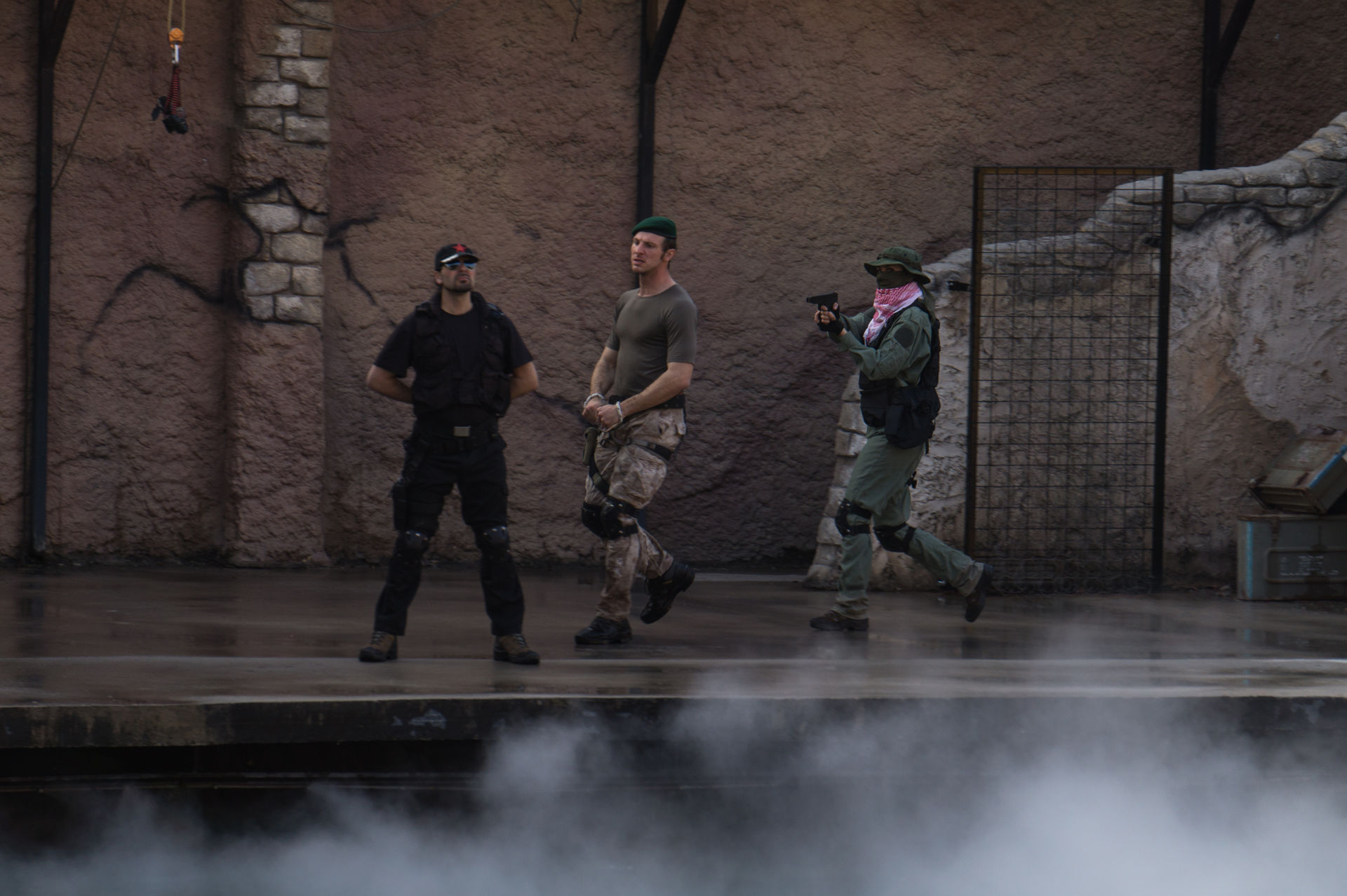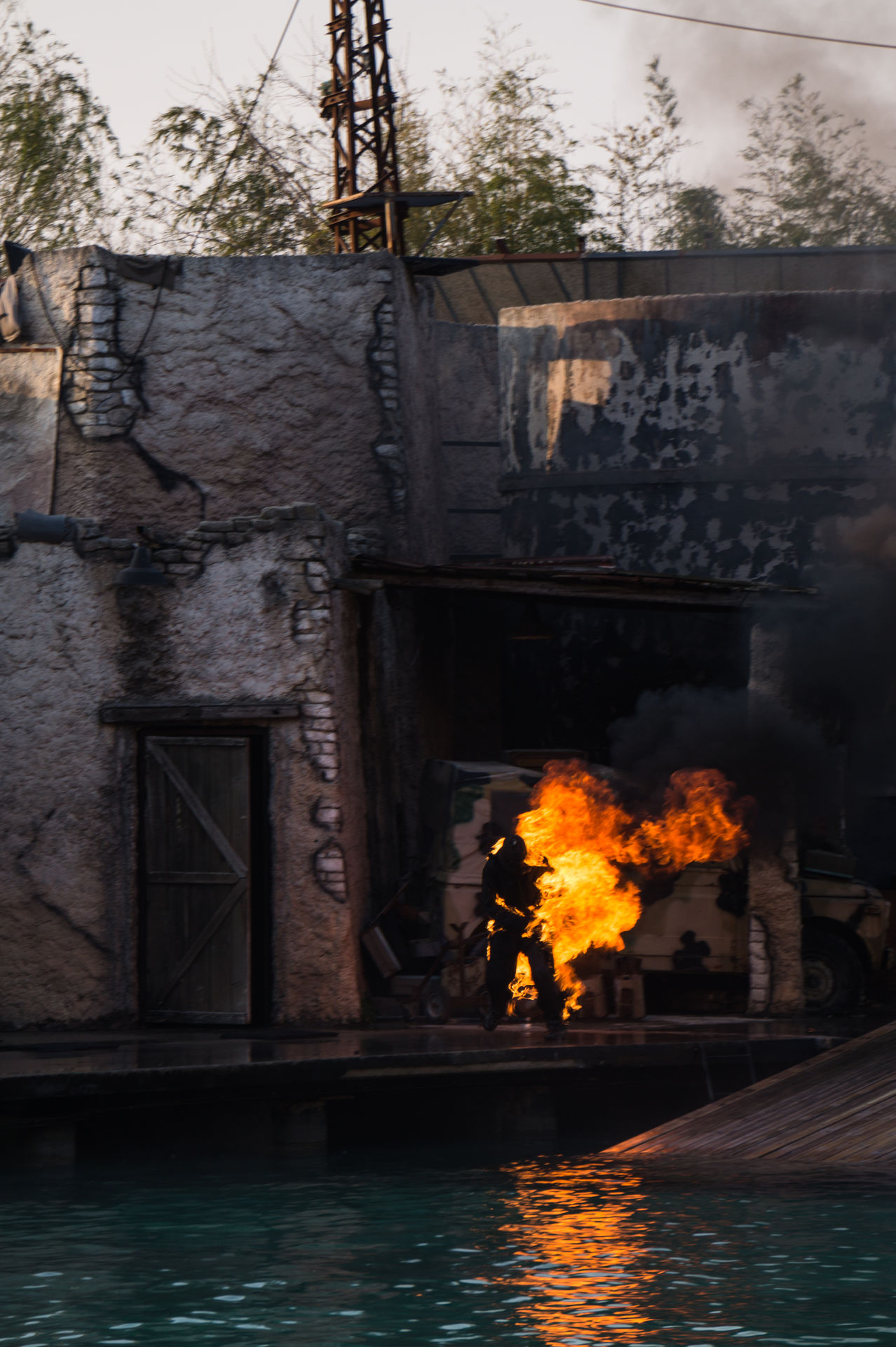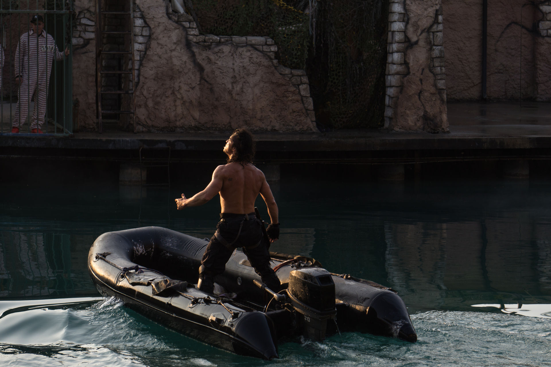 Kurz nach 17 Uhr öffneten sich die Pforten zur John Rambo Stunt Show und die verbliebenden Gäste konnten in etwa die Hälfte der riesigen Showarena füllen. Kurz darauf werden auch schon ein alter Kamerad John Rambos und einige Besucher von Terroristen gefangen genommen. John Rambo eilt herbei um seinen Kollegen zu befreien, wird dabei aber recht schnell entdeckt. Es beginnt eine Action Sequenz mit Motorrädern und Quads, an deren Ende Rambo ordentlich Prügel einstecken muss. Während dessen hat sich sein Kamerad befreit und gemeinsam schaffen sie ein wenig Ordnung. Eine verdeckt arbeitende Soldatin schließt sich an, nur um kurz darauf in einem Hinterhalt gefangen genommen zu werden. Währenddessen werden die Geiseln (die gefangen genommenen Besucher) auf die Hauptbühne gebracht und dürfen das Spektakel nun hautnah erleben. Als einzige nicht gefangen genommene Person versucht Rambo in einer One-Man-Army Sequenz jeden zu befreien. Dabei befreit er erst seinen Kollegen und öffnet die Fluchtwege, woraufhin eine actionbelandene Schau auf dem Wasser stattfindet, in der auch die restlichen Besucher mal wieder ein wenig Wasser abbekommen. Nachdem die feindlichen Streitkräfte zu einem Großteil besiegt sind und die Geiseln via Motorboot auf die vordere Bühne gebracht wurden gibt es noch eine kleine Liebesgeschichte zwischen Rambo und der Soldatin, die jedoch kurz darauf von dem einzigen übrig gebliebenen Widersacher tödlich verletzt wird. Daraufhin zückt Rambo seinen Bogen, feuert einen Pfeil auf die Ölfässer auf der gegenüber liegenden Seite und löst somit eine Explosion aus, die den Feind in Brand steckt.