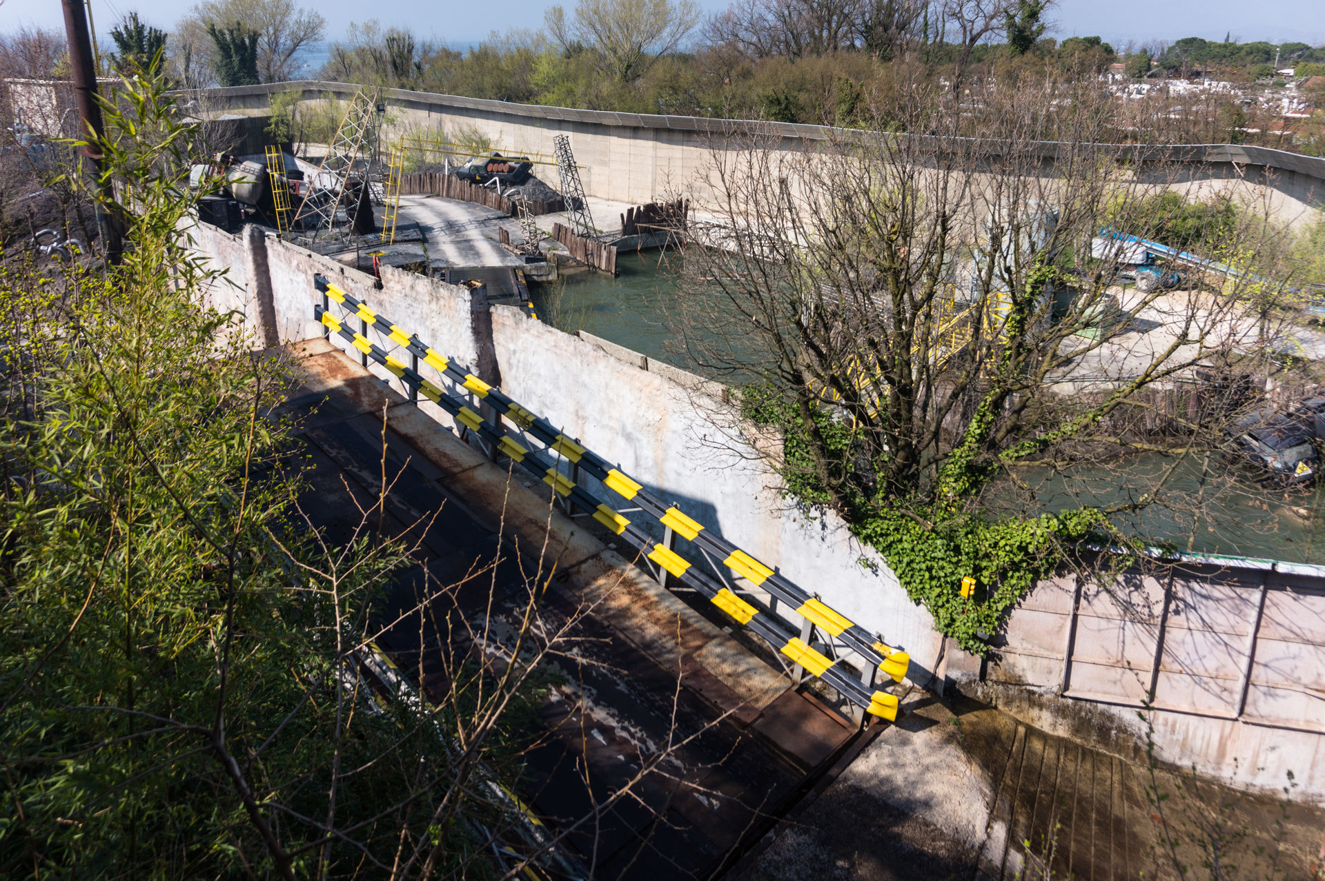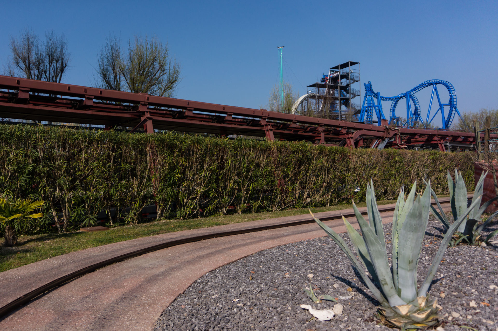 Vorbei an der kleinen Monza Piste Route 66 führt unser Weg durch das Eingangsportal auf den Vorplatz des Parks, von dem aus zwei Brücken zu unserem nächsten Ziel führen, dem Diabolik Invertigo aus dem Hause