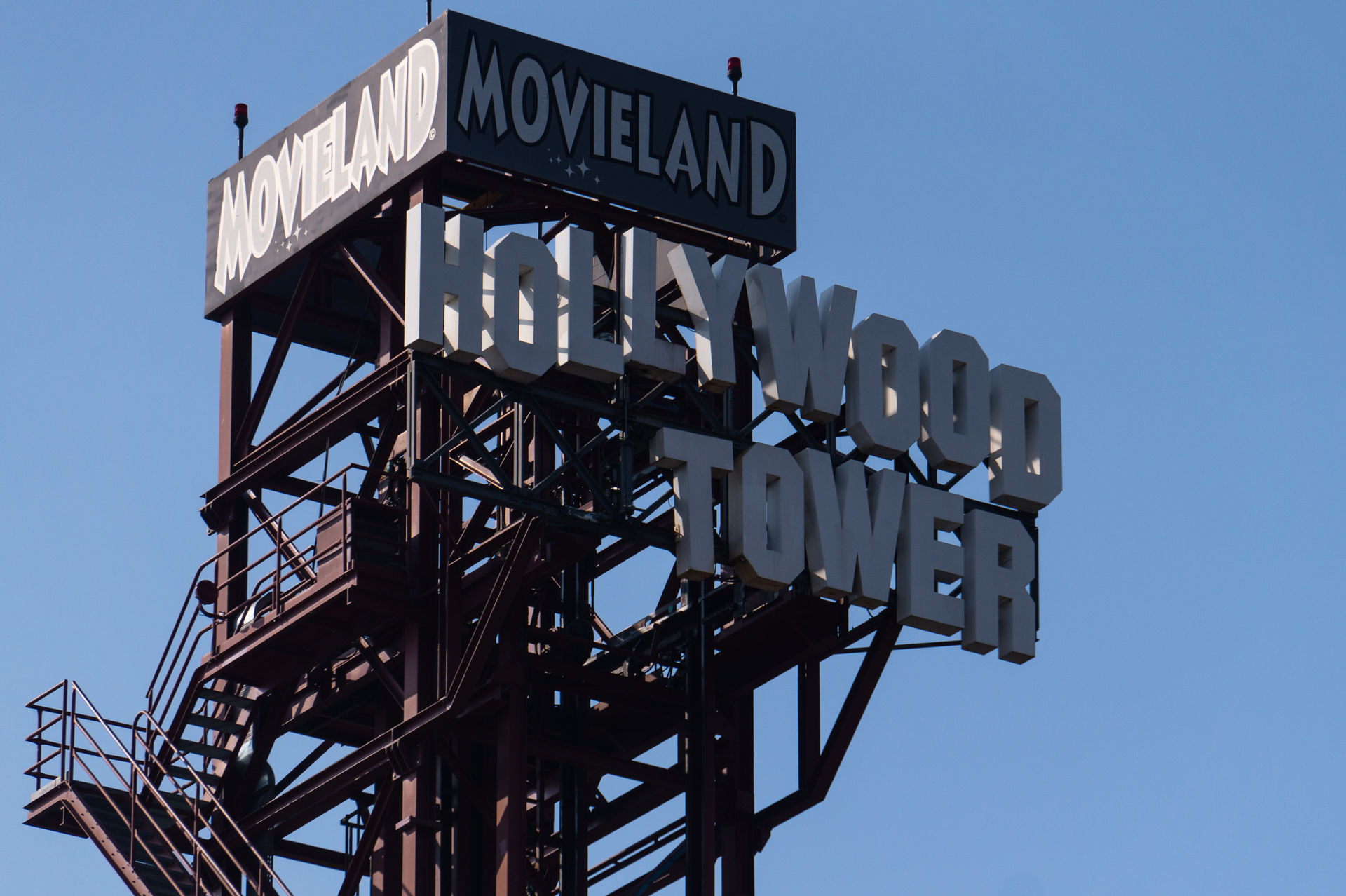 Der Hollywood Action Tower ist eine der Attraktionen mit dem das Movieland nachts noch Werbung macht,