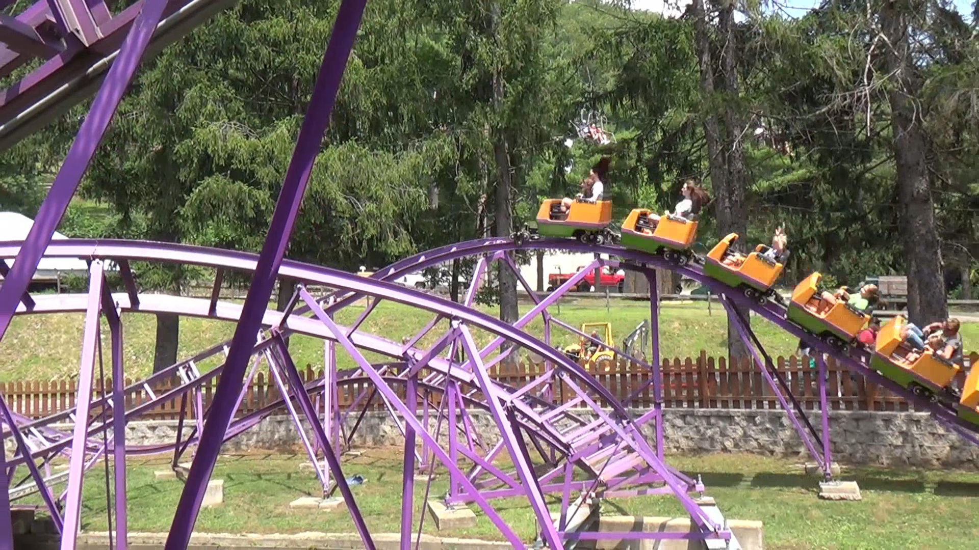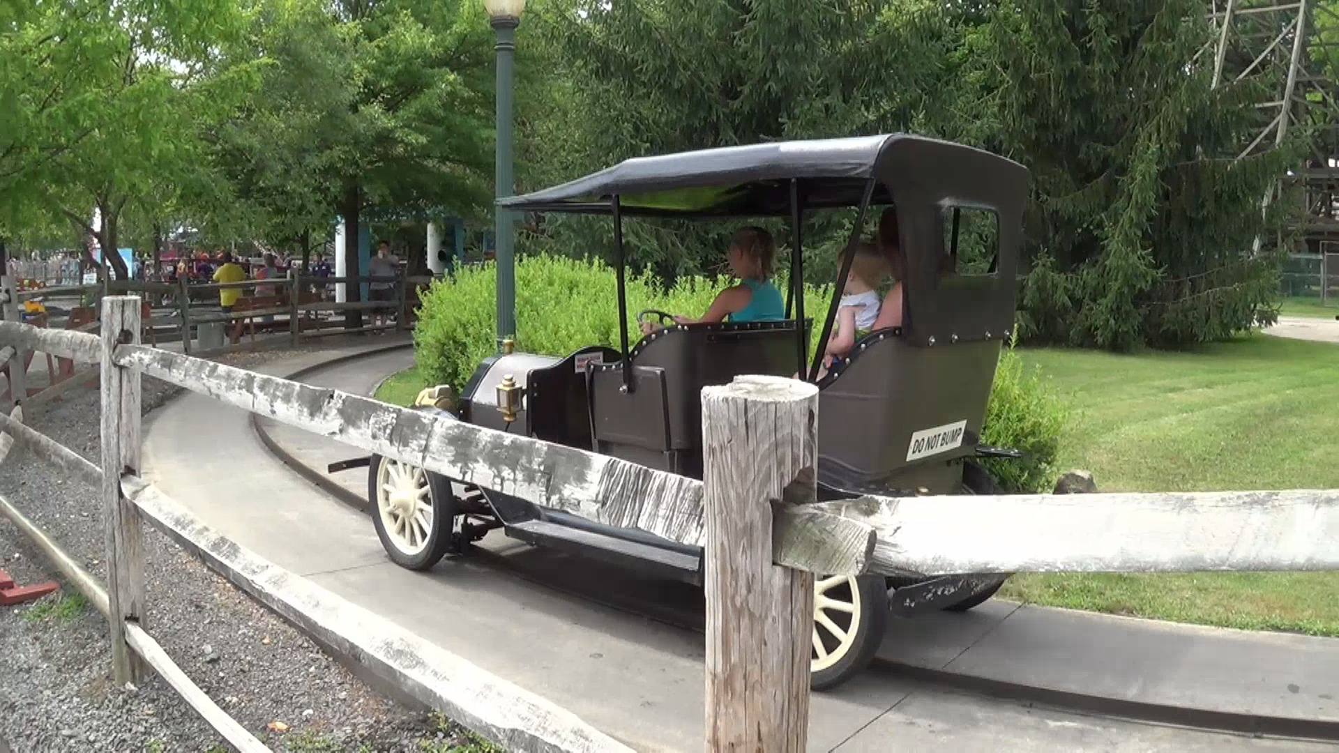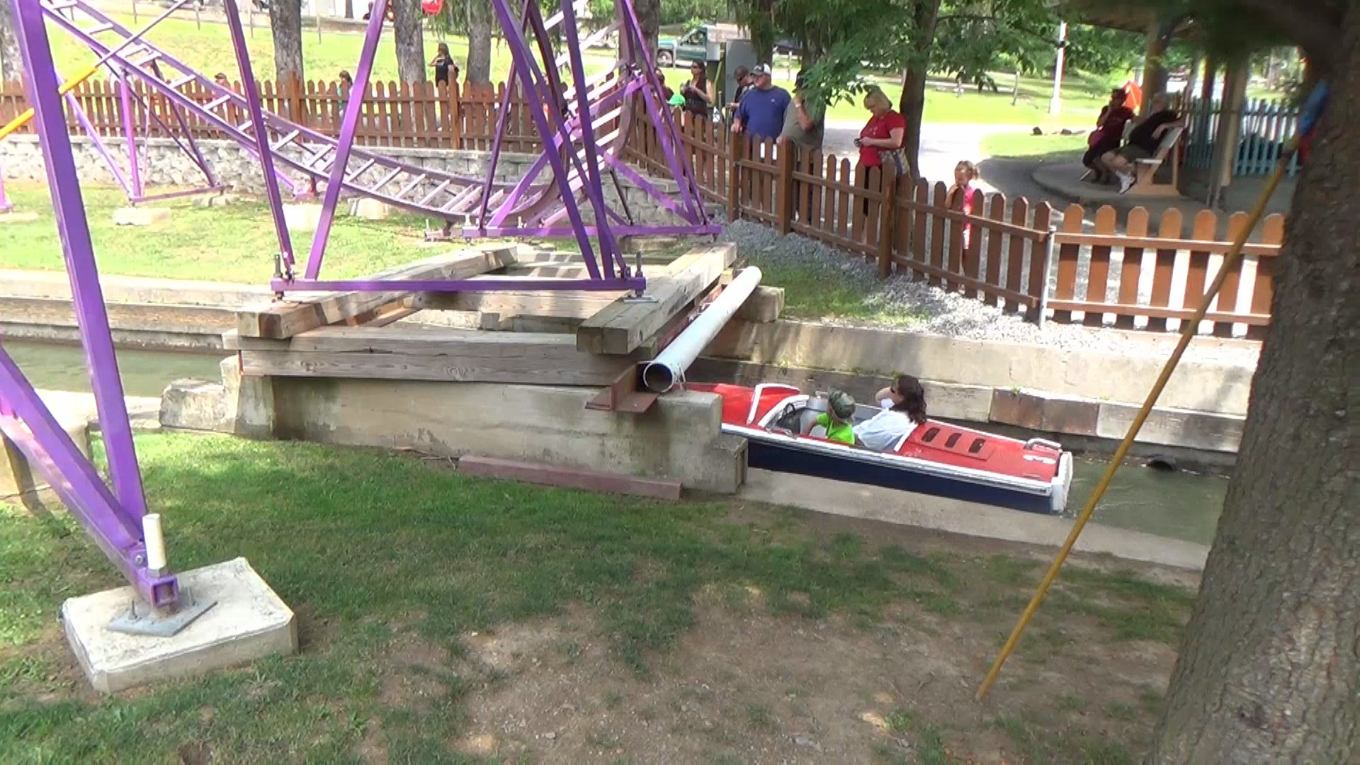 Witzig ist jedenfalls, dass halb um und halb unter dem Bähnchen ein Betonkanal verläuft, der per Bööötchen (ein ö sieht blöd aus und zwei sind falsch) befahren werden kann. Dadurch bildet sich zum Einen eine Insel auf dem die Station des Coasters steht und die per "Knoebels Bridge" zu erreichen ist - welche eigentlich nur nennenswert ist aufgrund des Nennens ihres eigenen Namens per Schild - zum Anderen sind an mehreren Stellen Stahlträger als Basis für die Stützen so über den Kanal gelegt, dass man sich augenscheinlich im Boot fast schon ducken muss, um ohne Kopfweh wieder auszusteigen. Bemerkenswert ist auch, dass der Park hier tatsächlich doch mal nach außen hin abgegrenzt wird – von einem hüfthohen Lattenzaun! Das Bähnchen selbst ist indes nicht übermäßig spannend, hat aber immerhin ein paar, nein, ein Paar spürbare Hopser parat.