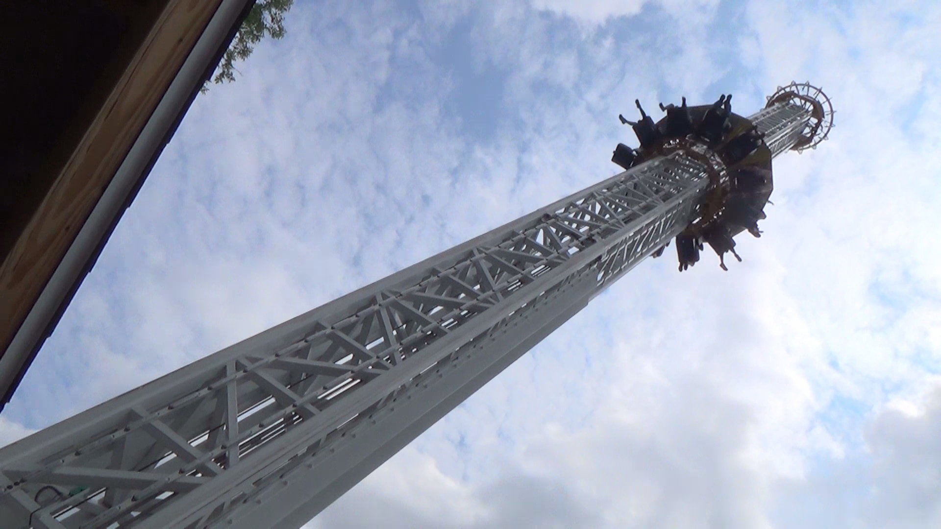 StratosFear, der allem Anschein nach von der Firma Larson International zusammengelötet wurde. Da wir noch auf unseren ersten Ride des Tages warten, nutzen wir die Gunst der Stunde und steigen ohne Wartezeit ein. Hier sitzt man im Dodekagon, sprich Zwölfeck um den Turm, was dafür sorgt, dass man die Nebenmänner und -frauen nicht wirklich sieht, da sie schon leicht seitlich von einem weggeknickt sind. Das sorgt für eine irgendwie interessante Einzelerfahrung. Was aber den viel größeren Unterschied macht, ist die Tatsache, dass der Fall sofort einsetzt, sobald die Gondel den höchsten Punkt erreicht. Kein Anhalten, keine Vorwarnung, nichts. Das spart nicht nur Zeit sondern ist auch ein echter Schocker, weil man nie wissen kann, wann der Fall kommt. Ein Feature dass ich tatsächlich auch dem typischen, wohl auf das Erzeugen von Spannung abzielenden, üblichen Freefall-Programm vorziehen würde. Zudem kommt uns der Fall an sich äußerst intensiv vor. So positiv überrascht lassen wir uns (das) gleich nochmal (ge)fallen und kommen auch später gerne nochmal wieder.