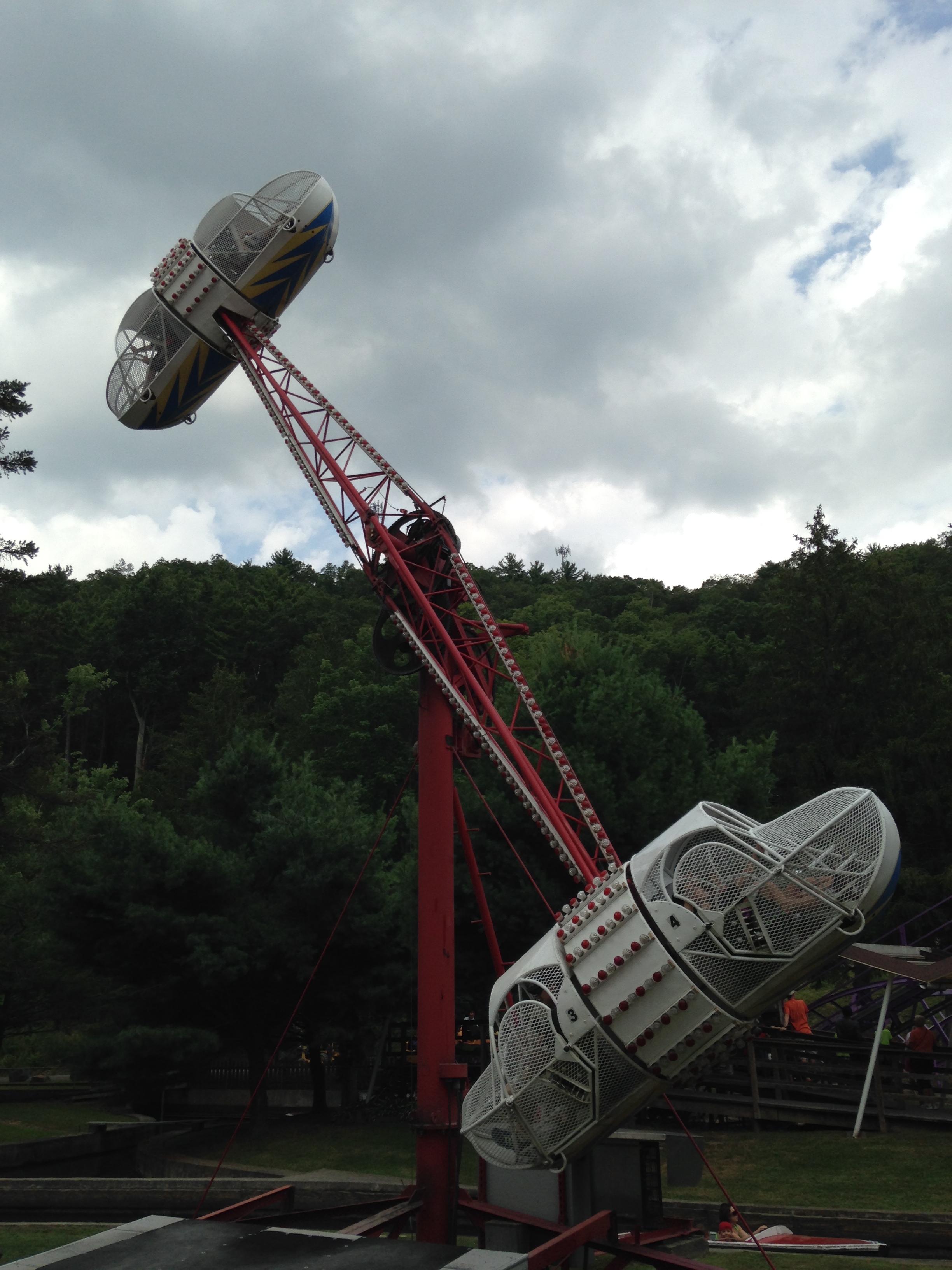Flyer, eines dieser Flugzeug-Karussells, bei denen man mittels eines vorne an der Gondel angebrachten Ruders per Hand das Ausschwingen steuern kann, was hier allerdings nur in Maßen erlaubt ist. Auch dieses Fahrgeschäft hat natürlich schon viele Jahre auf dem Buckel und wurde bereits 1972 von Kennywood in Pittsburg - wohin es uns auch in Bälde noch verschlagen sollte – hergeschafft. Es ist laut Parkhomepage das einzige Modell dieses Attraktionstyps, das im Uhrzeigersinn betrieben wird. Einzigartig! Verrückt! Interessanter finde ich aber, dass dieses Teil nicht etwa von einem Elektromotor angetrieben wird, sondern augenscheinlich von einem Traktormotor! Ich finde nicht viel dazu, weiß jemand mehr? U.a. bei Wikipedia heißt es auch, dass dieser Ride einer der schnellsten seiner Art sei. In jedem Fall ist es hier sehr leicht, große Schwünge zu machen, auch wenn der etwas kautzige alte Mann, der sonst nur seelenruhig auf seinem Plastikstuhl in der Mitte des Rides sitzt und beim Bügel kontrollieren und händischen An- und Abschalten des Motors alle Zeit der Welt hat, dazu neigt, dies per grummeligem Zuruf zu unterbinden. Aber auch die dünnen Stahlseile und die filigrane Konstruktion reagieren darauf schnell mit dem ein oder anderen "Klonk!", was durchaus etwas Respekt einzuflößen vermag. Ein langer Abschnitt für solch einen Ride, aber es stimmt schon, wir hatten mal wieder besonders viel Spaß mit diesem sehr interaktiven Flieger.