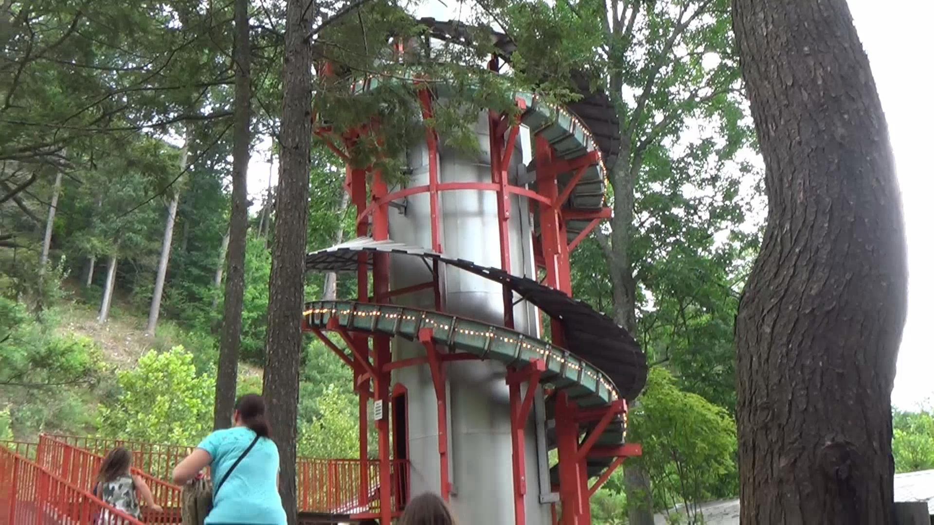 Das muss geändert werden. Vorbei an einer ganz gut besuchten Bühne mit stimmungsvoller Live-Musik im Stile eines Musikvereins durchqueren wir nach kurzer spontaner Tanz-Video-Selfie-Einlage (Tvelfie™) eine von saftigen Blättern überdachte und von einem breiten Wasserkanal zweigeteilte Ansammlung von Kiddie-Attraktionen. Dabei lassen wir es uns natürlich nicht entgehen, eine wieder mal äußerst klassische Spiralrutsche, namentlich Sky Slide zu berutschen.