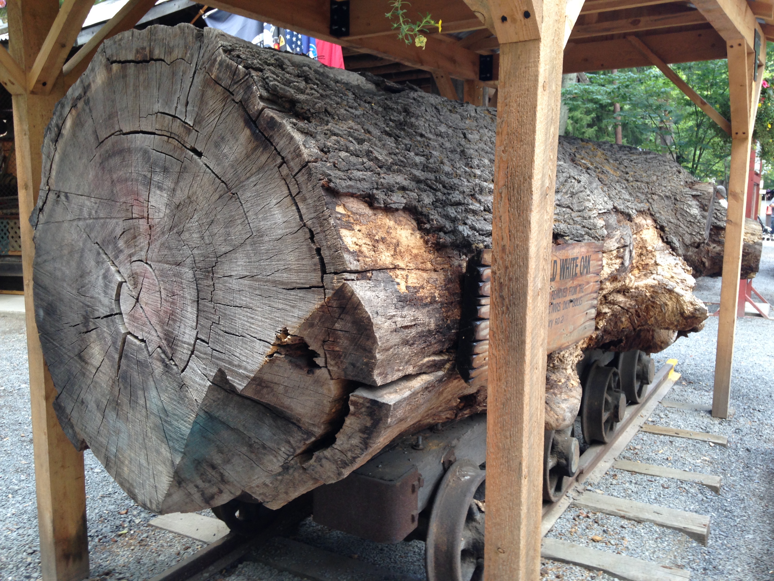 Der monströse Stamm einer 220 Jahre alten Eiche (die seit dem Aufstellen des Schildes sicher noch etwas älter geworden ist) rundet auf einem Minenwagen liegend dieses friedliche Fleckchen perfekt ab.