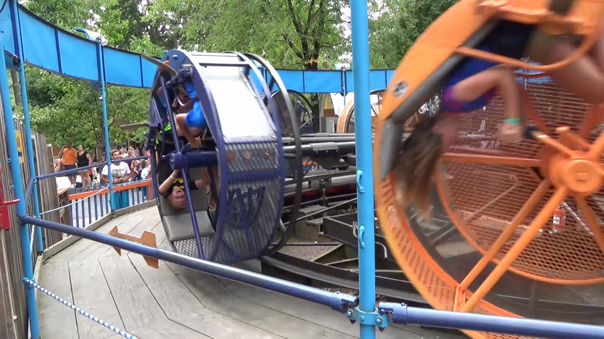 First Drop beschreibt eine Kehrtwende hin zur Rückseite der Bahn, wo das Parkgelände nahtlos und ohne Zäune oder ähnliches ins dazugehörige Camping-/Ferienhütten-Areal übergeht, das schönerweise kaum bis gar nicht gerodet ist. Aber wir sitzen hier in einer Achterbahn, also interessiert das gerade nicht, insbesondere weil es jetzt ein beträchtliches Stück abwärts geht. Die folgende, stattliche Fahrtzeit verbringen wir in engem Kontakt mit entweder den seitlichen Wänden des Zuges oder miteinander, besonders im Signatur- und mutmaßlich namens-gebenden Element, einer auf einer schräg gestellten Ebene liegenden Hochgeschwindkeits-540+°-Spirale um den Stationsbereich würde eine schmale Person sicher hier und da noch einen Sitzplatz im linken Teil des Zuges finden können.