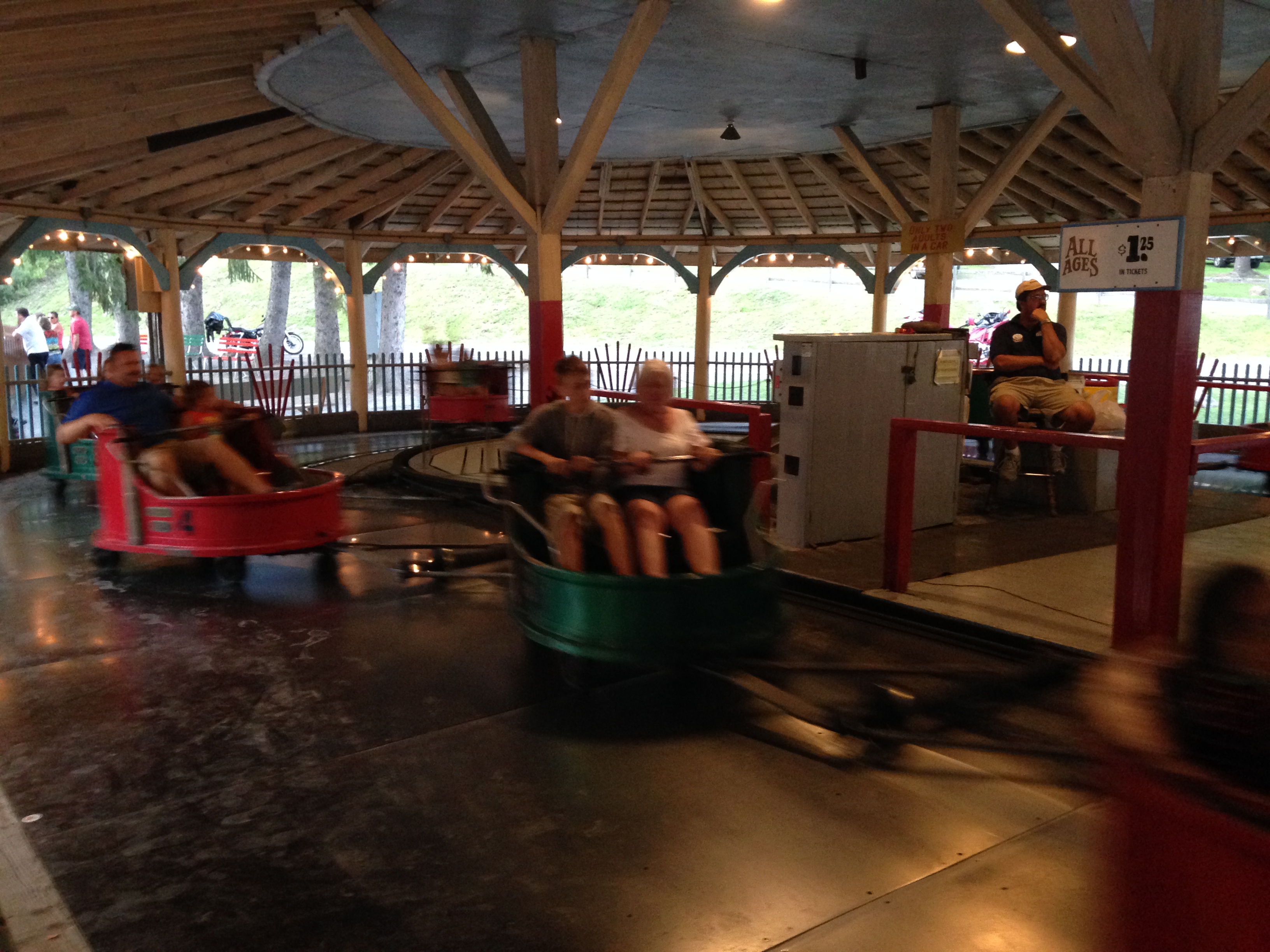 Tilt-A-Whirl mit - der darf hier natürlich nicht fehlen. Diese Dinger gehören auf unserer Tour sicherlich zu den meistgefahrenen Nicht-Achterbahnen. Schade eigentlich, dass es diese in Deutschland nicht oder zumindest nicht in der hier typischen Intensität gibt. Meine ersten und besten Fahrten auf einem solchen Spaßbringer hatte ich allerdings 2006 im Flamingo-Land, England. Deutsche Exemplare wie in Tripsdrill oder zumindest früher mal im Panorama Park sind da meiner Erfahrung nach deutlich träger und weniger drehfreudig.