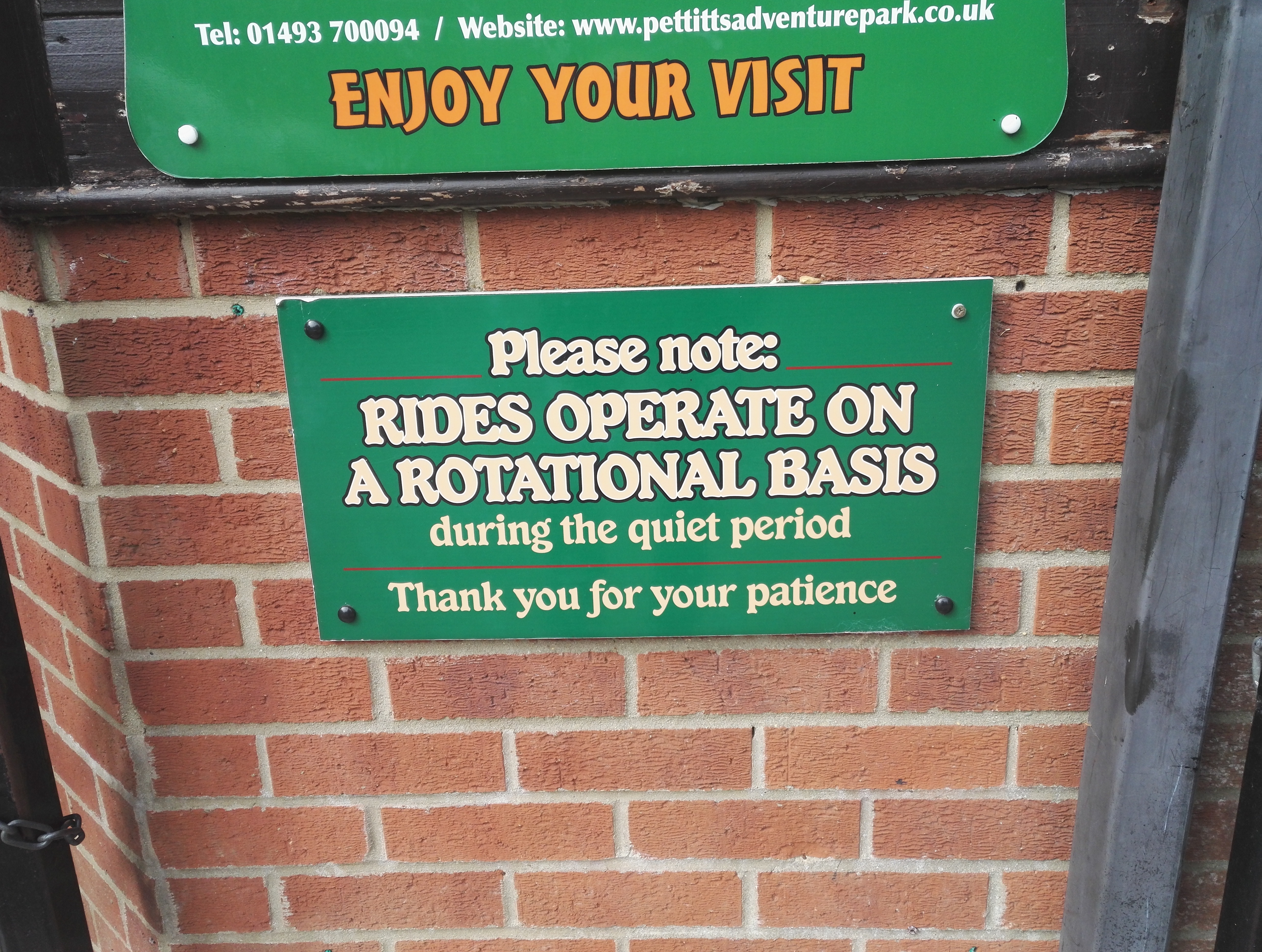 Ein Schild am Eingang verweist auf die Tatsache, dass die Fahrgeschäfte im Wechsel betrieben werden. Wir fragen die ältere Dame, die das Kassenhäuschen einsatzfähig macht: "Is the rollercoaster operating today?" - Einen Satz, den wir noch des öfteren zum Einsatz bringen werden während unserer Tour.