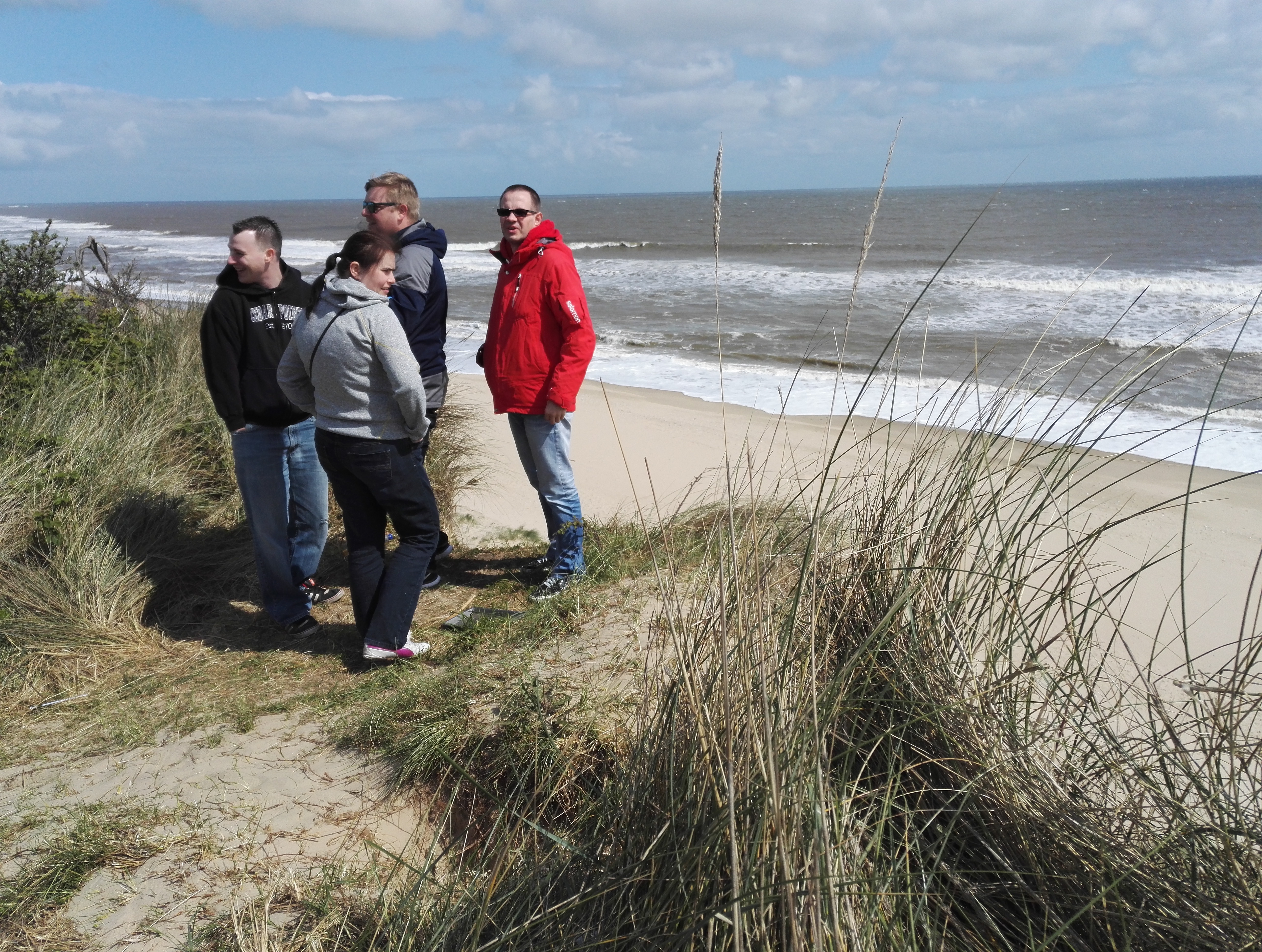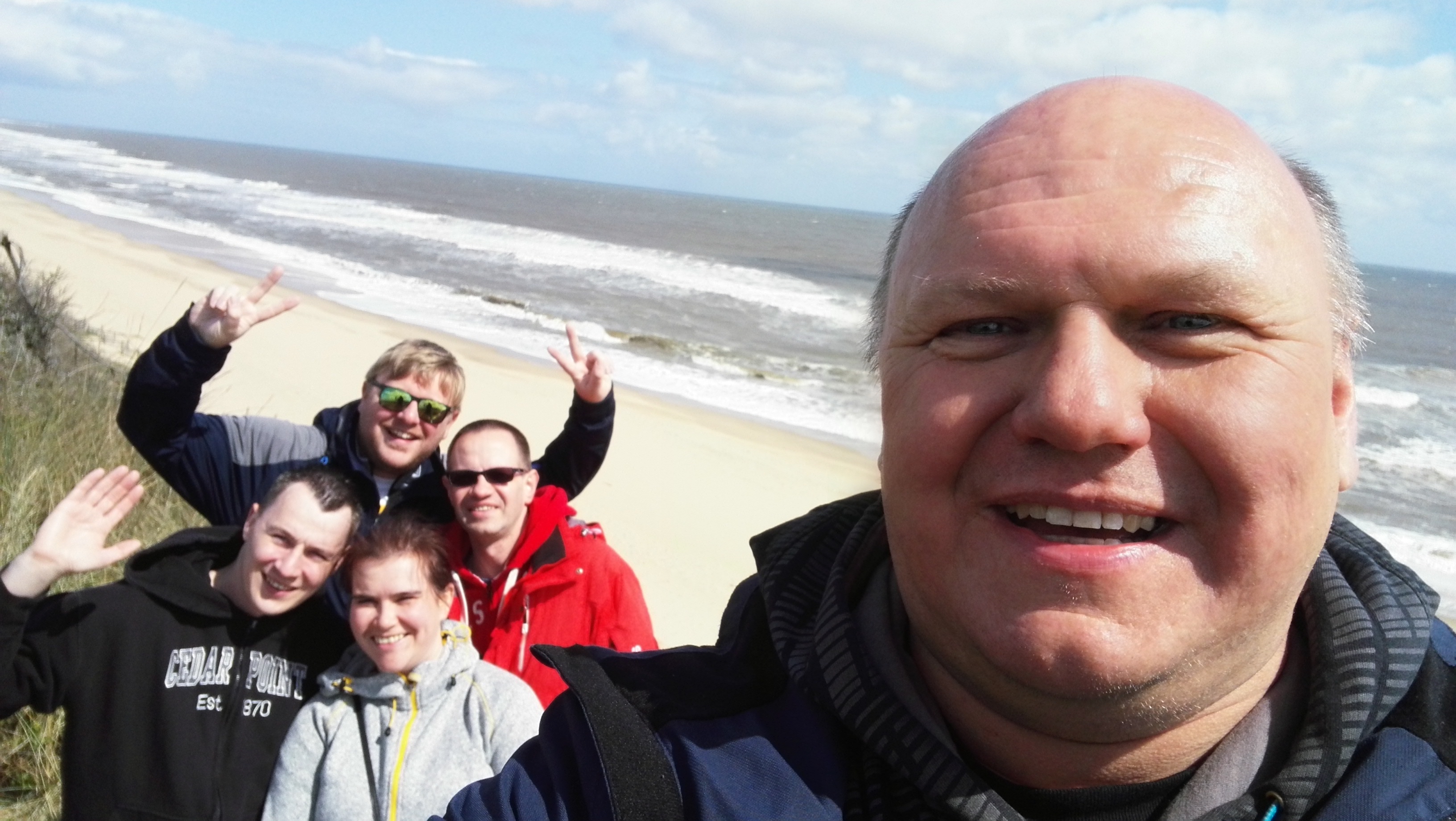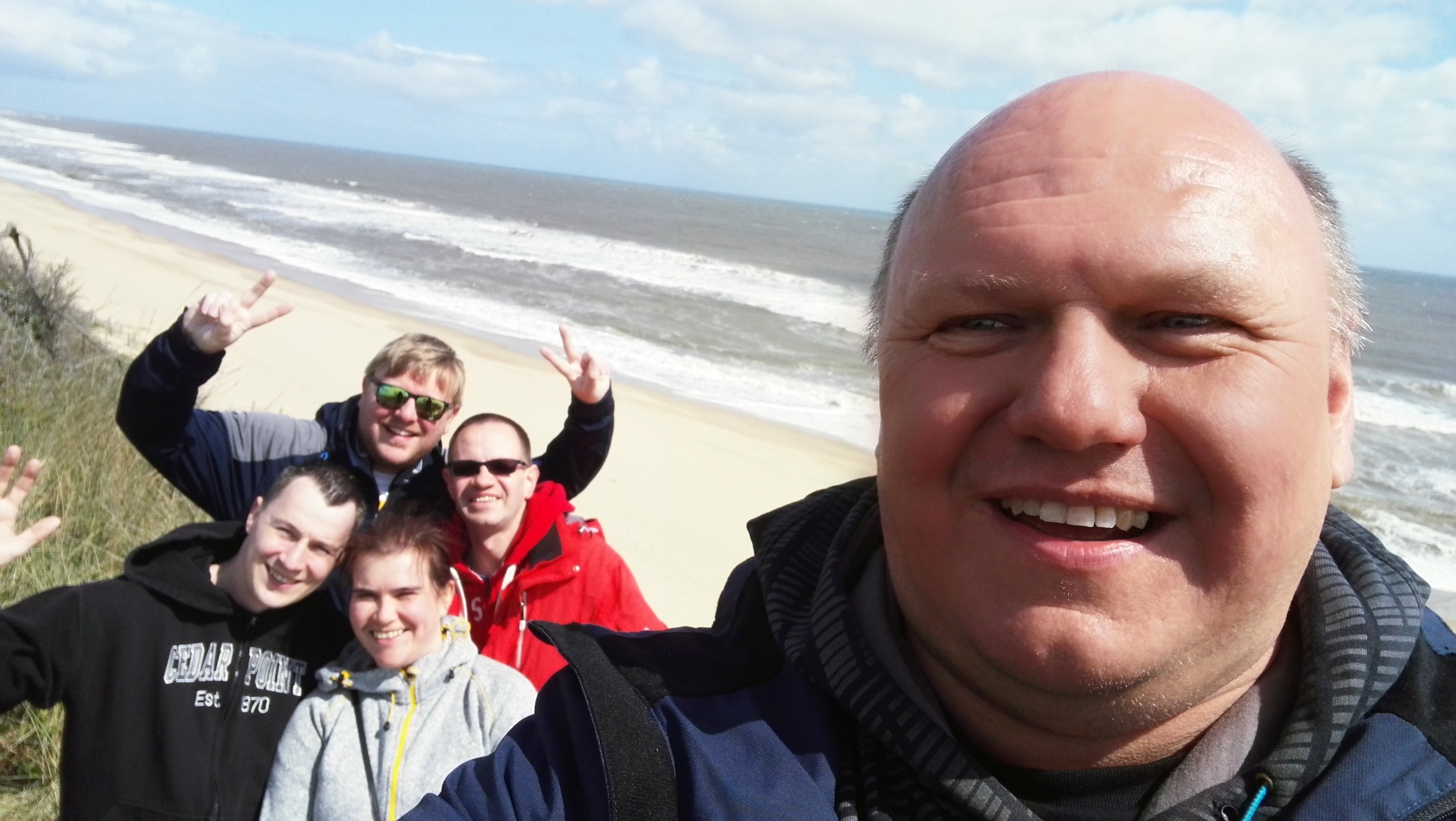 Wir zwacken von Volkers engem Zeitplan einen kleinen Strandspaziergang ab und nutzen die Zeit für ein Gruppen-Strand-Foto.