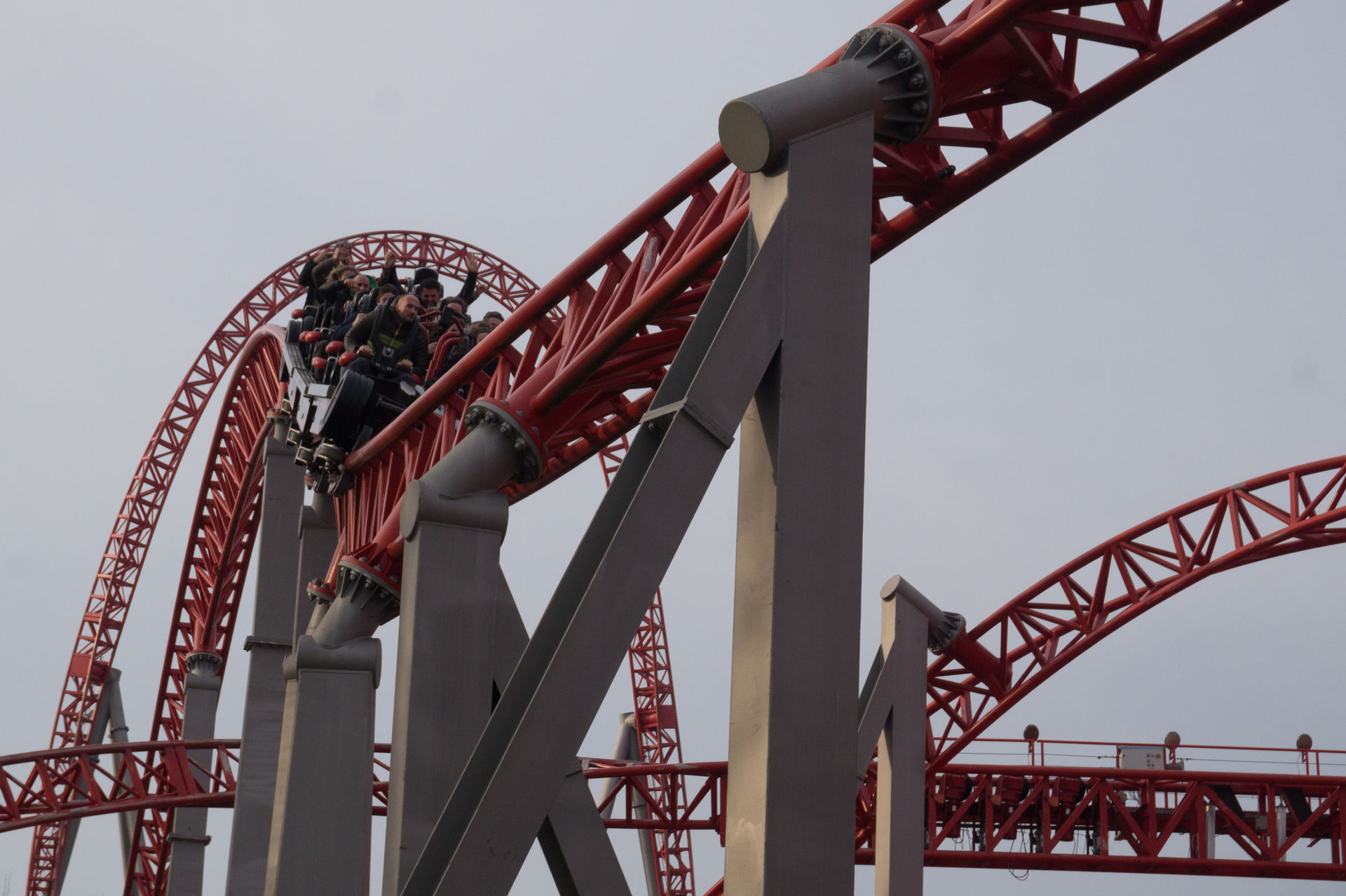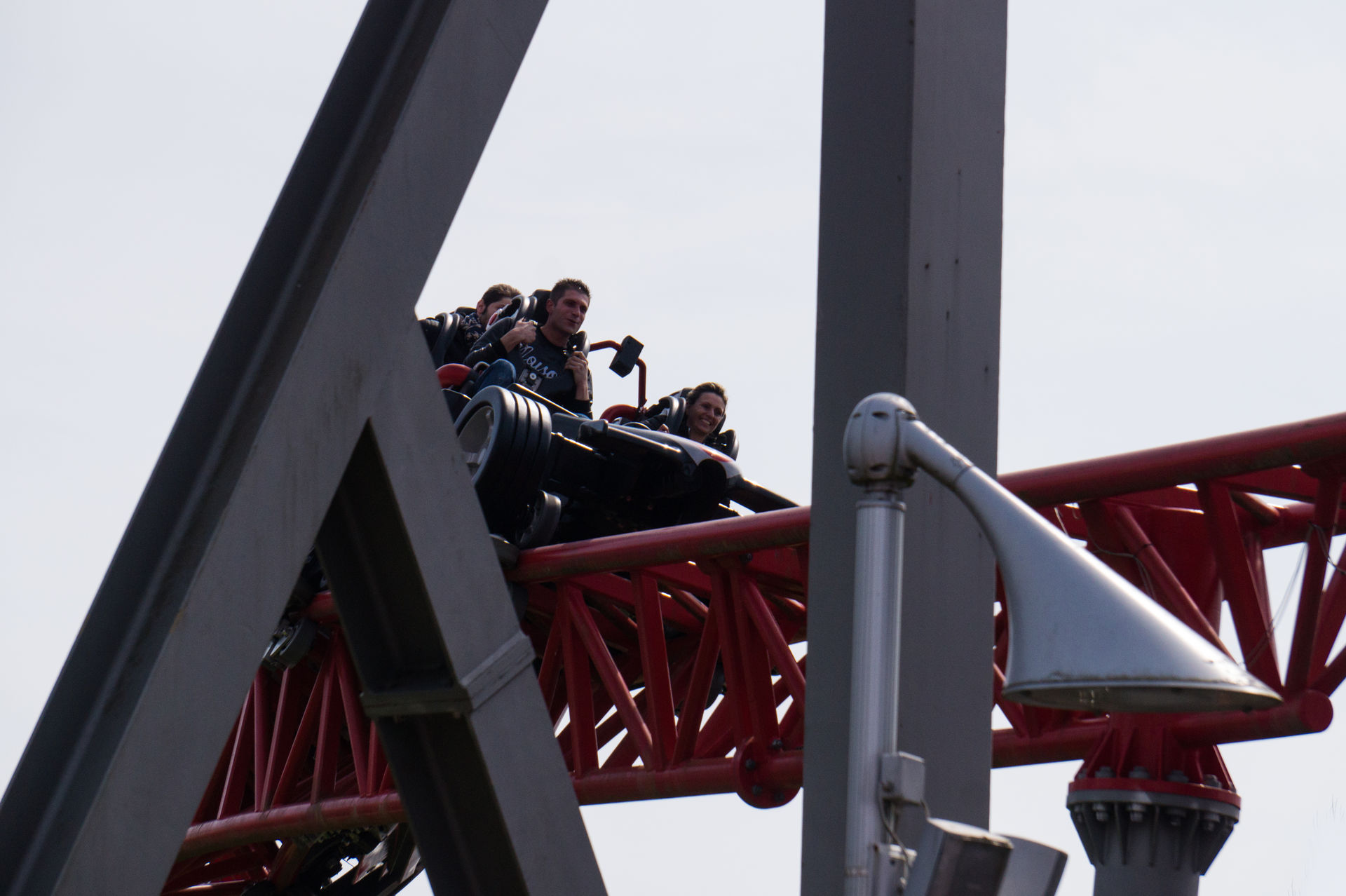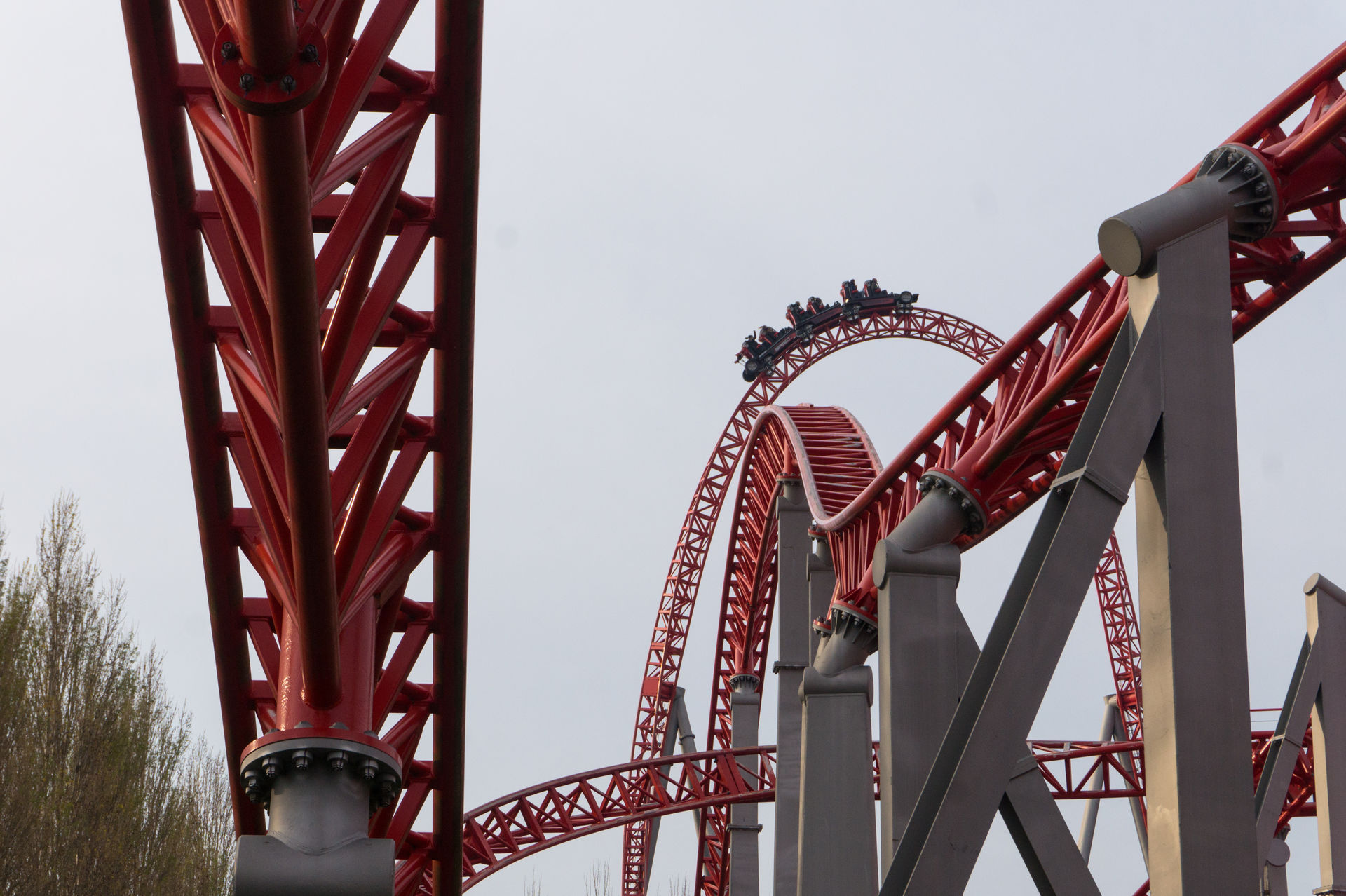Bereits aus der Warteschlange der Achterbahn Katun konnten wir beobachten, dass die benachbarte Achterbahn Max Adventures Master Thai einen technischen Defekt hat und dementsprechend evakuiert wurde. Auch eine Stunde später war von einer Wiedereröffnung der Anlage nichts abzusehen, sodass wir uns in Richtung des markanten Wahrzeichens des Parks begaben. Auch beim 90m hohen Riesenrad Eurowheel erwartete uns eine lange und vor allem zähe Warteschlange. Doch eine Fahrt auf dem ehemals höchsten Riesenrad in Europa wollten wir uns aus lauter Lustlosigkeit noch irgendwo anders hinzugehen und dort genauso ewig zu warten nicht nehmen. Wie zu erwarten wurden beim Riesenrad nur die Hälfte der Gondeln bestückt, wodurch wir sehr viel Zeit hatten die unkonventionelle Stützkonstruktion des Riesenrads genauer anzusehen. Während der Fahrt konnten wir neben der Aussicht auf den Park noch die Hot Wheels Stunt Show von oben betrachten, dessen Finale aus der Durchfahrt eines riesigen Loopings bestand.