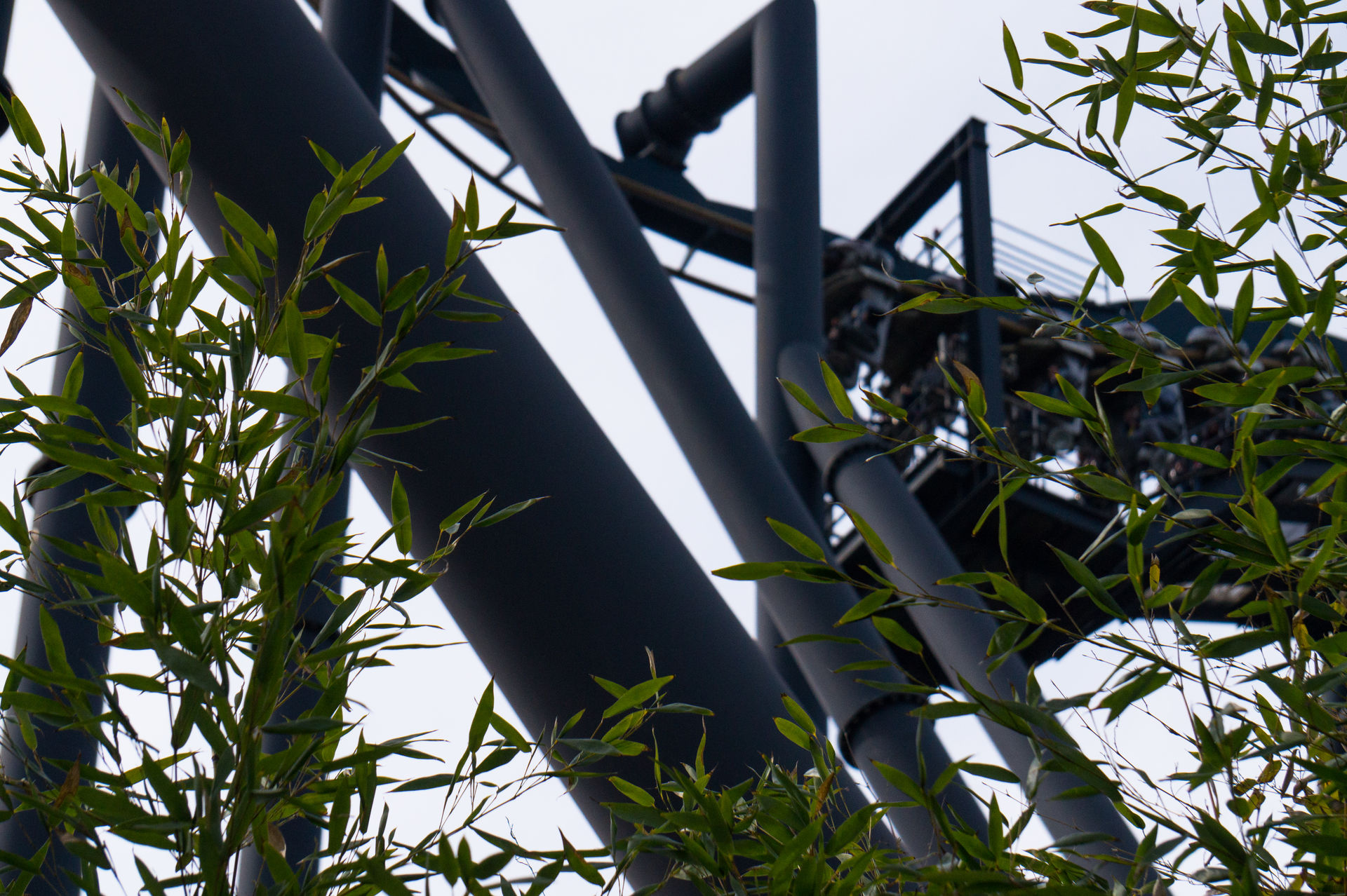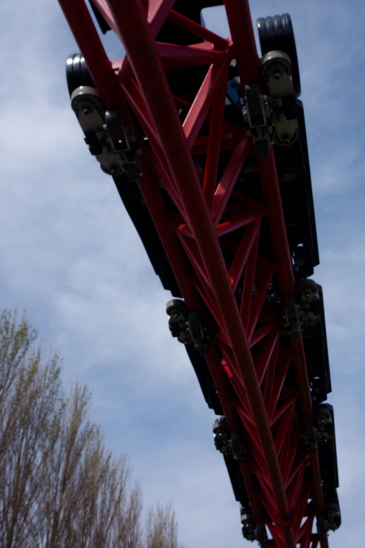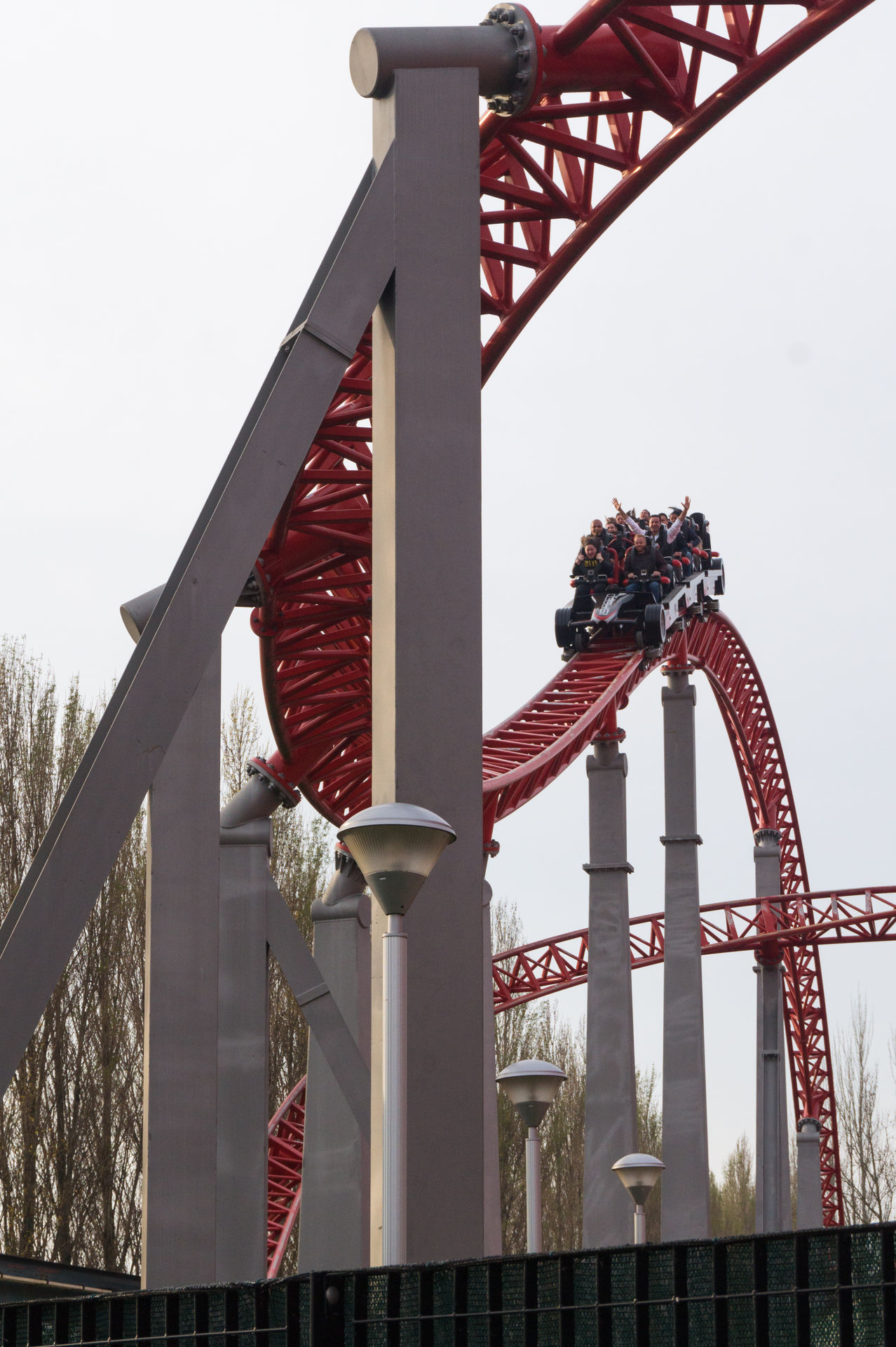 Bereits aus der Warteschlange der Achterbahn Katun konnten wir beobachten, dass die benachbarte Achterbahn Max Adventures Master Thai einen technischen Defekt hat und dementsprechend evakuiert wurde. Auch eine Stunde später war von einer Wiedereröffnung der Anlage nichts abzusehen, sodass wir uns in Richtung des markanten Wahrzeichens des Parks begaben. Auch beim 90m hohen Riesenrad Eurowheel erwartete uns eine lange und vor allem zähe Warteschlange. Doch eine Fahrt auf dem ehemals höchsten Riesenrad in Europa wollten wir uns aus lauter Lustlosigkeit noch irgendwo anders hinzugehen und dort genauso ewig zu warten nicht nehmen. Wie zu erwarten wurden beim Riesenrad nur die Hälfte der Gondeln bestückt, wodurch wir sehr viel Zeit hatten die unkonventionelle Stützkonstruktion des Riesenrads genauer anzusehen. Während der Fahrt konnten wir neben der Aussicht auf den Park noch die Hot Wheels Stunt Show von oben betrachten, dessen Finale aus der Durchfahrt eines riesigen Loopings bestand.