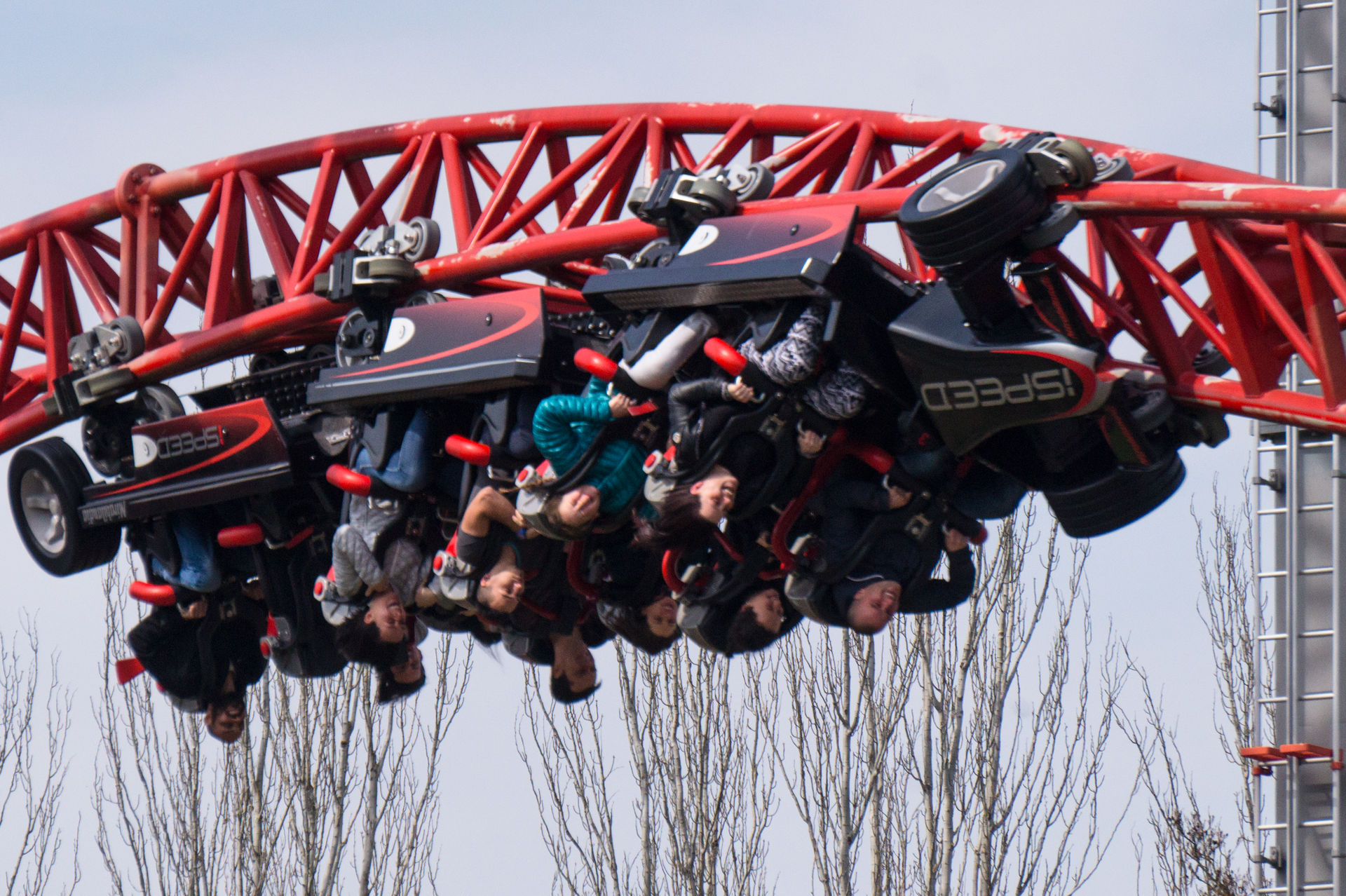 LSM Achterbahn iSpeed, denn sobald man endlich die Treppen zur Station erreicht hat geht es auch bereits recht schnell voran. Einmal im Zug Platz genommen und die Bügel geschlossen wird der Zug alsbald leicht nach vorne geschoben, ehe der Impuls aufgegriffen wird und der Zug nun immer stärker beschleunigt. Nun geht es einen Top-Hat vertikal empor, ehe man diesen mit einer tollen Aussicht auf die Wildwasserbahn Autosplash überquert. Nun stürzt man sich vertikal gen Boden, vollzieht dabei noch eine kurze Rechtsdrehung und passiert sehr druckvoll das erste Tal, in dem man zudem eine S-Kurvenkombination unterhalb der Abschussstrecke vollführt. Parallel zur Station überquert man nun einen Hügel, bei dem man ordentlich aus dem Sitz gehievt wird. Schwungvoll vollführt man nun eine weitere S-Kurve, die in einer engen Rechtskurve übergeht. Auf dem nachfolgenden Hügel folgt ein gemächlicher Umschwung, welcher einen in eine leichte Linkskurve oberhalb der Station entlässt. Ganz plötzlich wird dann ein