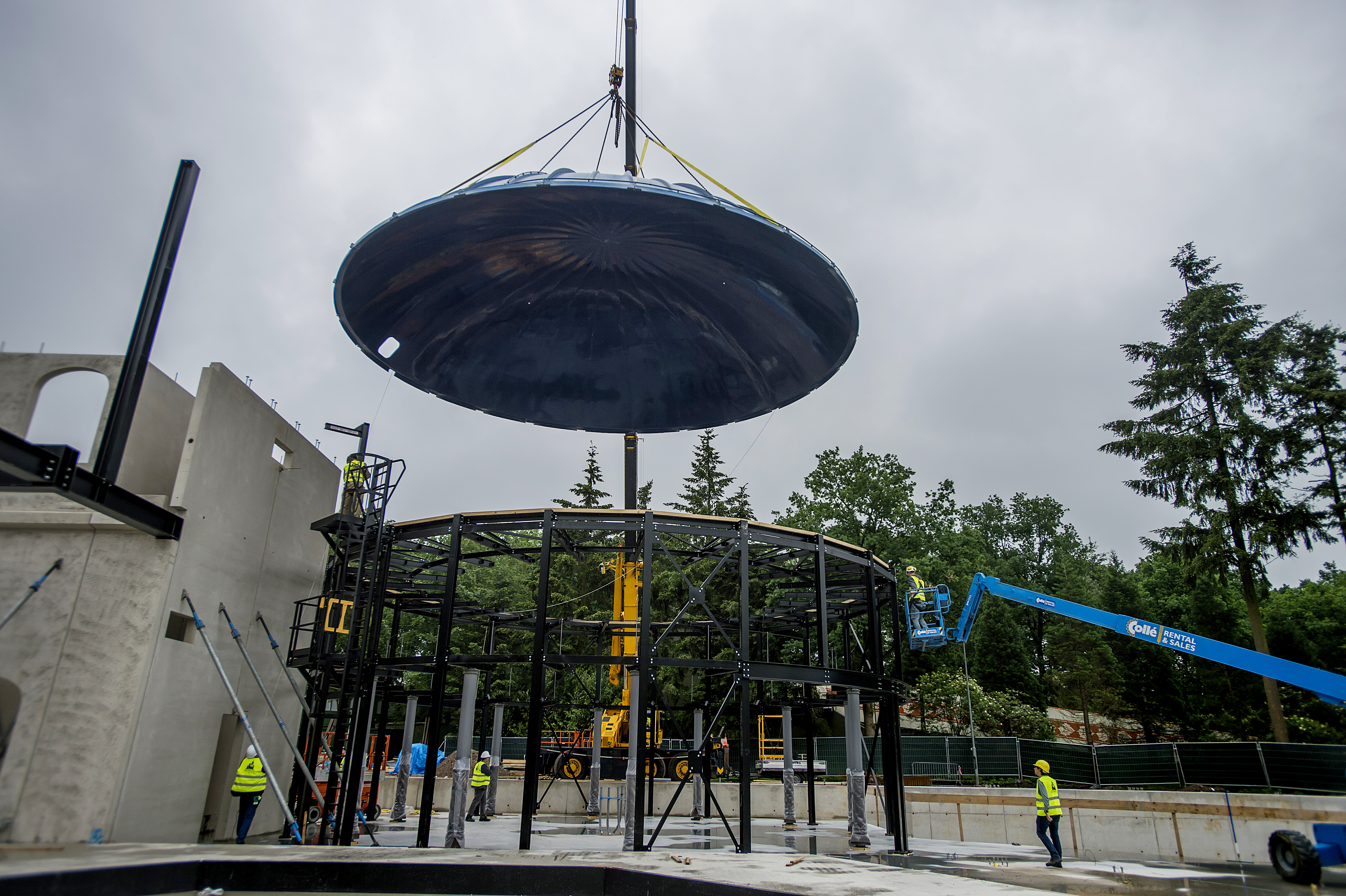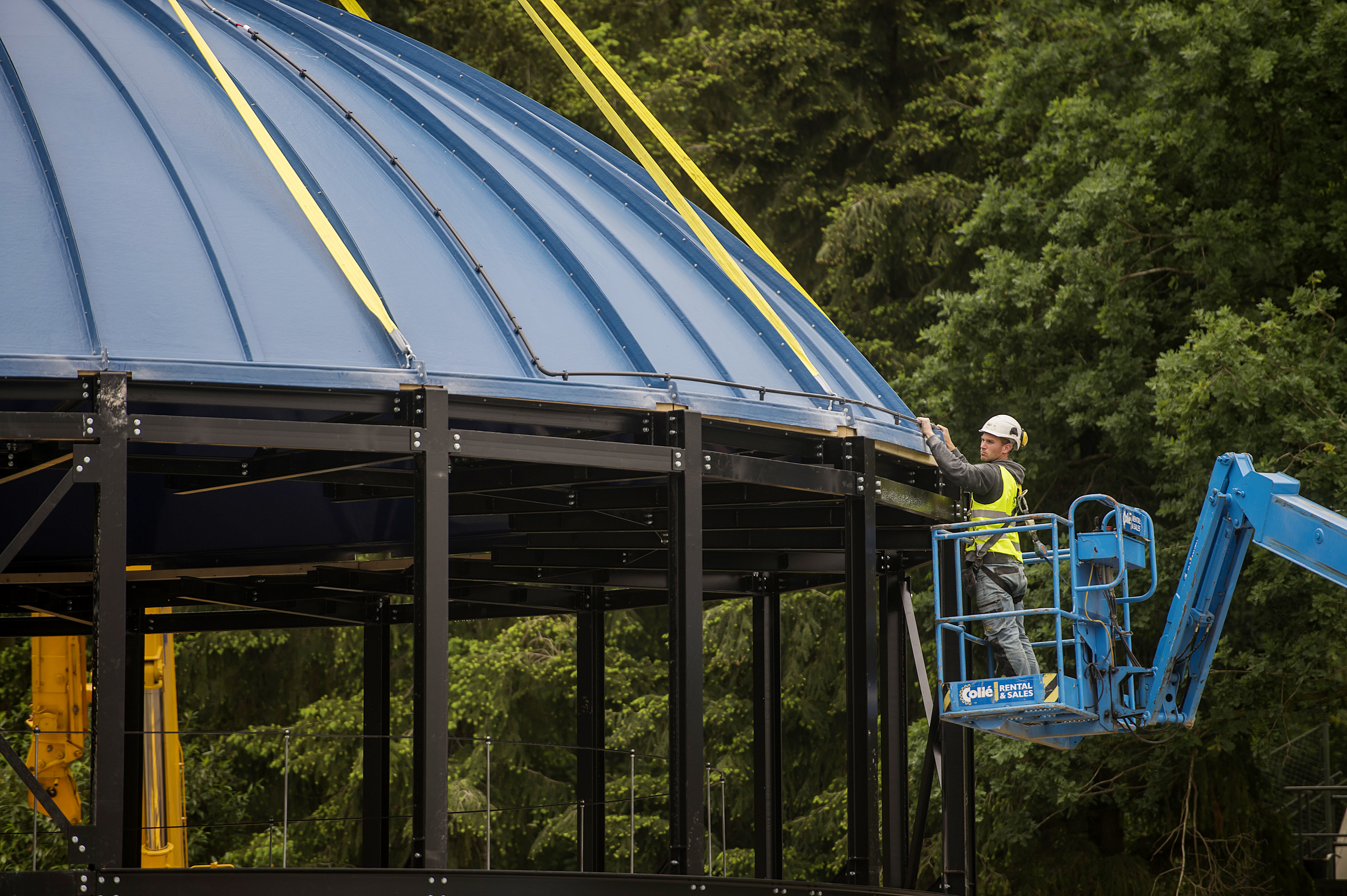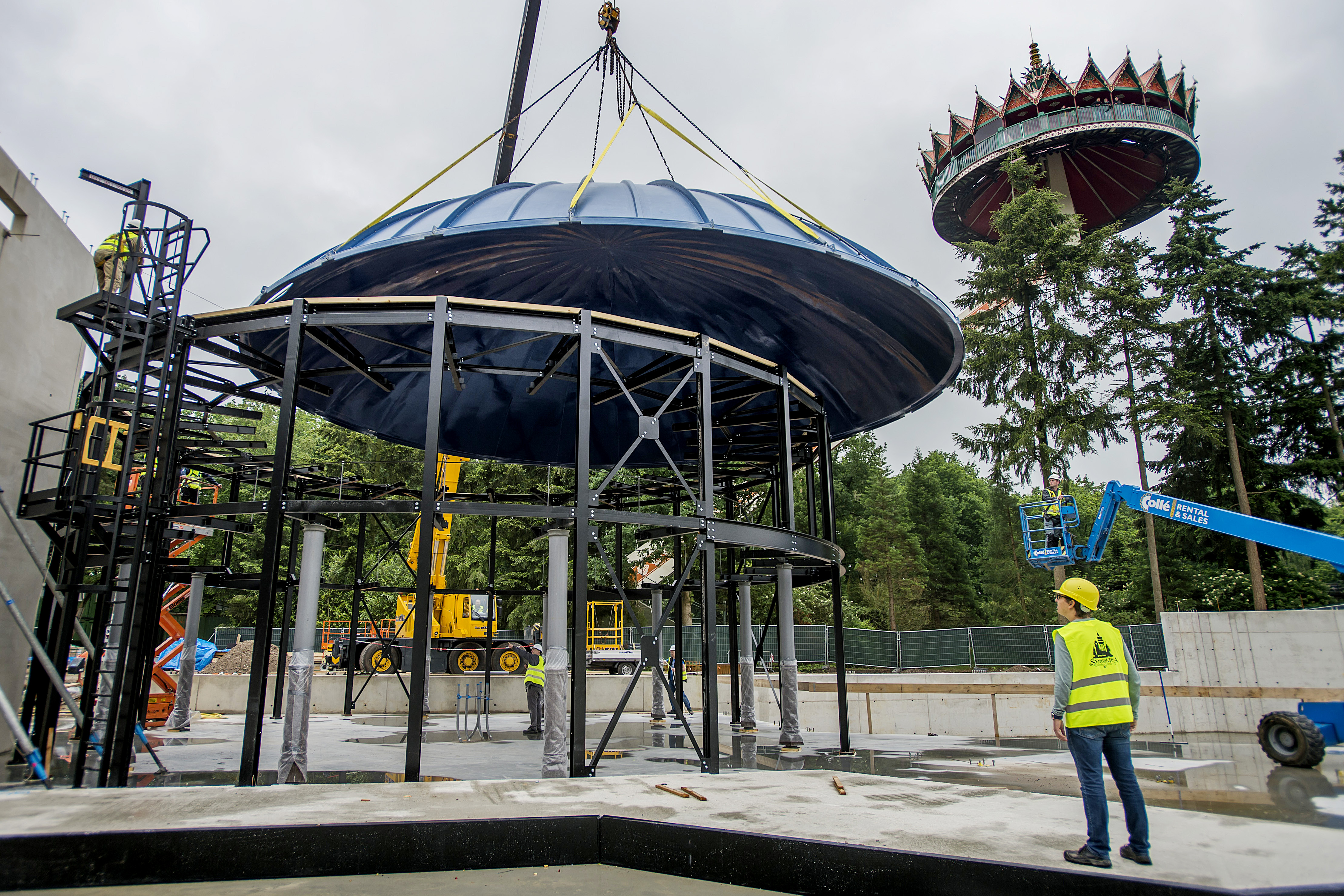 Kaatsheuvel/NL. Im kommenden Jahr eröffnet der Freizeitpark Efteling mit Symbolica seine bisher größte Attraktion. Die Bauarbeiten an der neuen überdachten Themenfahrt gehen stetig voran. Am Freitag wurde auf einer sechs Meter hohen Stahlkonstruktion eine 14 Meter breite und gut drei Meter hohe Kuppel platziert. Sie gehört zu den Highlights, die Besucher ab dem Sommer 2017 bei einer Fahrt durch den „Palast der Fantasie“ erleben können.