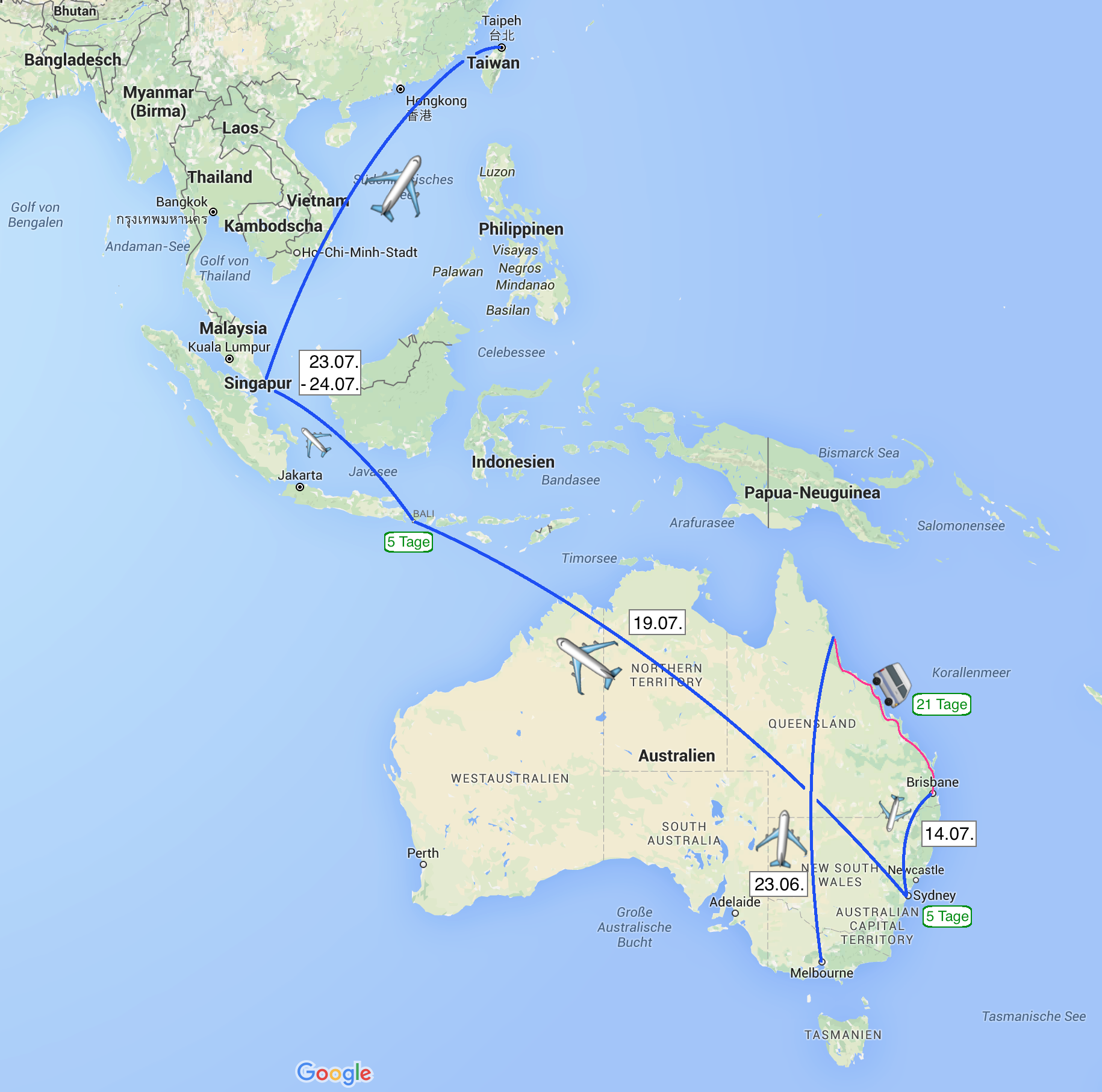 ich befinde mich derzeit auf Grund eines Auslandssemesters in Melbourne Australien. Da hier das Semester nächste Woche beendet ist, in Deutschland das neue Semester aber erst zum 1. Oktober beginnt, habe ich einige Zeit zum Rumreisen. Momentan plane ich aber irgendwann Mitte August wieder nach Deutschland zu fliegen.