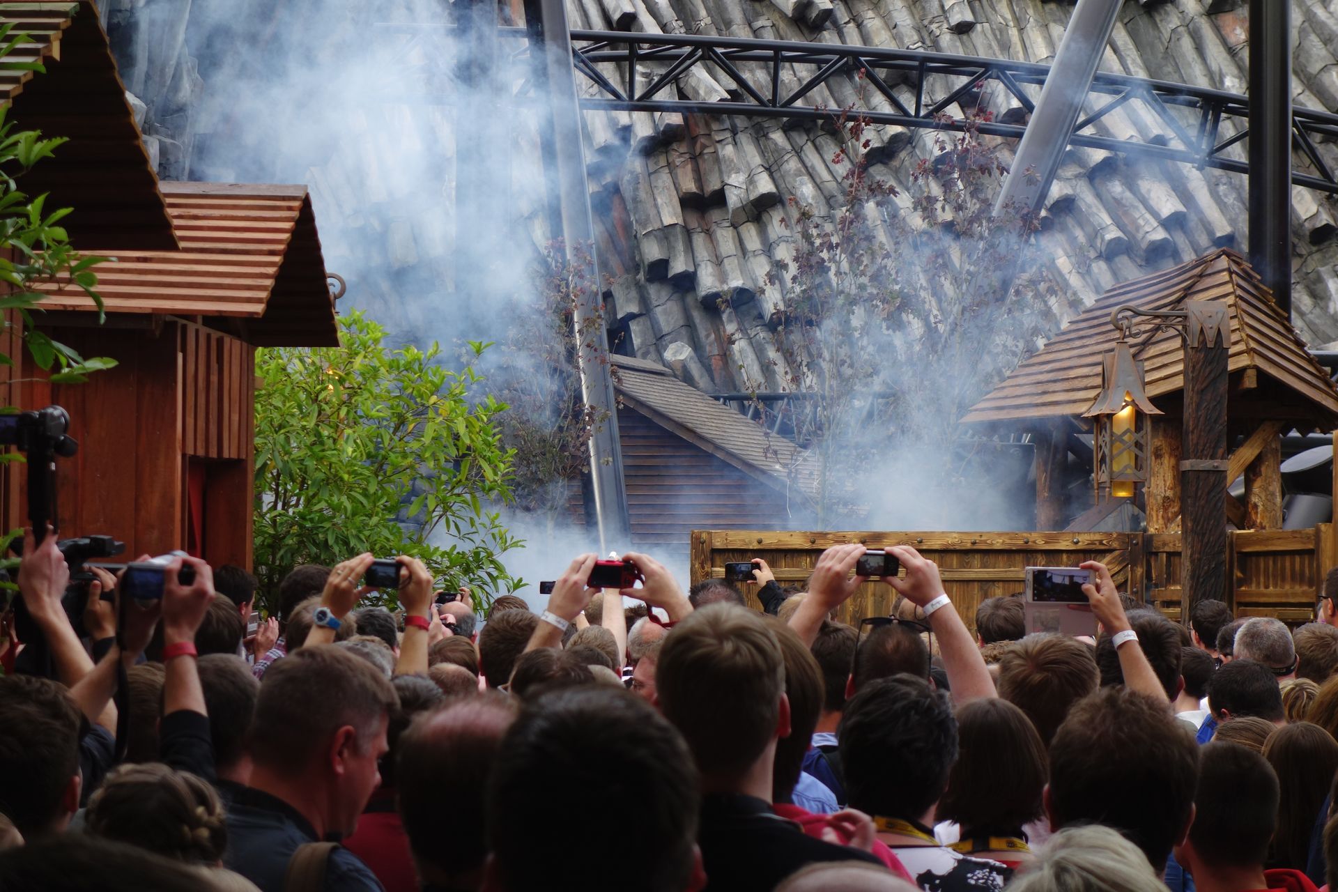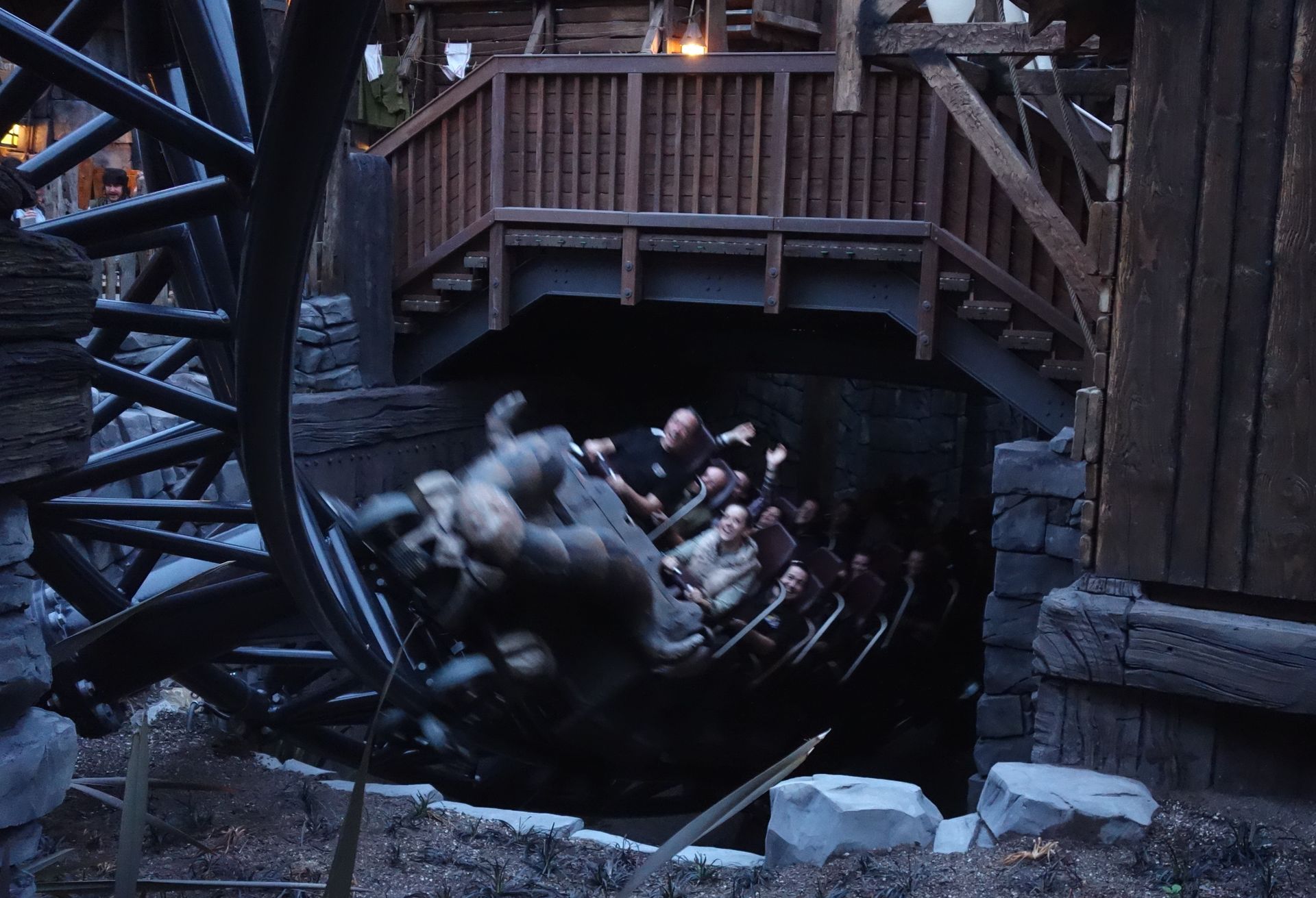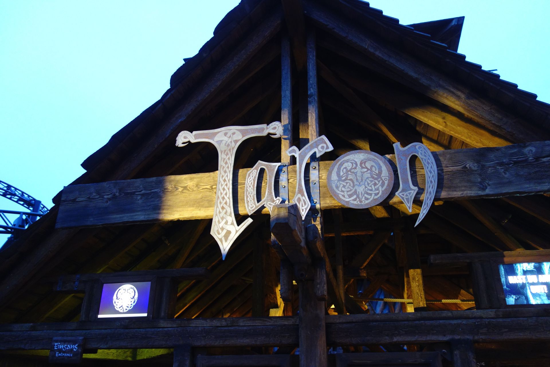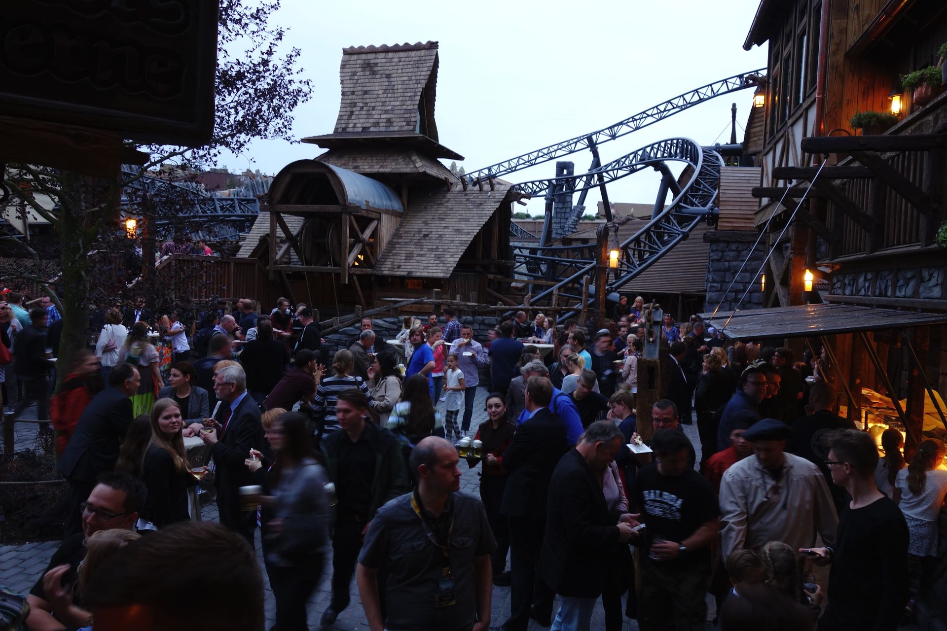 Wie angekündigt wurde um kurz nach halb Acht endlich Taron eröffnet. Da die Besucher sich auf dem nicht gerade kleinen Areal doch schon ziemlich verteilt hatten, hatte das Phantasialand auf eine persönliche Ansprache verzichtet. Stattdessen dröhnte die von anderen Ansagen im Phantasialand bekannte männliche Stimme aus den Lautsprechern des gesamten Bereichs, zählte noch einmal kurz die wichtigsten Fakten zu Klugheim und Taron auf und verkündete schließlich, dass Taron hiermit offiziell eröffnet sei. Anschließend strömten die Wartenden endlich in den eigentlichen Wartebereich und wenig später donnerte auch schon der erste Zug über die Strecke. Allerdings ohne die eben erst hereingestürmte Meute, dafür mit etwas Prominenz an Bord, deren Gesichter wir von unserem Platz vor Raik perfekt einsehen konnten.