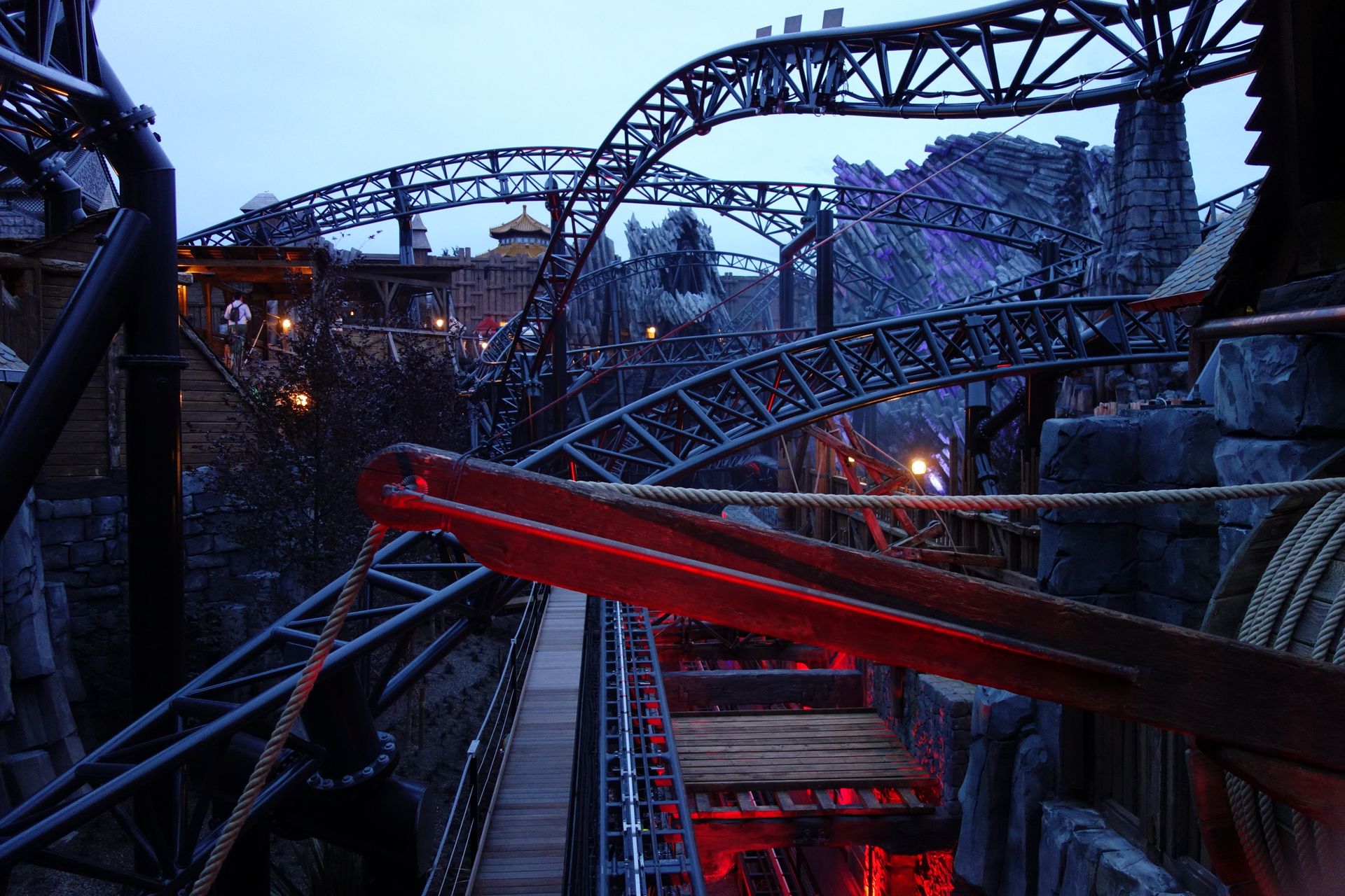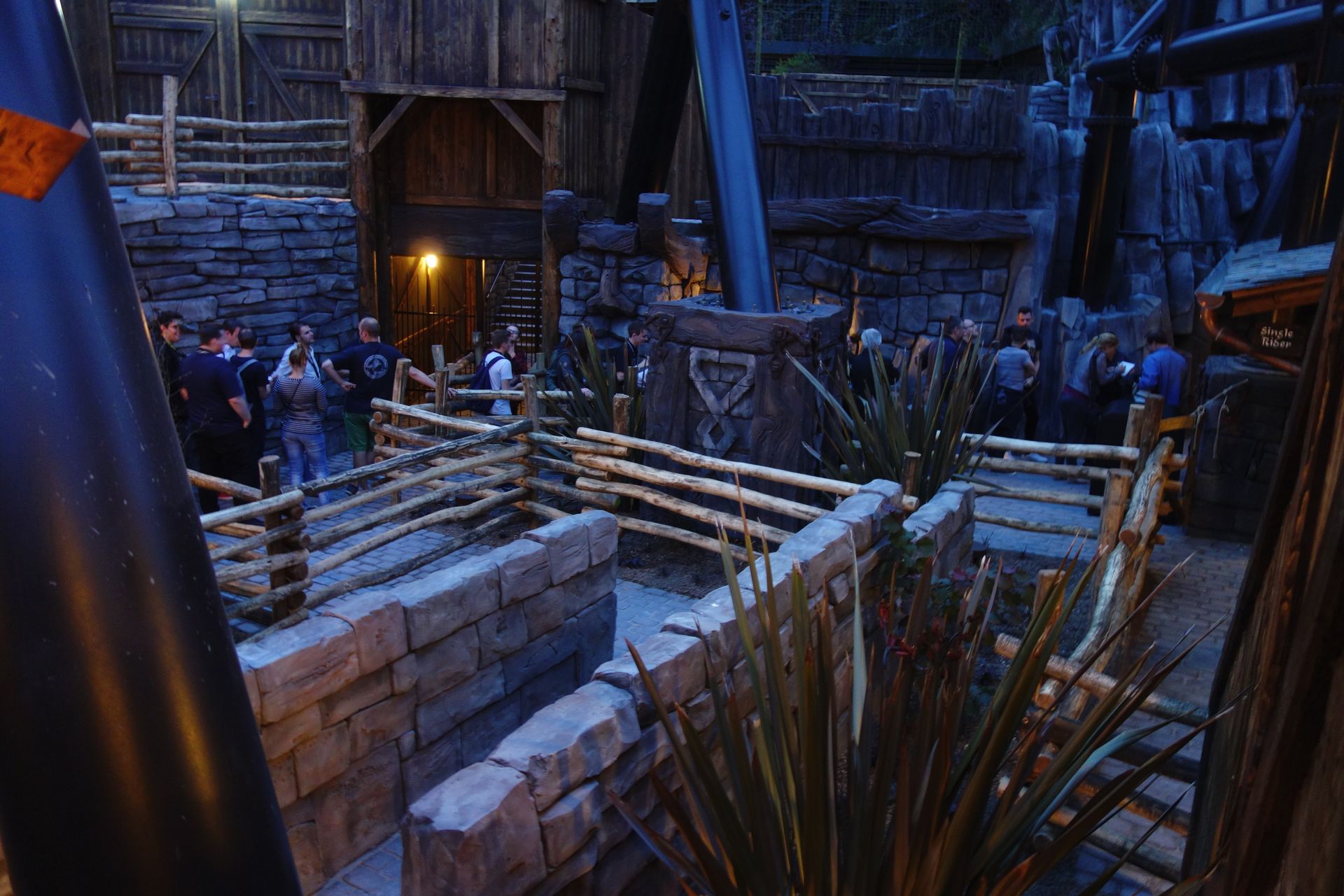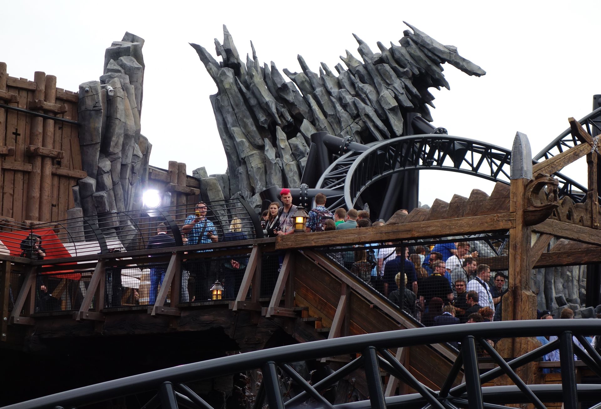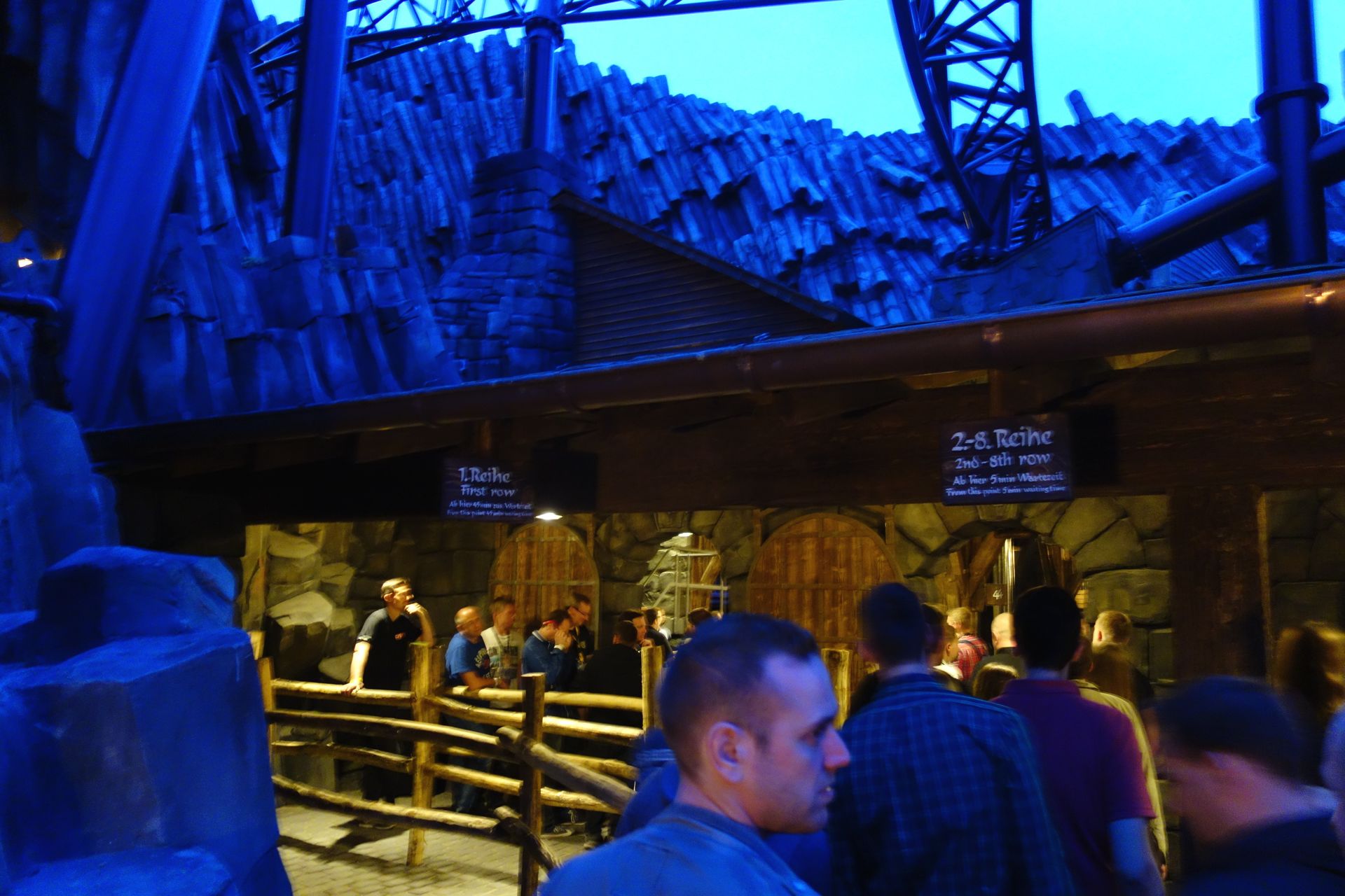 Der Eingang zu Taron befindet sich am Ende der großen Brücke in einem turmartigen Gebäude. Damit sich die ungeduldige Meute geordnet vor dem noch geschlossenen Wartebereich verteilen konnte, hatte man die Brücke per Seil zweigeteilt. So führte die Warteschlange recht bald auf der einen Seite die gesamte Brücke hinauf und auf der anderen wieder hinunter. Das hatte auch ich so erwartet und die Möglichkeit dort ganz vorne zu stehen als eher gering eingestuft. Daher schwamm ich etwas gegen den Strom und begab mich zusammen mit Caruso direkt zur etwas kleineren Familienbahn Raik, wo wir dann auch tatsächlich den Anfang der Schlange bilden konnten.
