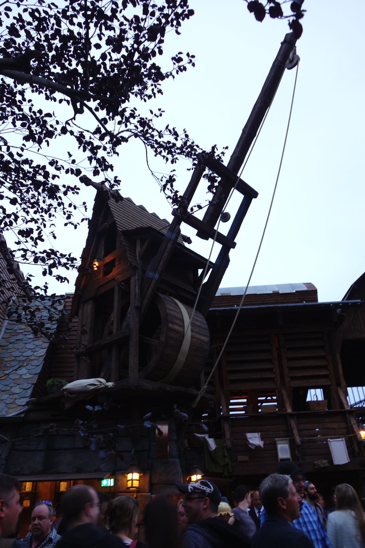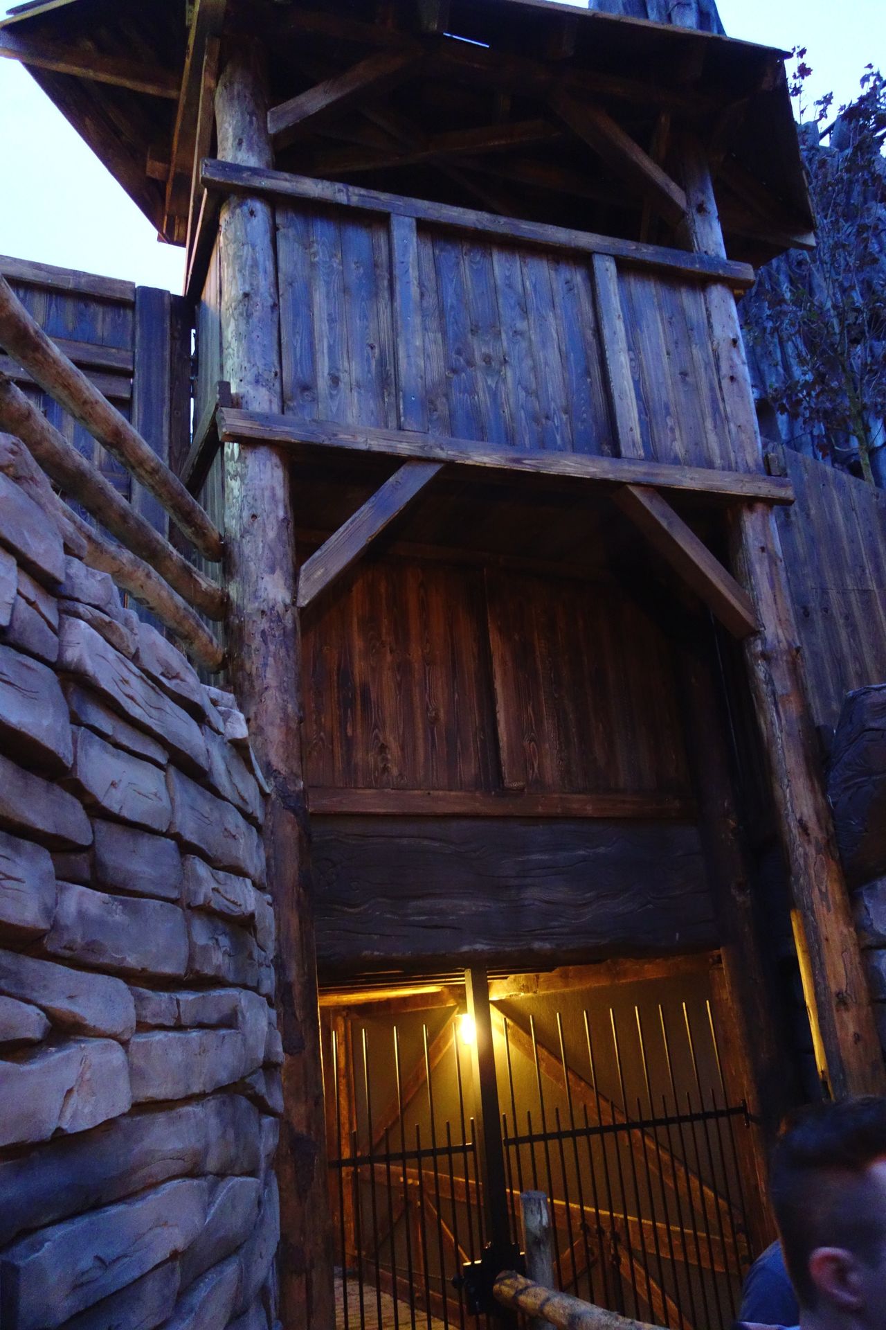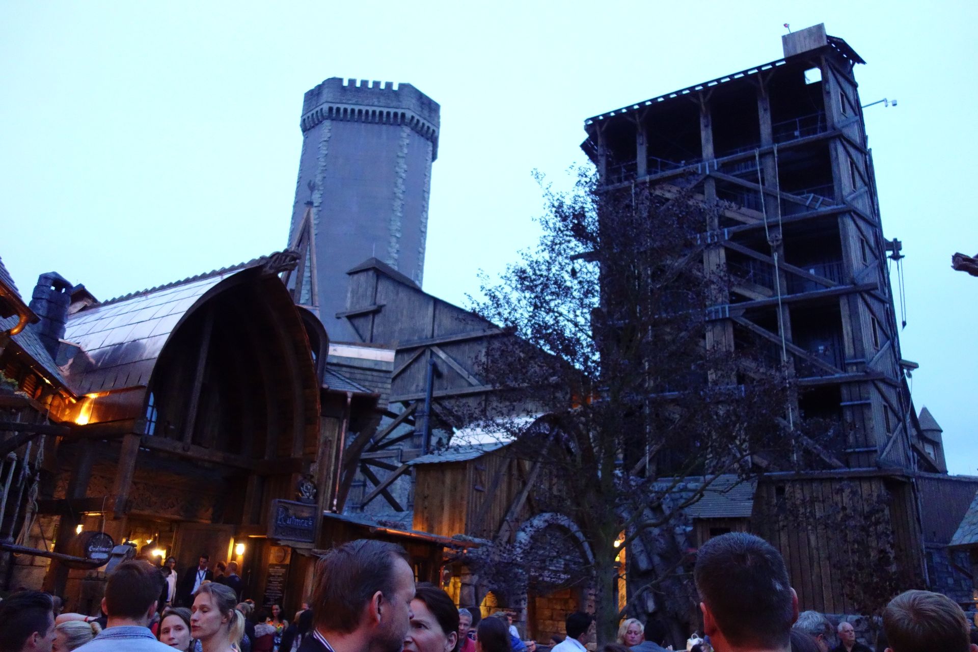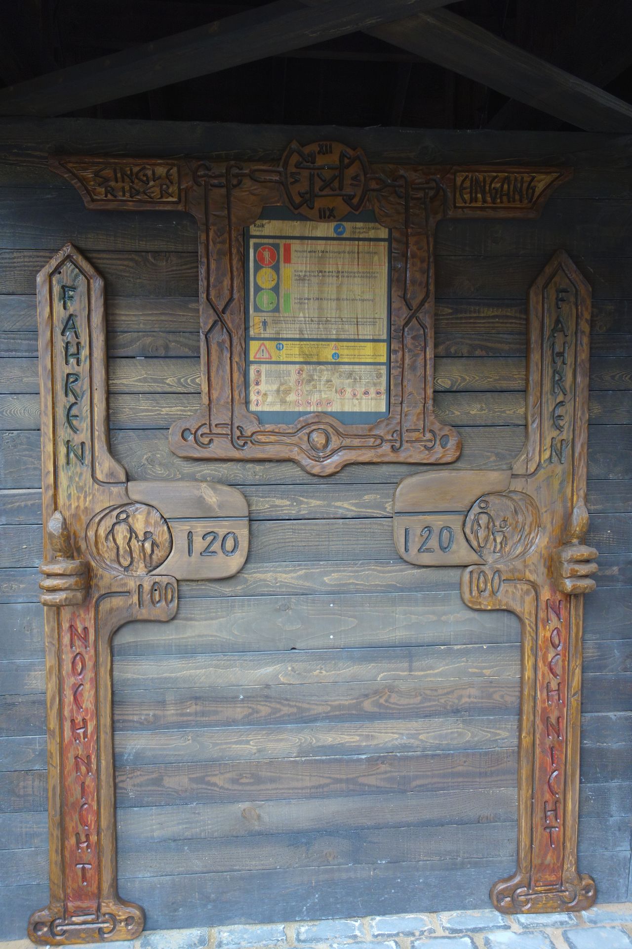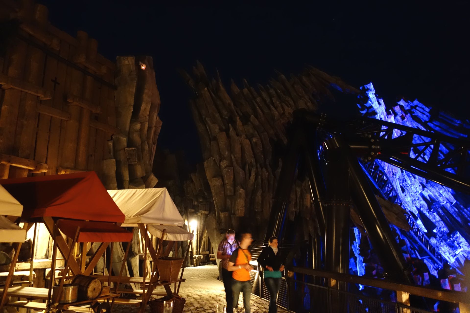 Der Eingang zu Taron befindet sich am Ende der großen Brücke in einem turmartigen Gebäude. Damit sich die ungeduldige Meute geordnet vor dem noch geschlossenen Wartebereich verteilen konnte, hatte man die Brücke per Seil zweigeteilt. So führte die Warteschlange recht bald auf der einen Seite die gesamte Brücke hinauf und auf der anderen wieder hinunter. Das hatte auch ich so erwartet und die Möglichkeit dort ganz vorne zu stehen als eher gering eingestuft. Daher schwamm ich etwas gegen den Strom und begab mich zusammen mit Caruso direkt zur etwas kleineren Familienbahn Raik, wo wir dann auch tatsächlich den Anfang der Schlange bilden konnten.