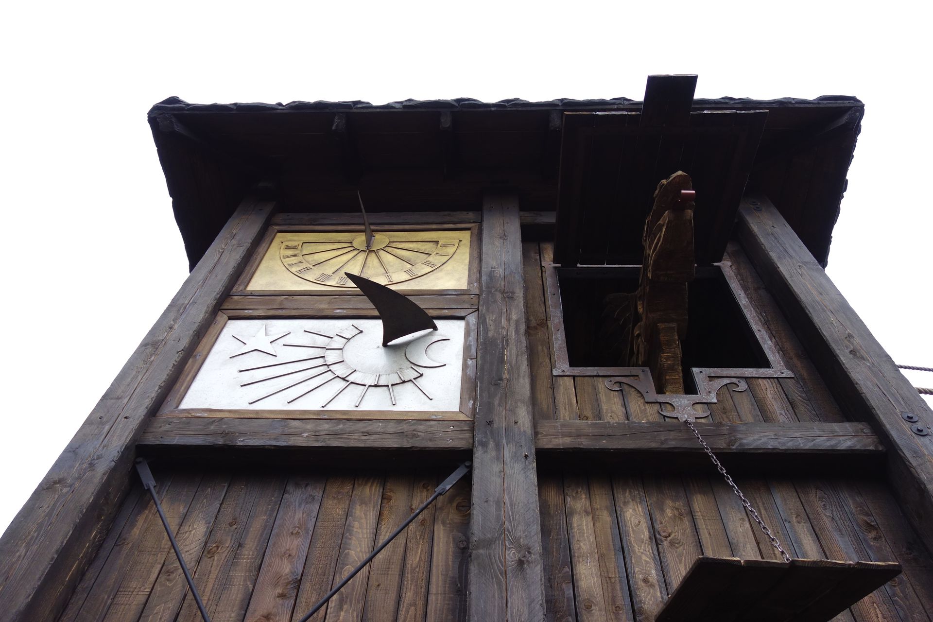 Im Turm neben dem Eingang ist neben Sonnen- und Monduhr auch ein Drache beheimatet.