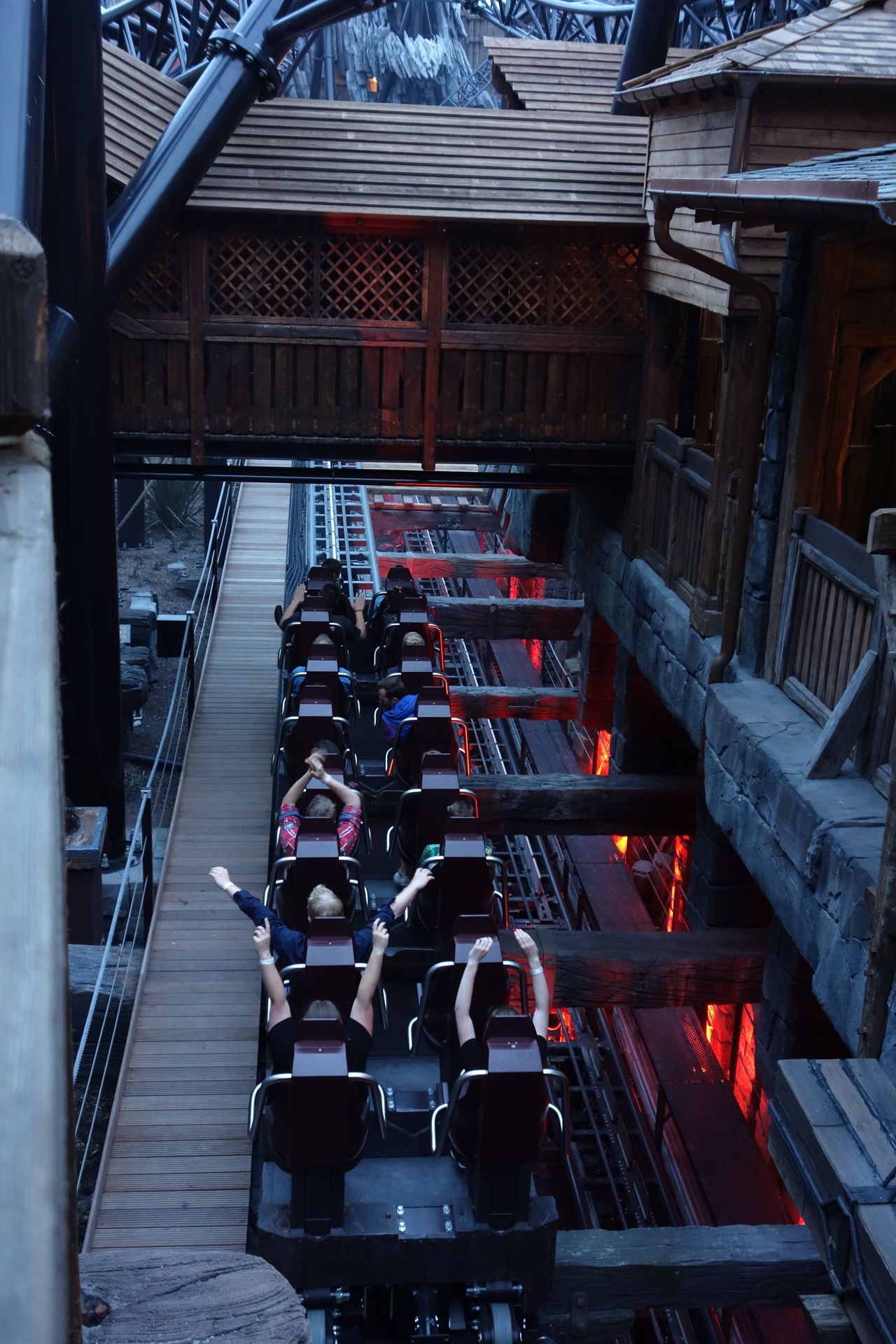 Ein paar kleine Kinderkrankheiten hat natürlich auch Taron noch. So führte man, als wir uns angestellt hatten, noch ein paar Leerfahrten nach kurzem Stillstand durch, ehe es weiterging. Für die erste Reihe wartend mussten wir dann etwas warten, bis eine GoPro zur Aufnahme der zweiten Reihe (wohl eine mir unbekannte Promi-Dame?) montiert war. Da die Halterung am Bügel montiert wurde und dieser dazu geschlossen sein musste, war ich davon ausgegangen, diese Fahrt noch auslassen zu müssen - was auch schneller gegangen wäre. Stattdessen wurde der Mitarbeiter am Schaltpult wild gestikulierend aufgefordert, die Bügel nochmals zu entriegeln und die Gates zu öffnen. Also stiegen wir noch zu, schlossen die Bügel und wurden kontrolliert. Aus der Fahrt wurde dann aber erstmal nichts, denn die Bügel des gesamten Zuges sprangen plötzlich wieder bis zur Hälfte auf. Im Operator-Häuschen wurde hektisch telefoniert, Aufforderungen Bügel und Gates zu öffnen wurden zunächst ignoriert. Erst nach wenigen Minuten ließ man die Besucher wieder frei und zurück hinter die Gates. Zwei Züge fuhren leer, dann durften wir zu einem erneuten Versuch einsteigen und wenig später auch tatsächlich starten.