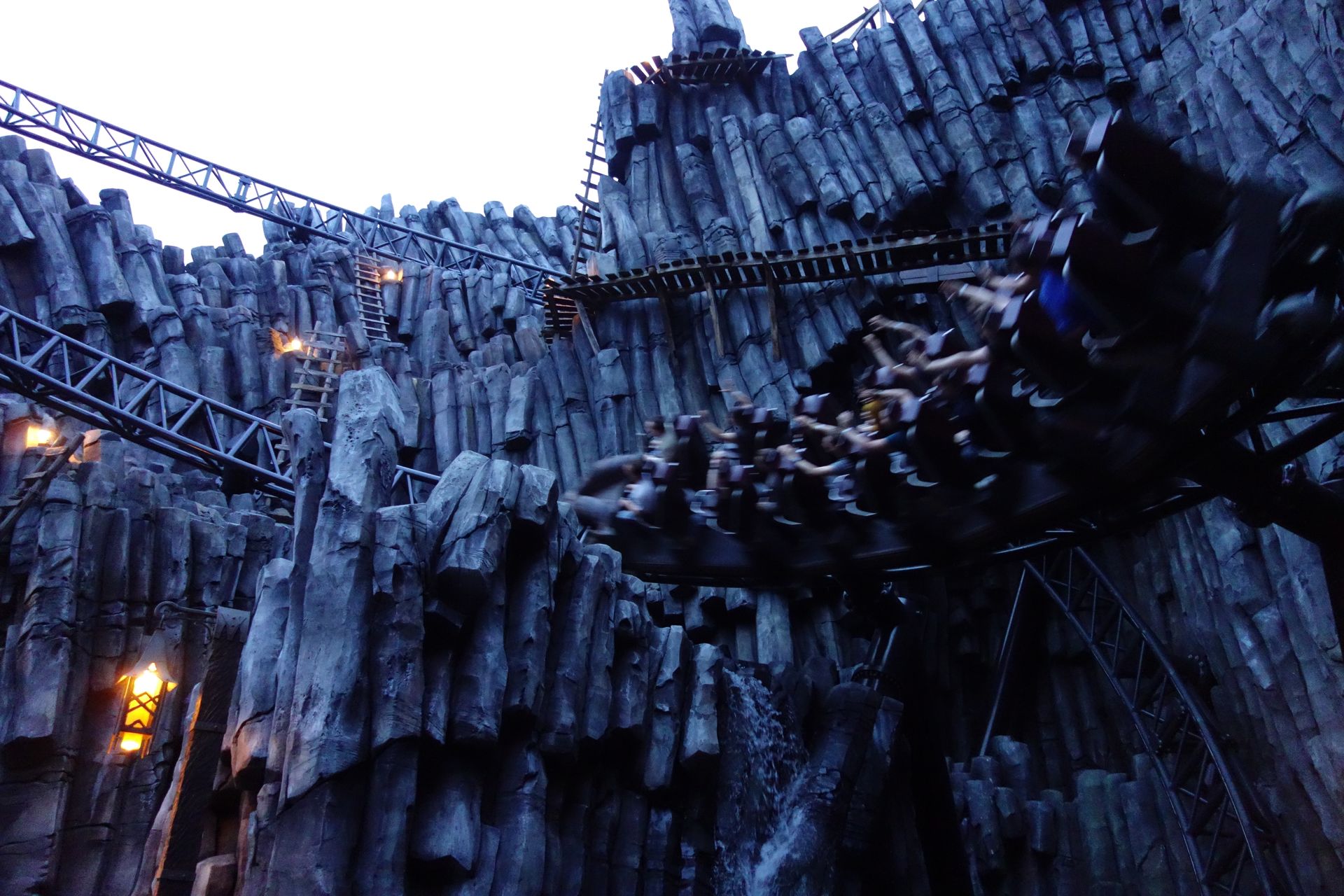 Airtime dafür sorgt, dass die Insassen ordentlich herumgewirbelt werden. Der Teil hintenrum quer durch Klugheim hindurch ist dann ein wenig sanfter, wenn auch noch weit entfernt von Kaffeefahrt. Nach wie vor nicht zu langsam geht es über das Stationsgebäude hinweg und durch die harmonischen S-Kurven neben Chiapas, ehe man in den Graben zum zweiten Launch abtaucht. Auch dieser reißt mich nicht wirklich vom Hocker, gibt dem Zug aber nochmals einen ordentlichen Geschwindigkeitsschub für den zweiten Teil des Layouts. Die Auffahrt zur höchsten Stelle des Layouts wurde nicht nur mit einer engen Felsdurchfahrt verziert, man hat sogar einen Wasserfall direkt daneben und darunter platziert. Vor allem die linke Seite des Zuges bekommt davon auch einige Tropfen ab, was bei der Geschwindigkeit definitiv zu spüren ist. In der hochgelegenen S-Kurve versucht der Widder dann erneut, seine Fahrgäste abzuwerfen, was ihm aber glücklicherweise nicht gelingt. Man taucht wieder gen Boden ab, durchfährt eine weiter übergeneigte Kurve und fliegt schließlich über den verdrehten Airtimehügel parallel zum ersten. Eine weitere tolle Stelle. In der Hausdurchfahrt geht das