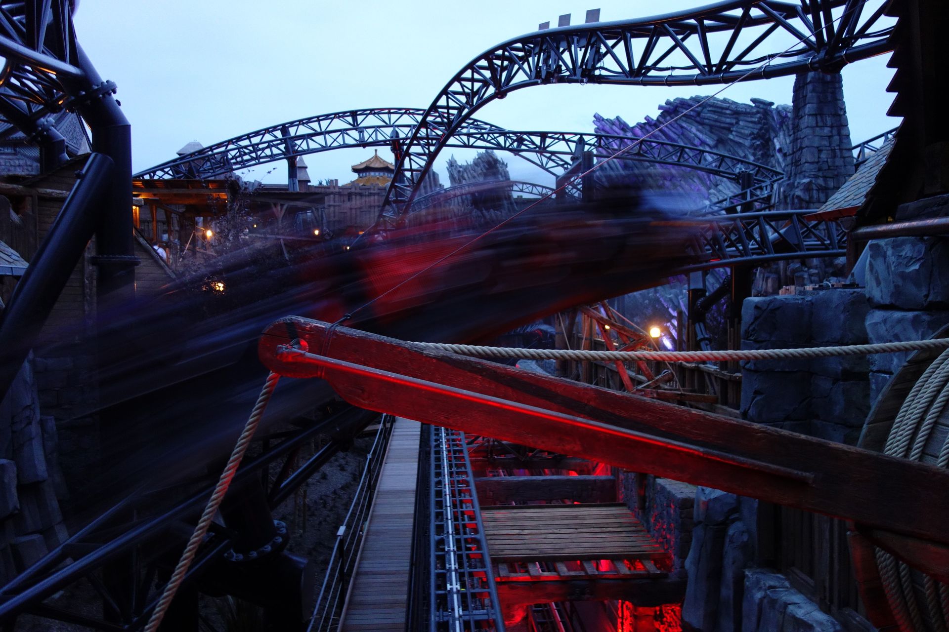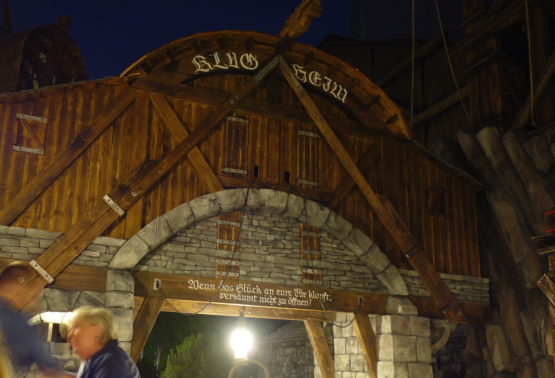 Bevor ich nur Bilder von vorbeifliegenden Zügen auf der SD-Karte hatte, steckte ich die Kamera dann doch lieber weg. Klugheim hat schließlich so viel mehr zu bieten. Eine zweite Achterbahn beispielsweise, die im Trubel um Taron leider ein wenig unterging. Auch bei der Eröffnung. Raik bekam nämlich gar keine Ansprache, nicht einmal so eine aufgezeichnete wie der große Bruder zuvor. Stattdessen bekam die freundliche Mitarbeiterin einfach nur ein Signal, woraufhin sie uns ohne weiteres Brimborium durch den elend langen Wartebereich führte. Vom Eingangshäuschen über die kleine Brücke parallel zur großen, die Treppe hinunter und einmal durch das neue kleine Gebäude unterhalb des China-Durchgangs. Von dort weiter zwischen der Wand des Feng Ju Palace und dem von Raik durchfahrenen Graben, den man schließlich mit einer Brücke überquert, ehe es in die Station hineingeht. Caruso sicherte sich die letzte Reihe, ich musste mit der vorletzten Vorlieb nehmen. Bevor wir einsteigen durften, drehte noch ein Promi-Zug seine Shuttle-Runde, dann konnten wir den ersten quasi-öffentlichen Zug besetzen. Sehr geil. Leider habe ich von Raik so gut wie gar keine Bilder, da ich die erste Fahrt so auf mich wirken lassen wollte.