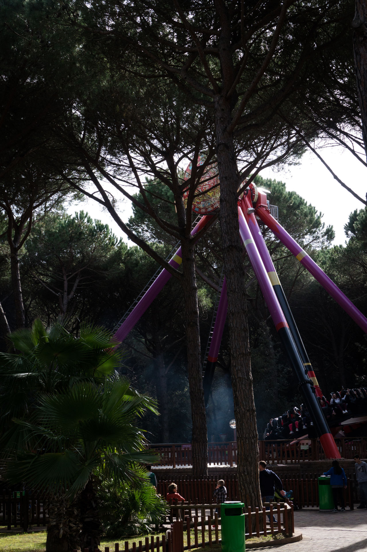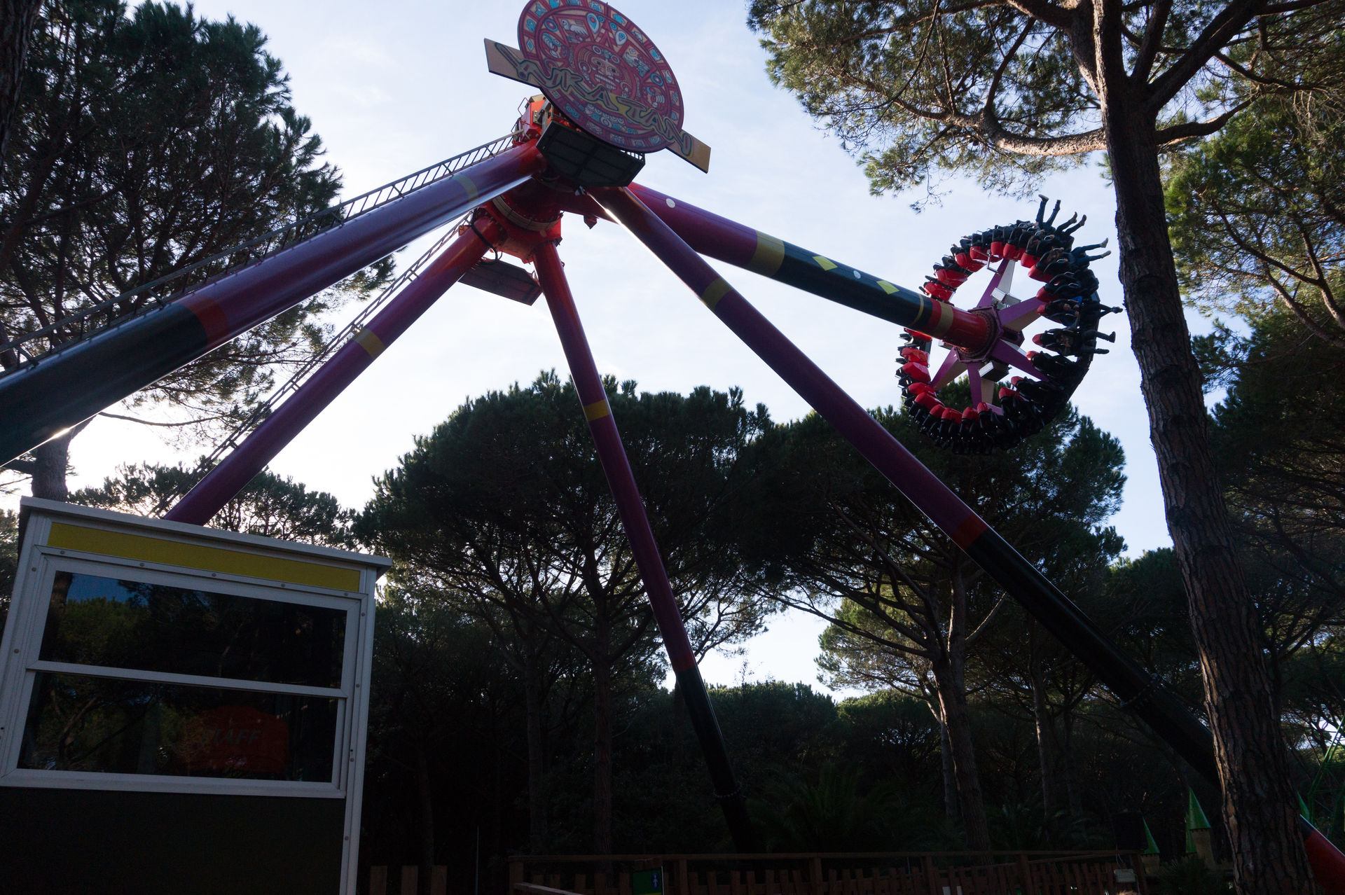 Nur wenige Meter weiter ist bereits das erste Ende des Parks erreicht, wo sich an einem größeren Platz zwei Fahrgeschäfte über die stets präsenten Baumkronen hinauswagen. Während dies dem 55m hohen Shocking Tower aus dem Hause Soriani & Moser locker gelingt, so reicht der Gondelträger des Technical Park Typhoons Yukatan nur im vollen Ausschlag über die Baumwipfel hinaus. Dadurch wird die, ansonsten eher zahme, Fahrt zu einem durchaus aufregenden Erlebnis.