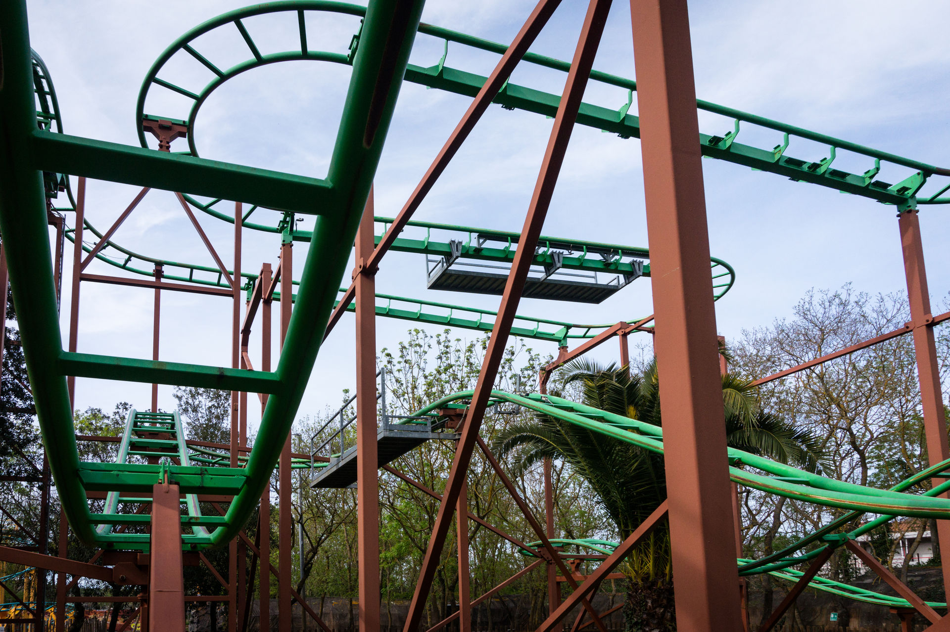SBF Visa, in dessen Innenhof sich die Schiffschaukel Nave Pirata befindet, ging es zur ehemals größten Achterbahn des Parks, der L&T Systems Anlage Project 1. Hier stießen wir auch zum ersten Mal auf die vorbildliche Abfertigung des Parks, wonach man den Zug mit genügend Fahrgästen sofort bzw. mit nur wenigen Fahrwilligen erst nach einem bestimmten Zeitintervall auf die Strecke schickt. Dies sorgt gerade an leeren Tagen für genügend Fahrten auf allen, für einen relevanten, Anlagen ohne auf mögliche Schließ- und Öffnungszeiten achten zu müssen.
