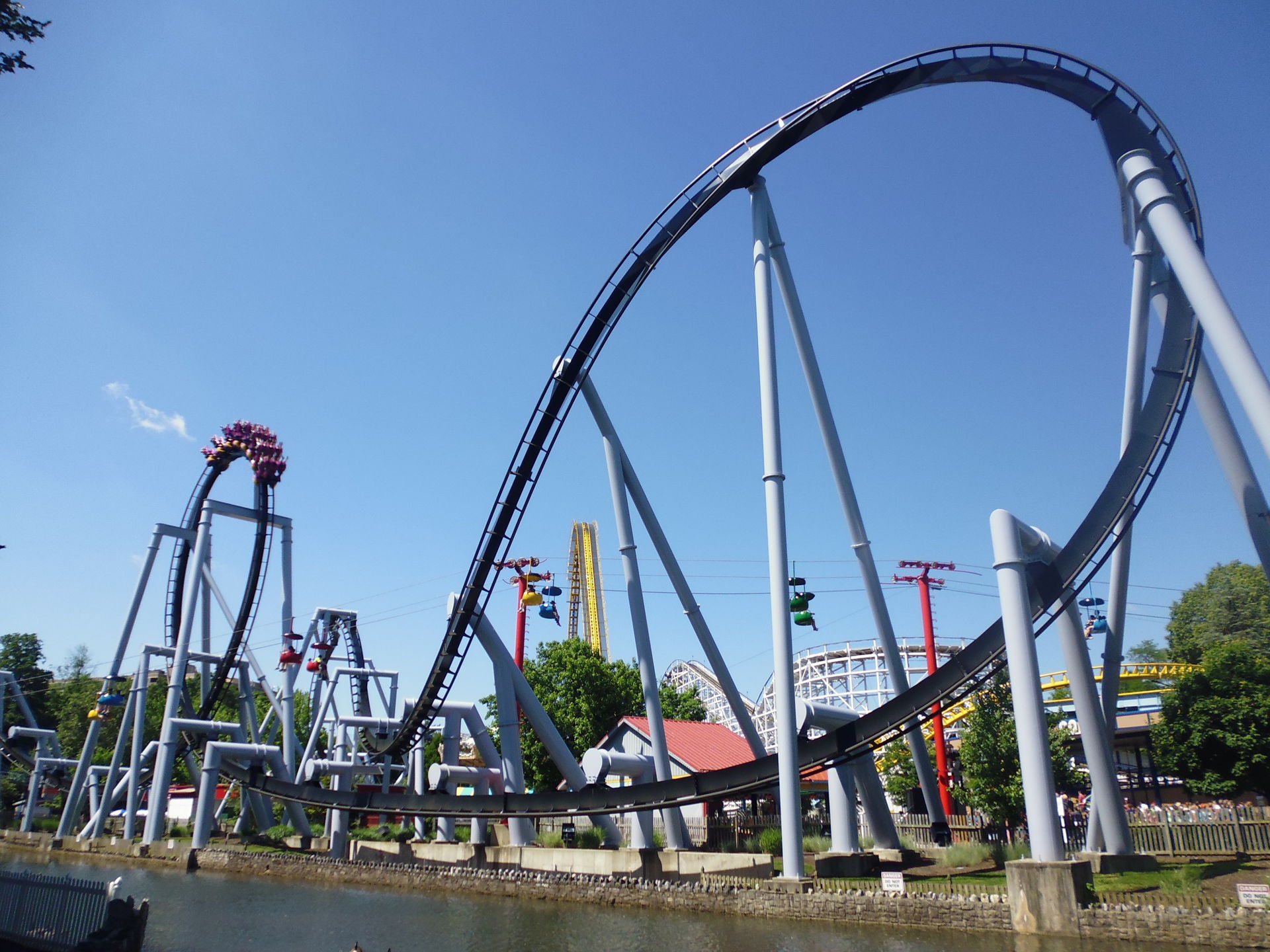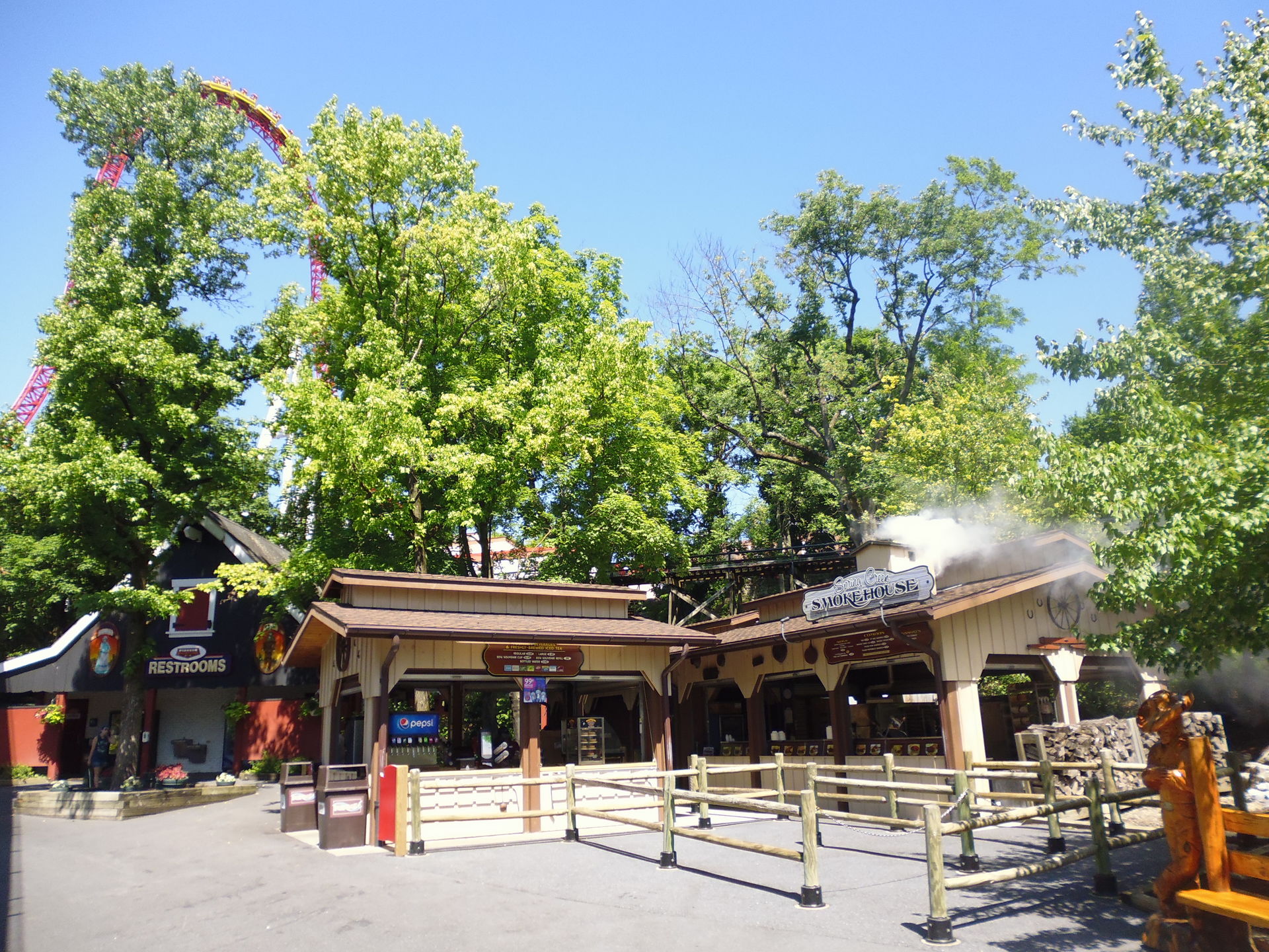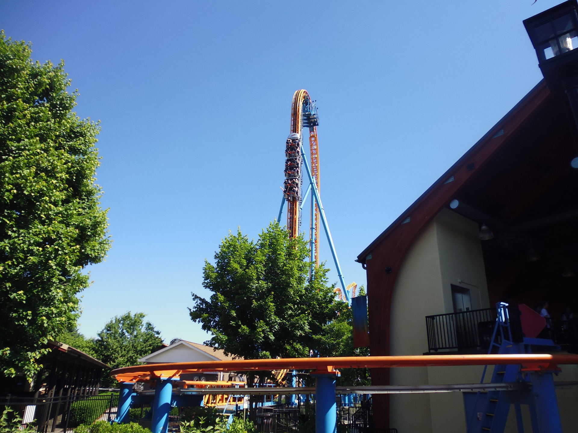 - da hab ich nach dem Aufsuchen des letzten Trinkbrunnens vor dem Parkausgang noch den "Geheimweg" entlang des Spring Creeks entdeckt, der zwischen Guest Relations und dem Toilettengebäude von der Mainstreet abzweigt und an Tagen wo er überhaupt offen ist eine Abkürzung direkt zu Skyrush, Sooperdooperlooper und Great Bear bietet. Hier kann man Skyrush besonders schön ablichten, was ich natürlich gleich noch nachgeholt habe, bevor es dann endgültig raus aus dem Park ging und bevor ich nach endlich erfolgtem Shortwechsel dann das nächste Reisestück in Angriff nahm.
