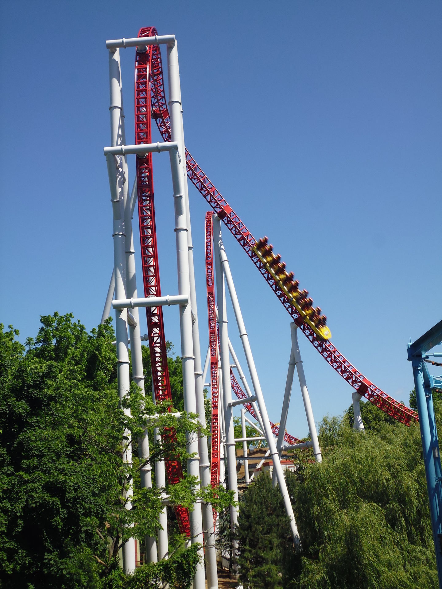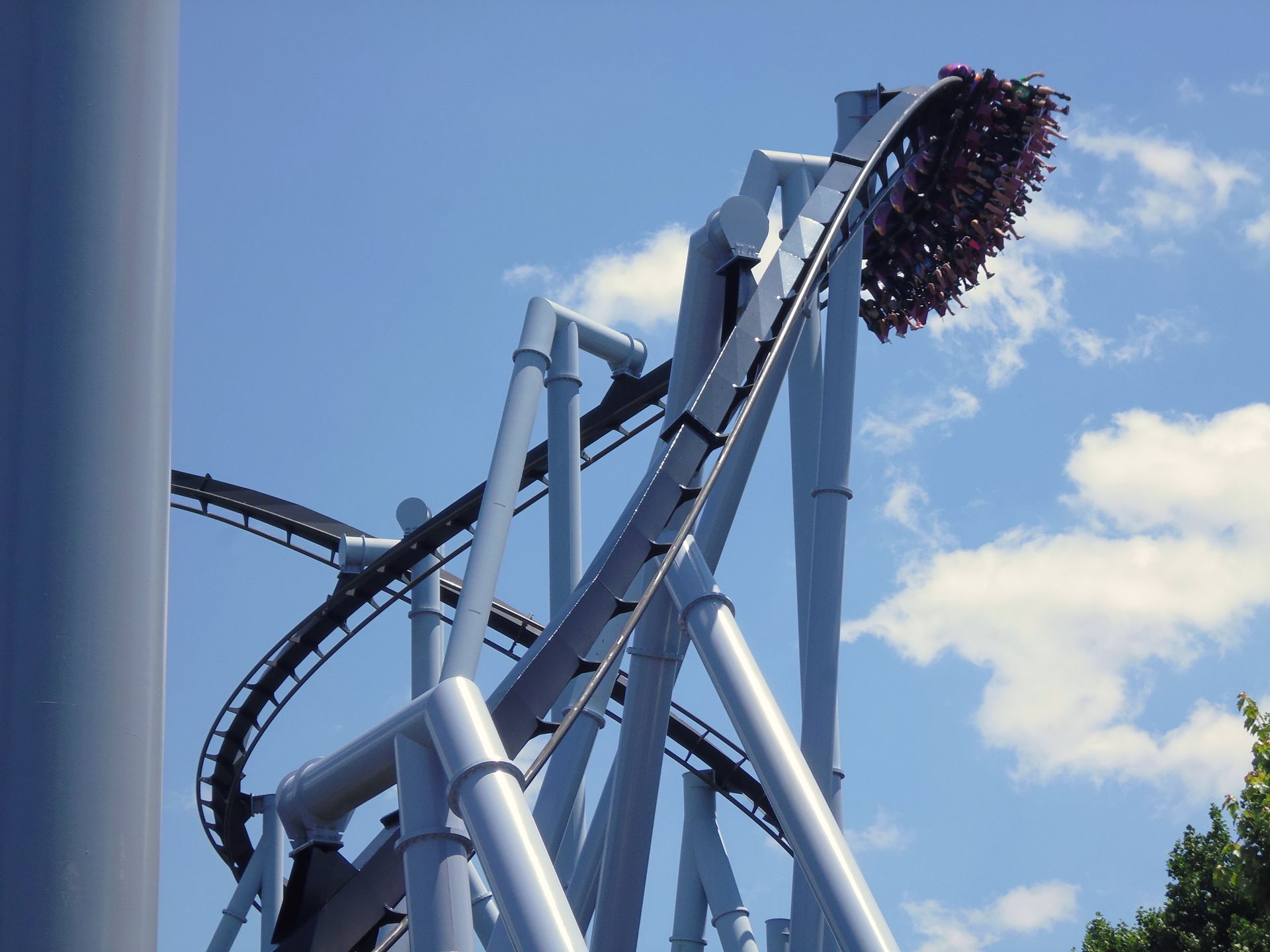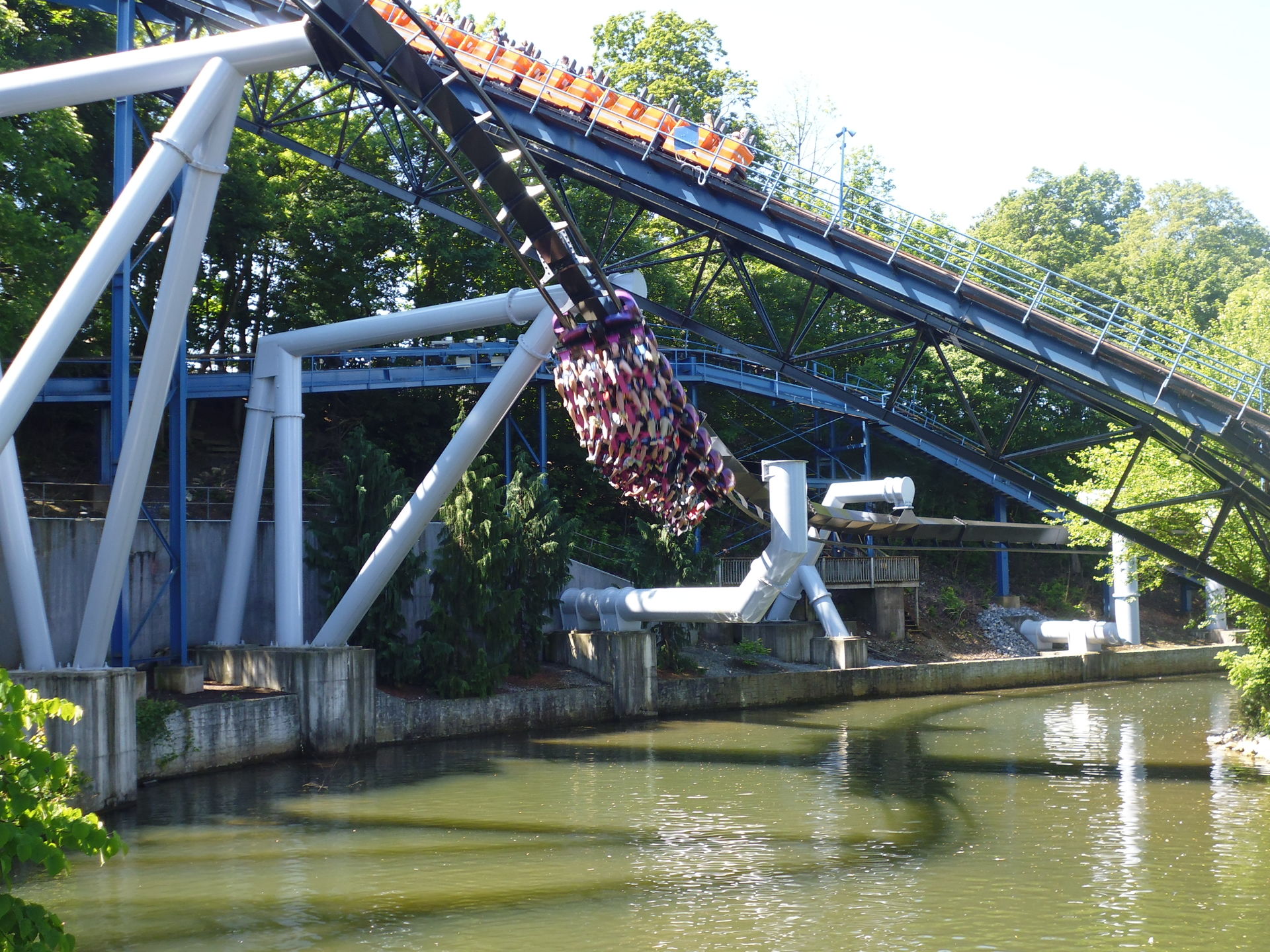 Heartline Roll, die mit grandiosem Endlos-Linkspush aufwartet, daraufhin folgt gleich noch eine halbe solche, die dann direkt in einen sich um 90° drehenden und reichlich abfallenden Senkrecht-Halblooping mündet. Oder streng nach RCDB ausgedrückt: ein Flying Snake Dive wird absolviert. Alles klar?