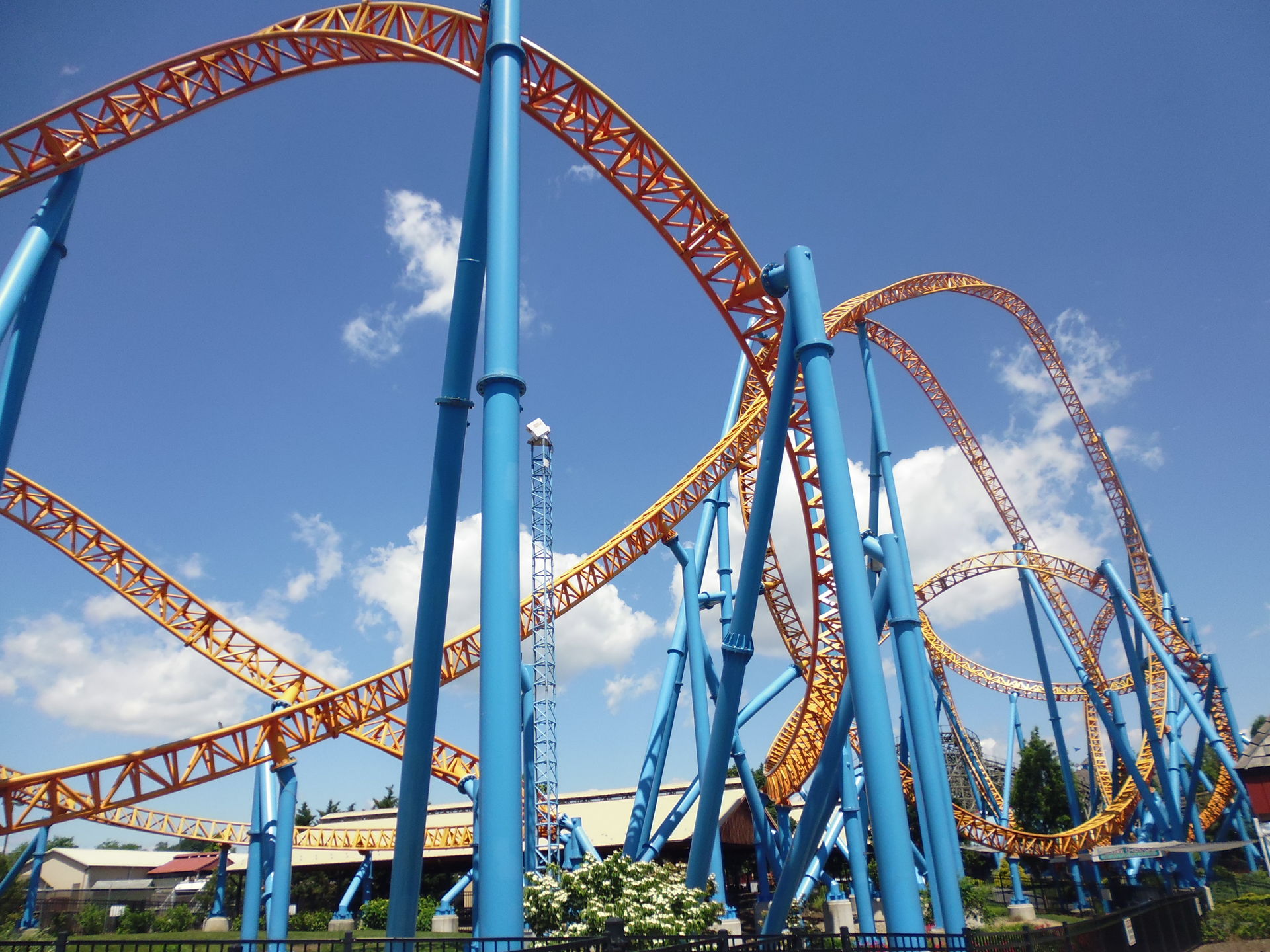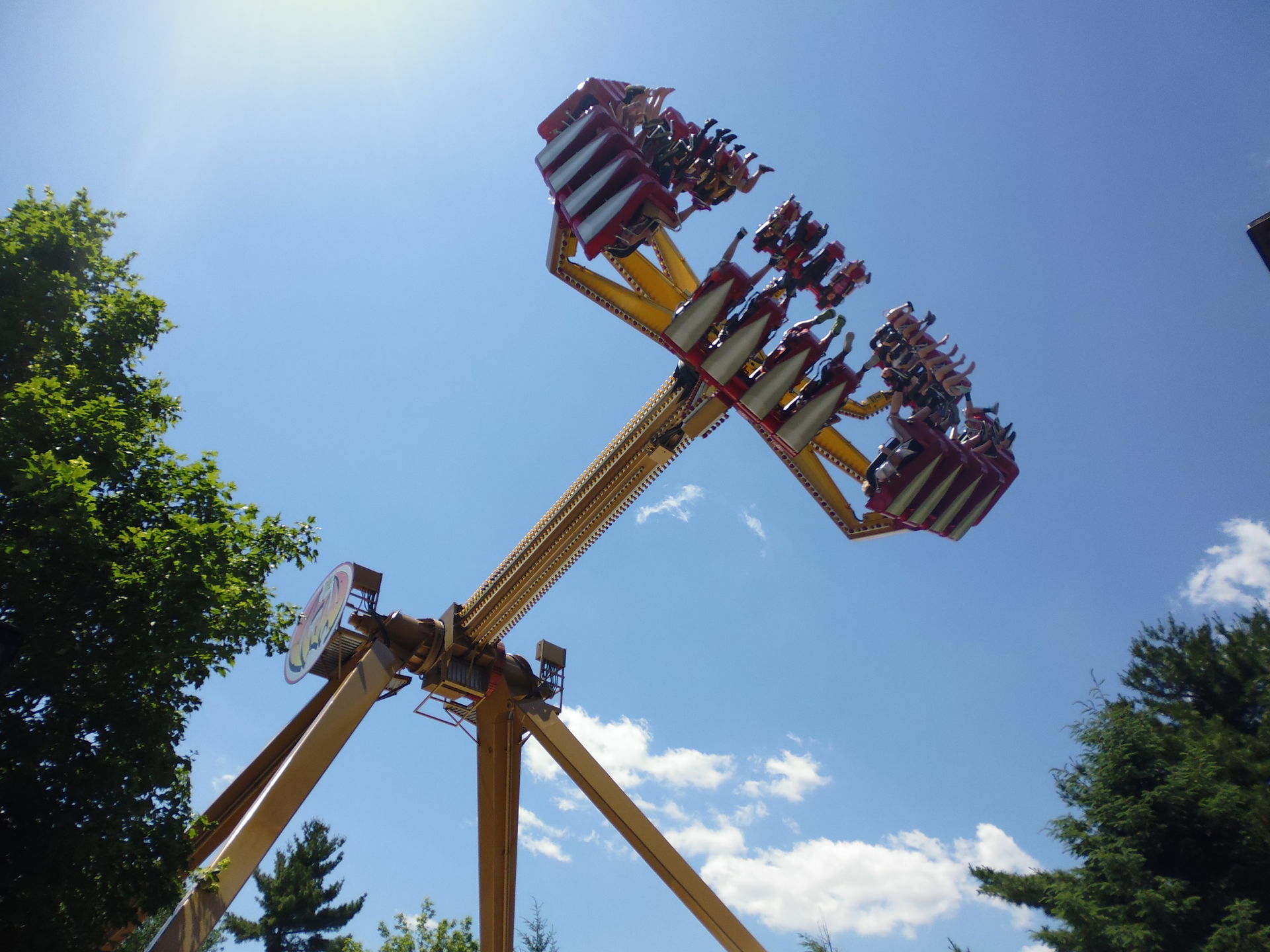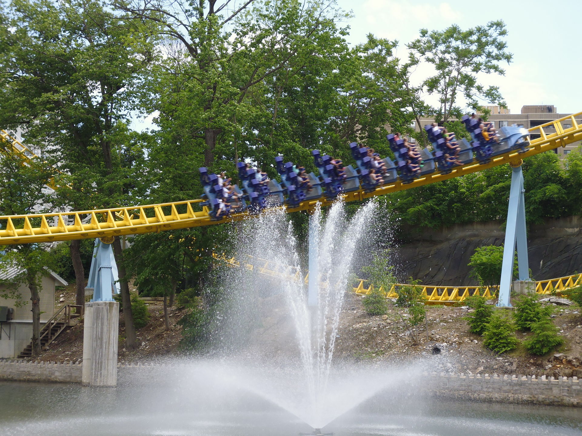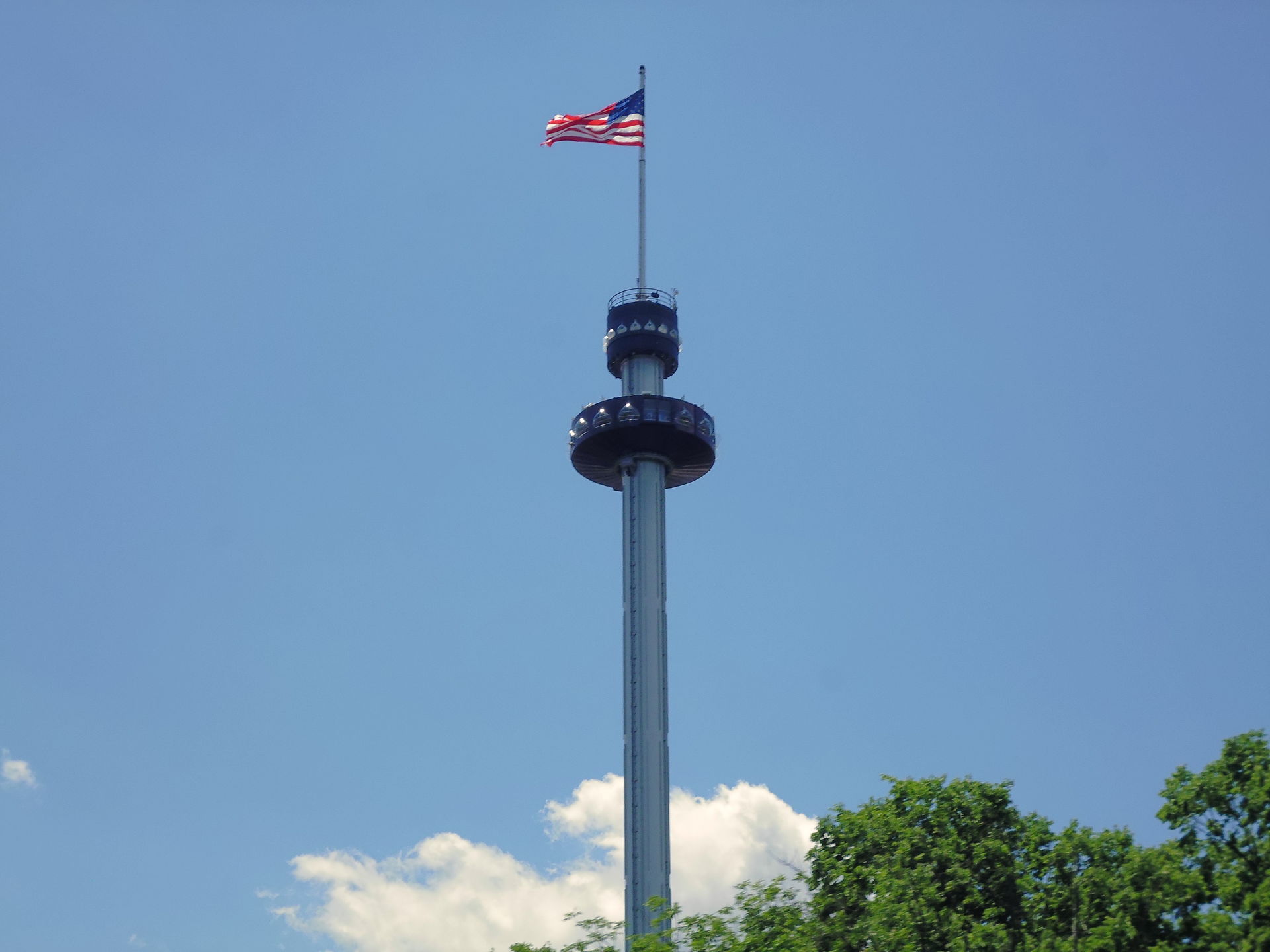 Nachdem ich noch einmal dazu gezwungen war, mit der roten Seite zu fahren, weil ich meine Sonnenbrille auf der Stationsablage vergessen hatte, irrte ich durch den nur halb abgesperrten Wasserpark nun wieder in den Freizeitparkteil zurück und wollte erst einmal eine Aussichtsfahrt mit dem Kissing Tower unternehmen.