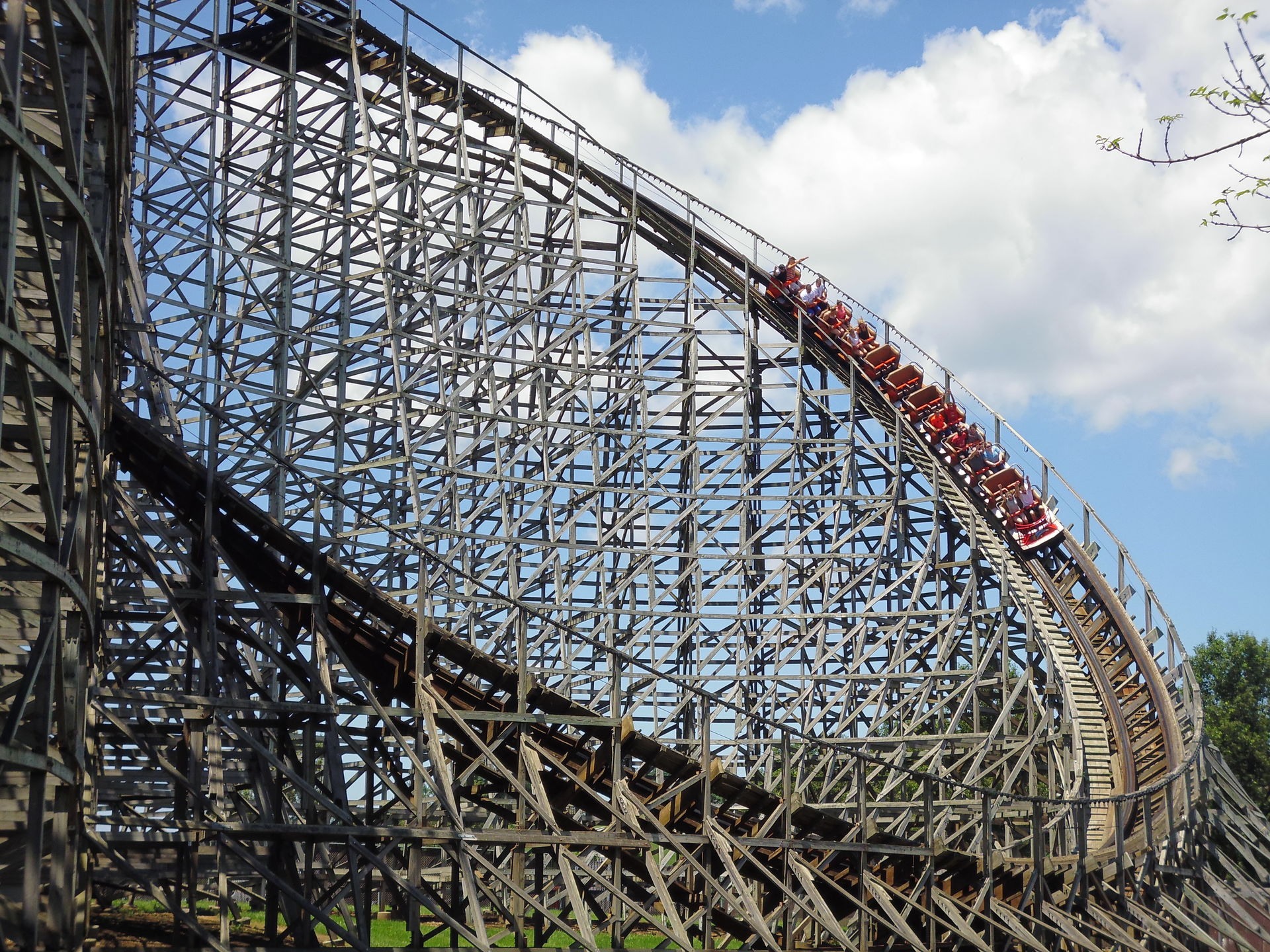 Den zweiten Comet dieser Ferien fand ich ehrlich gesagt noch lahmer als den ersten, trotz auch hier eigentlich sehr schöner und interessanter Streckenführung. Die Fahreigenschaften sind zwar genau so, wie sie auf einem alten Woodie sein sollten und einige Male wird man auf den zahlreichen Hügeln auch prima aus dem Sitz gehoben, besonders im letzten Abschnitt entlang des Spring Creeks. Allerdings macht eine ganze Armada von Trimbrakes genau diesen durch die Horizontal-Klappbügel potentiell ja besonders schönen Momenten oftmals einen Strich durch die Rechnung. Ein zweifellos guter alter Klassiker, der im Gesamtangebot des Parks und der Reise schlicht etwas untergegangen ist.
