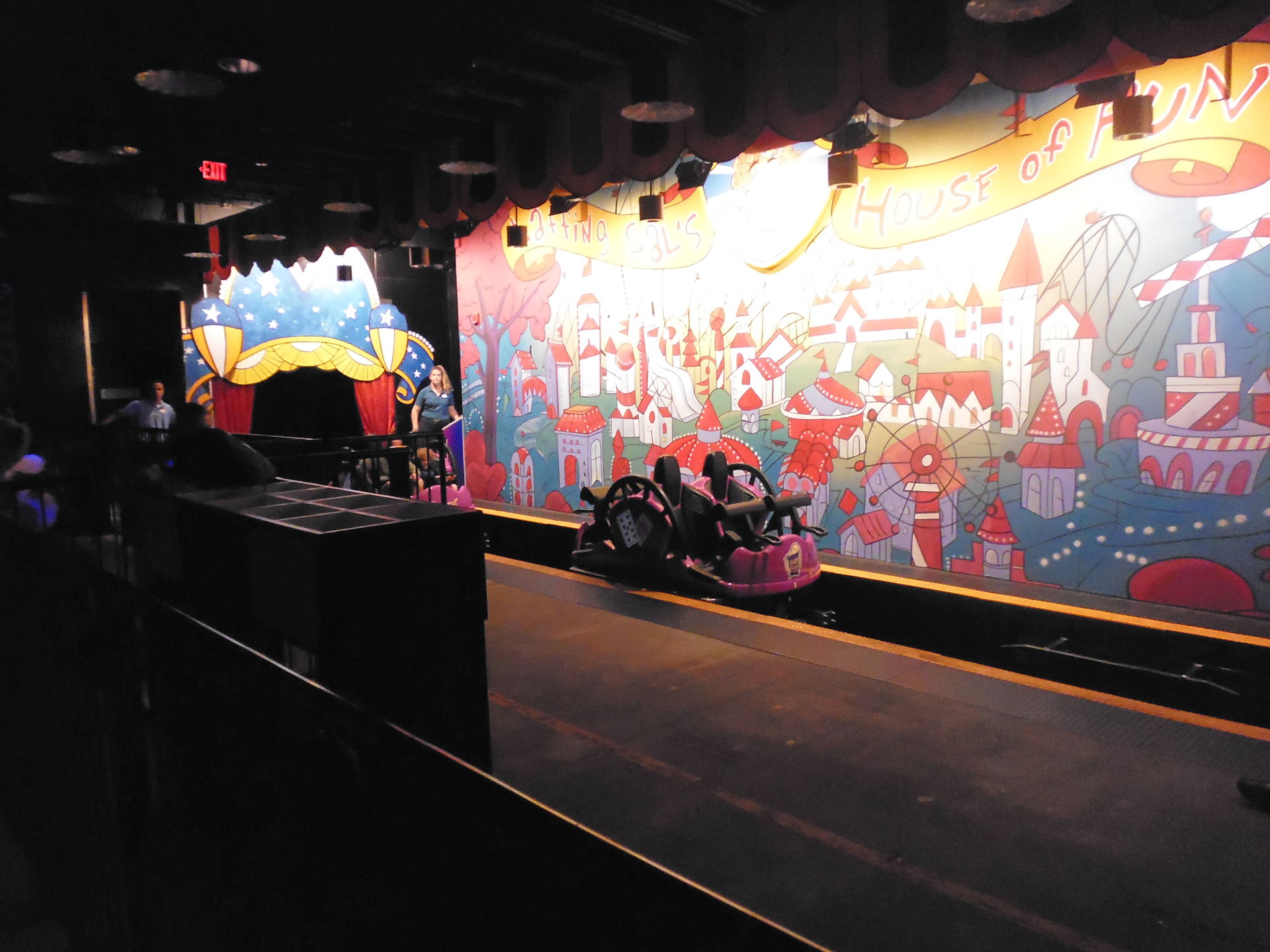 Die Queue und die ganze Anlage sind als Funhouse thematisiert und kommen mit entsprechenden Effekten daher, wie zum Beispiel diesem Zerrspiegel kurz vor der Station.