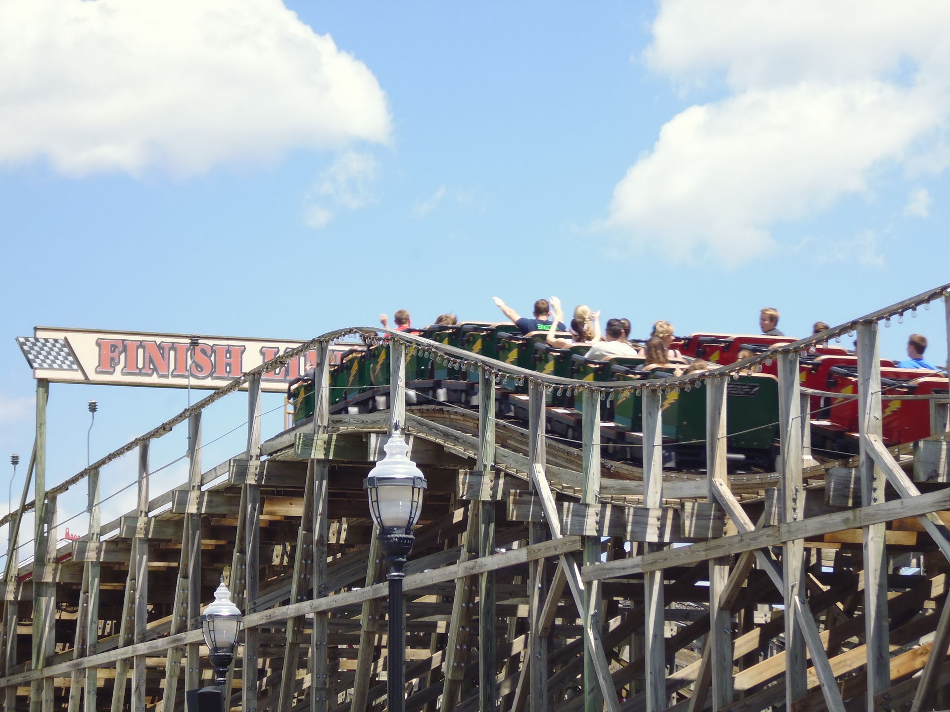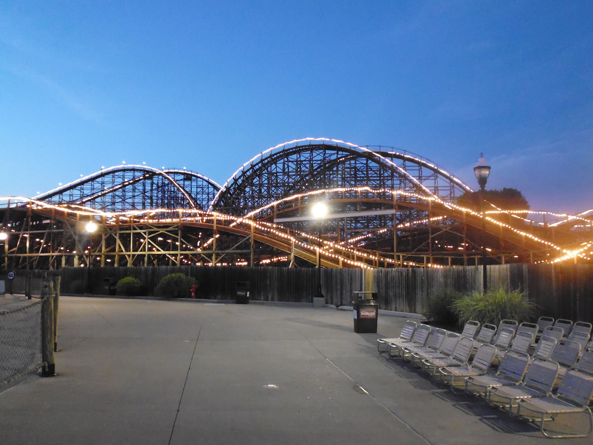 GCI-Standard entspricht. Hier war nur ein Zug im Einsatz, aber das langte vollkommen - ich konnte direkt in die Backrow zusteigen und bekam sogleich wieder einmal demonstriert, dass man gerade bei Holzachterbahnen nicht immer auf Erfahrungsberichte vertrauen soll. Denn man höre und staune: Wildcat stieg dank dieser Fahrt in der romantischen Dämmerung sofort in die Top 5 meiner bislang gefahrenen GCIs auf! Der an diesem Tag wohl ordentlich warmgefahrene Zug bot eine überaus leckere Fahrt mit reichlich positiven Gs in den Tälern und Kurven, jeder Menge Speed und Fahrtwind, herrlichem Rumgekurve und vor allem auch etwas, was ich auf den meisten bislang erlebten GCIs ein wenig vermisst habe: