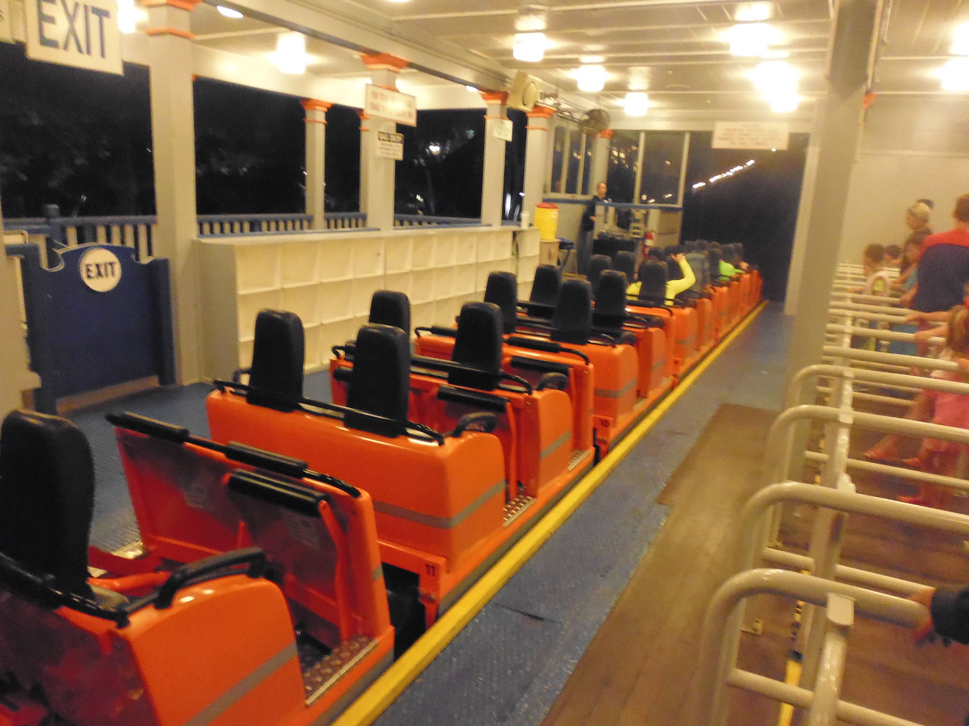 Gerstlauer-Zug Platz nahm. Auch die Bügel sind praktisch identisch und entsprechend schnell durchkontrolliert, so dass auch bei hier vorherrschendem Einzugbetrieb absolut keine Schlange entstanden ist. Dies war die einzige Bahn im Park, wo die Ride-OPs Sitzenbleiben bei einem leeren Gate erlaubten, so dass ich in der zweitletzten Reihe gleich zwei Fahrten durch die pechschwarze Finsternis unternehmen durfte! Und dabei war ich mit meinen zwei Fahrten ja noch pflegeleicht: der laut rausgekreischten Aussage zweier etwa zehnjährigen Mädchen nach war es für manche Passagiere weiter vorne schon die fünfte Fahrt am Stück.