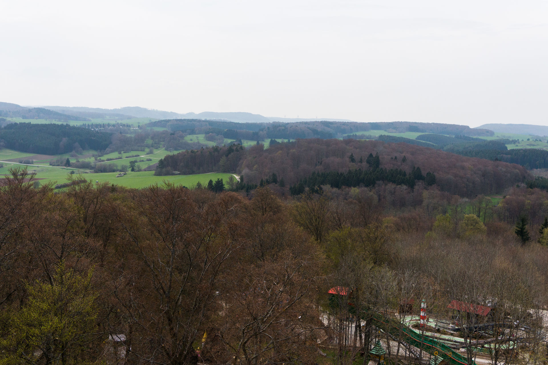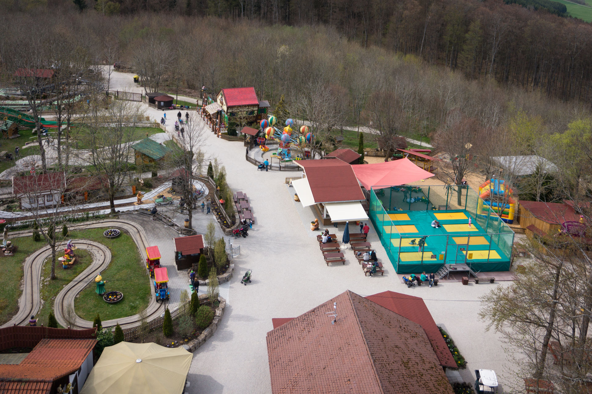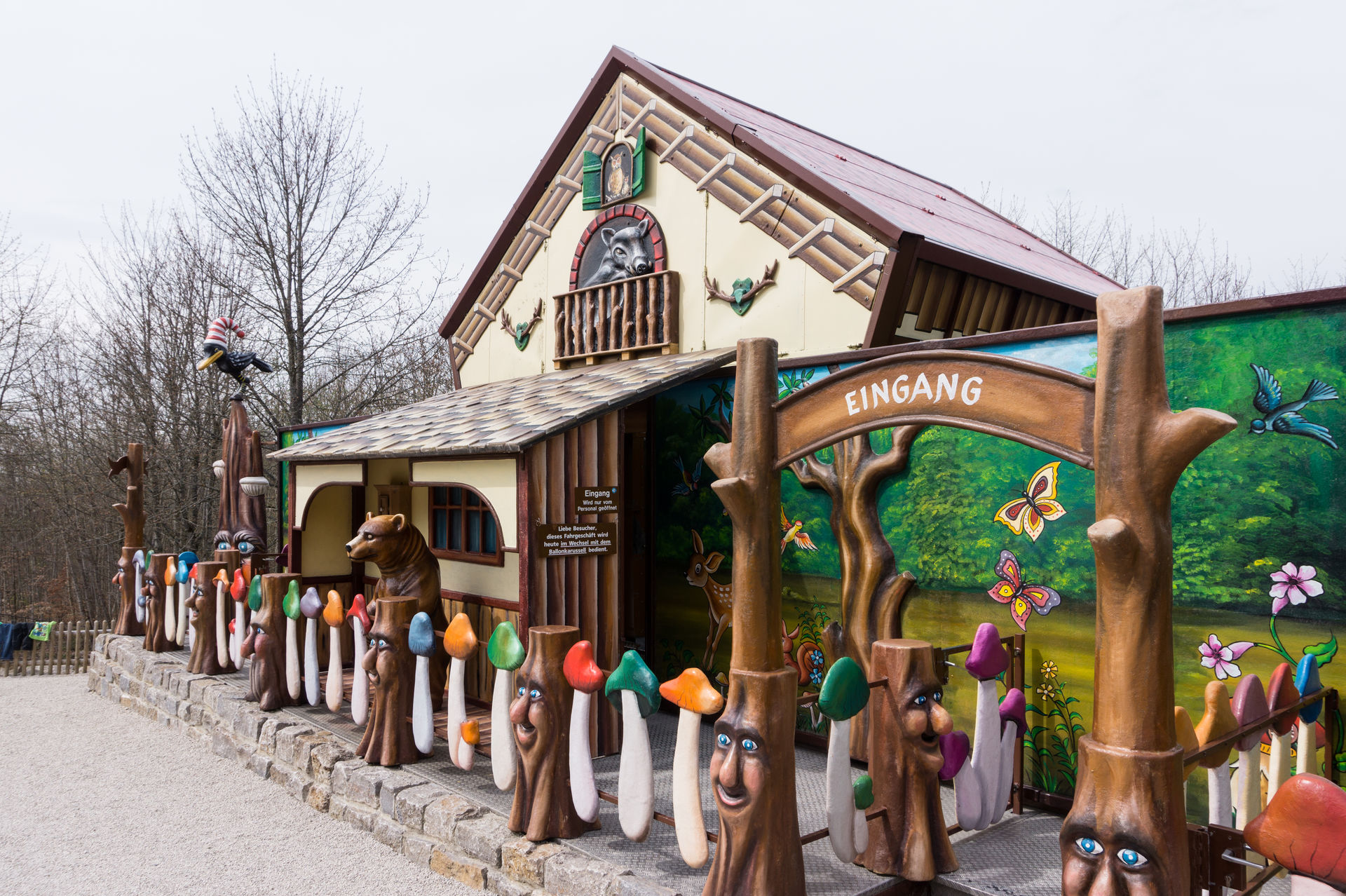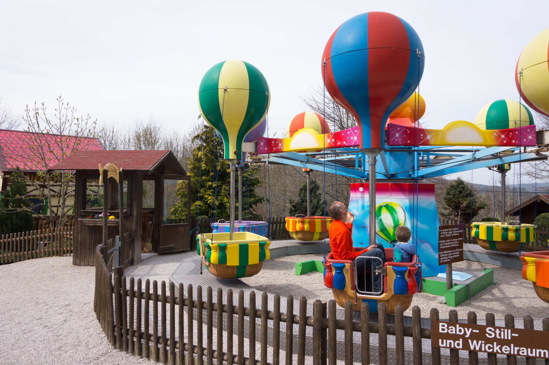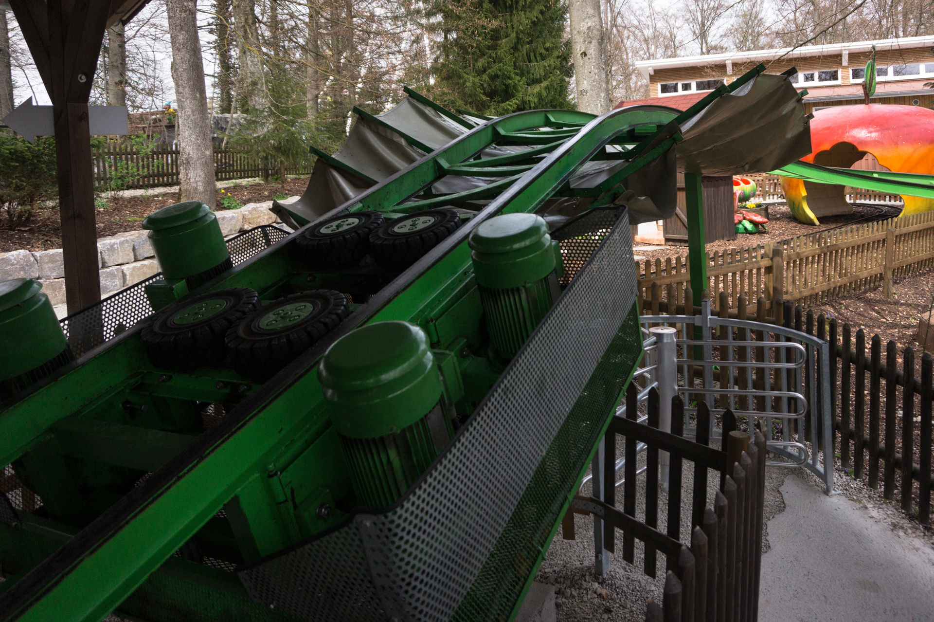 Entlang von diversen Grillstätten, für die auch Holz vom Park selbst angeboten wird, geht es wieder in den vorderen Parkteil, wo sich neben dem Kinderkarussell Fliegende Ballone ein wahres Schätzchen bietet. Bei dem verrückten Waldhaus handelt es sich um eine ehemals reisende, glücklicherweise jedoch umgestaltete, Hexenschaukel, bei der das Innenleben eines Hauses mal eben auf den Kopf gestellt wird. Die Gestaltung der Trommel ist, analog den modernen Vertretern dieser Art, detailreich und schön gestaltet, es fehlt eigentlich nur noch der stimmungsgeladene Soundtrack während der Fahrt.