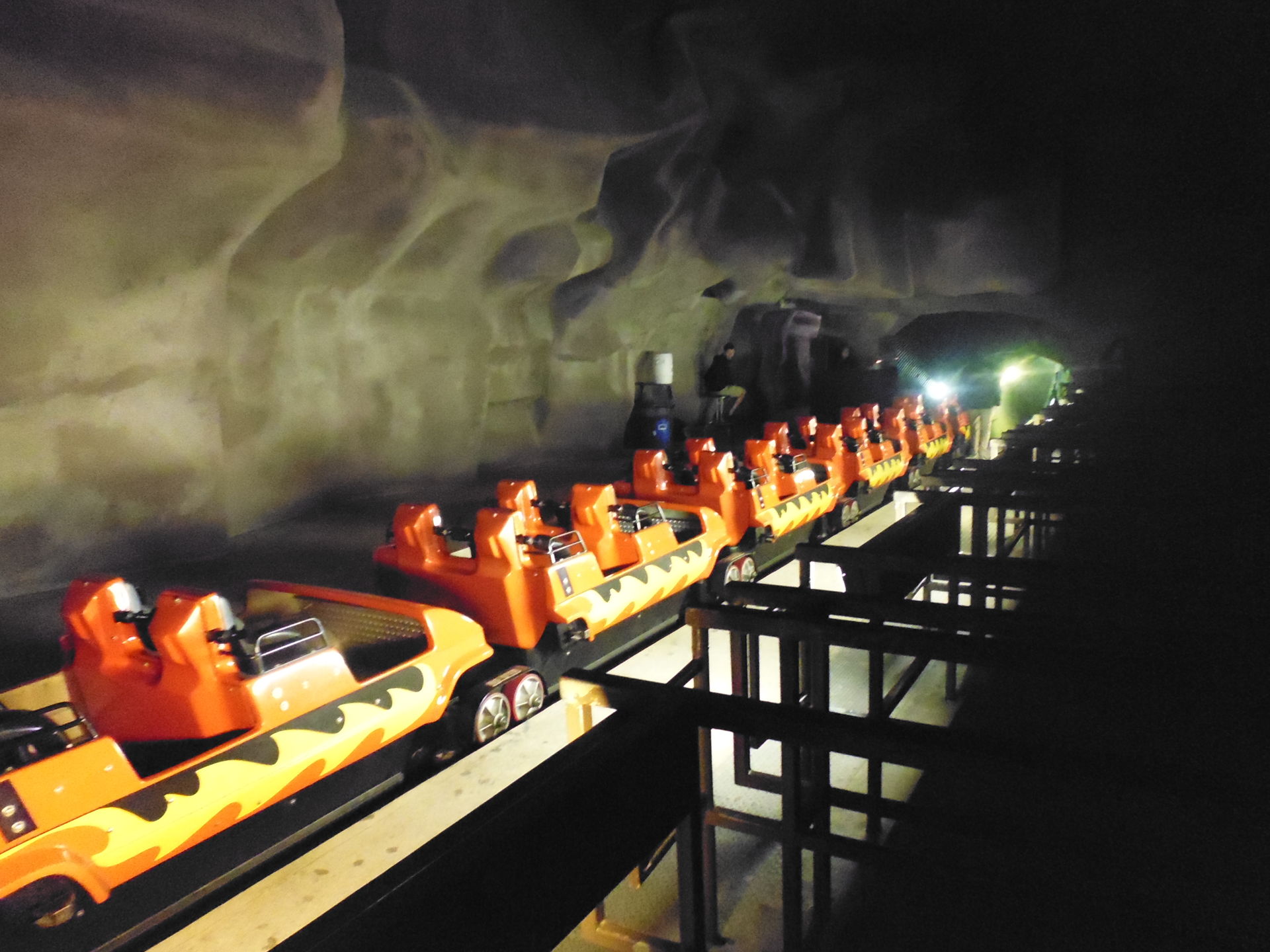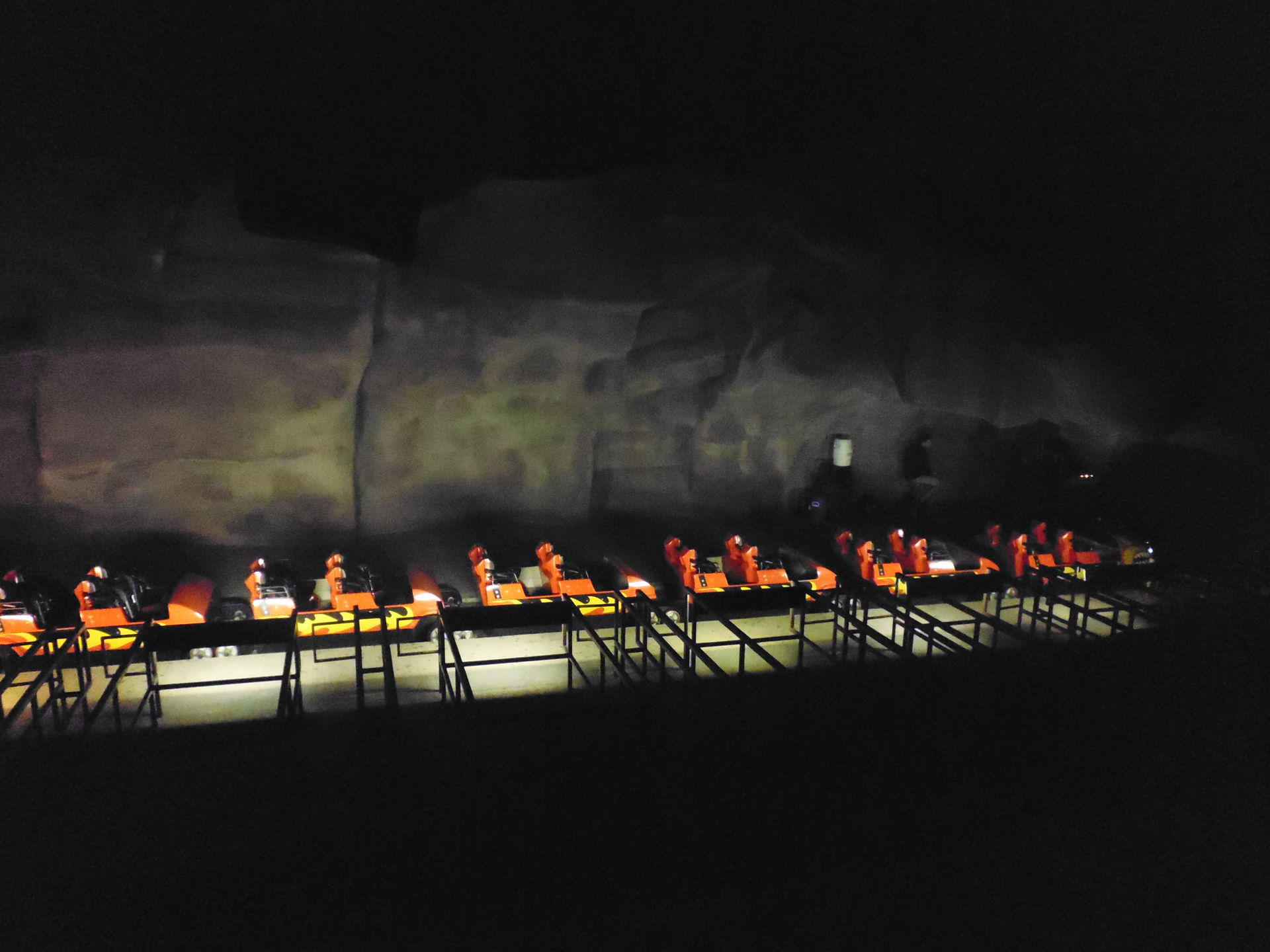 Diese und auch der Tunnel davor sind in fast vollständiger Dunkelheit gelegen. Nur gerade der unmittelbare Einsteigebereich ist etwas ausgeleuchtet. Vor allem im Tunnel und auf der letzten leicht abfallenden Rampe vor den Gates in der Station muss man zwangsweise den Schritt verlangsamen, um nicht zu stolpern - viele Gäste haben sich da die Flashlight-Funktion ihrer Handys zunutze gemacht, denn man sieht echt kaum die Hand vor Augen.