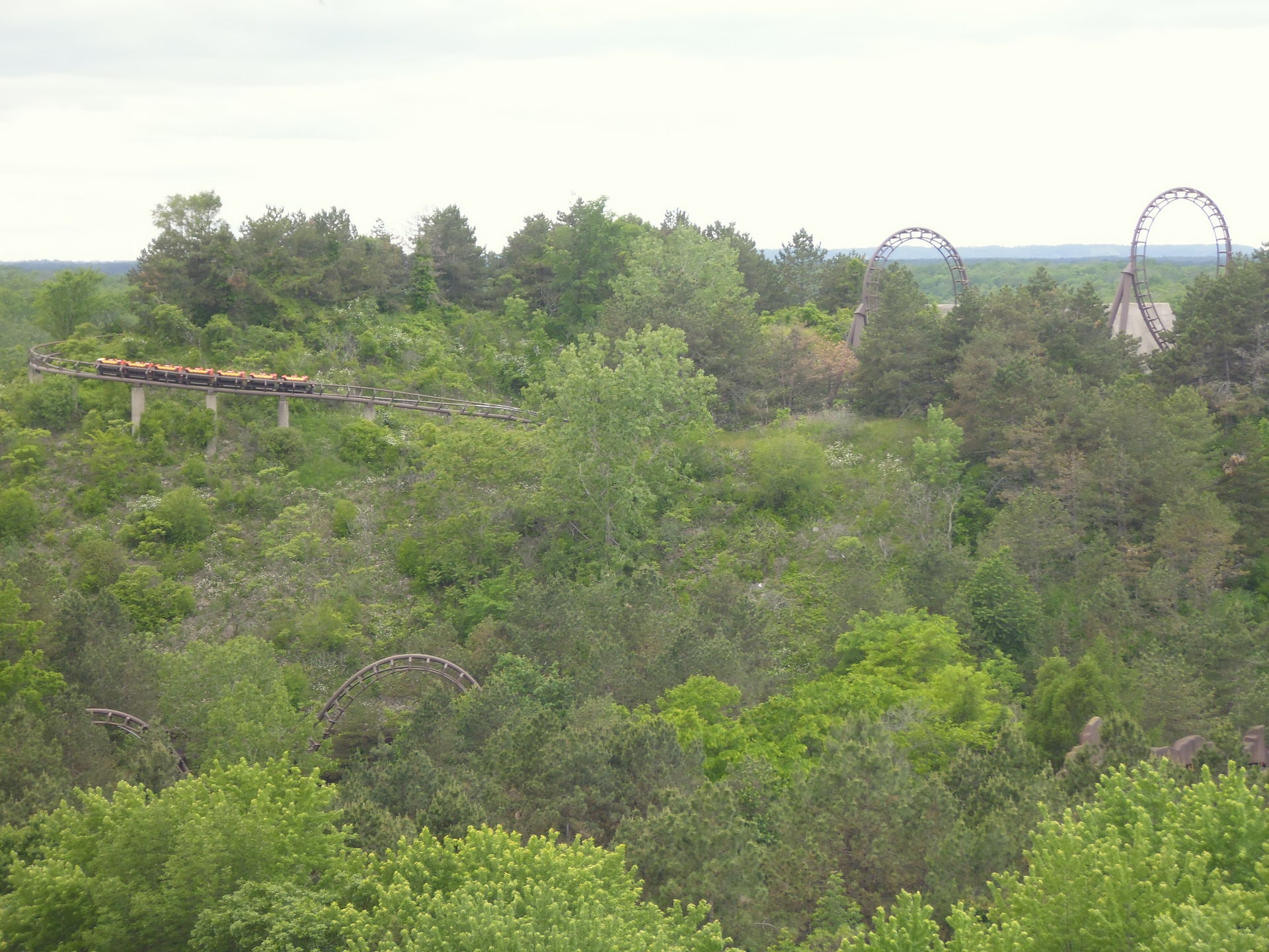 Es schliessen sich zwei druckvolle Loopings im Talboden an, daraufhin eine sich wiederum herrlich an den Hang schmiegende aufsteigende Kurve, die sich etwas rappelig fährt, was aber v.a. durch das nach oben hin stetig abnehmende Tempo natürlich auch nicht gross stört. Nun passiert man zwei Blockbremsen-Abschnitte mit kurzem Knick dazwischen, daraufhin wird Anlauf zur berühmten Doppelhelix im Vulkan geholt, dessen Gerüst zwar schon seit Eröffnung der Bahn im Jahr 1983 steht, aber erst 2006 auch die zugehörige Felsverkleidung erhalten hat. Ähnlich wie das Loch Ness Monster in den Busch Gardens Williamsburg hat auch diese
