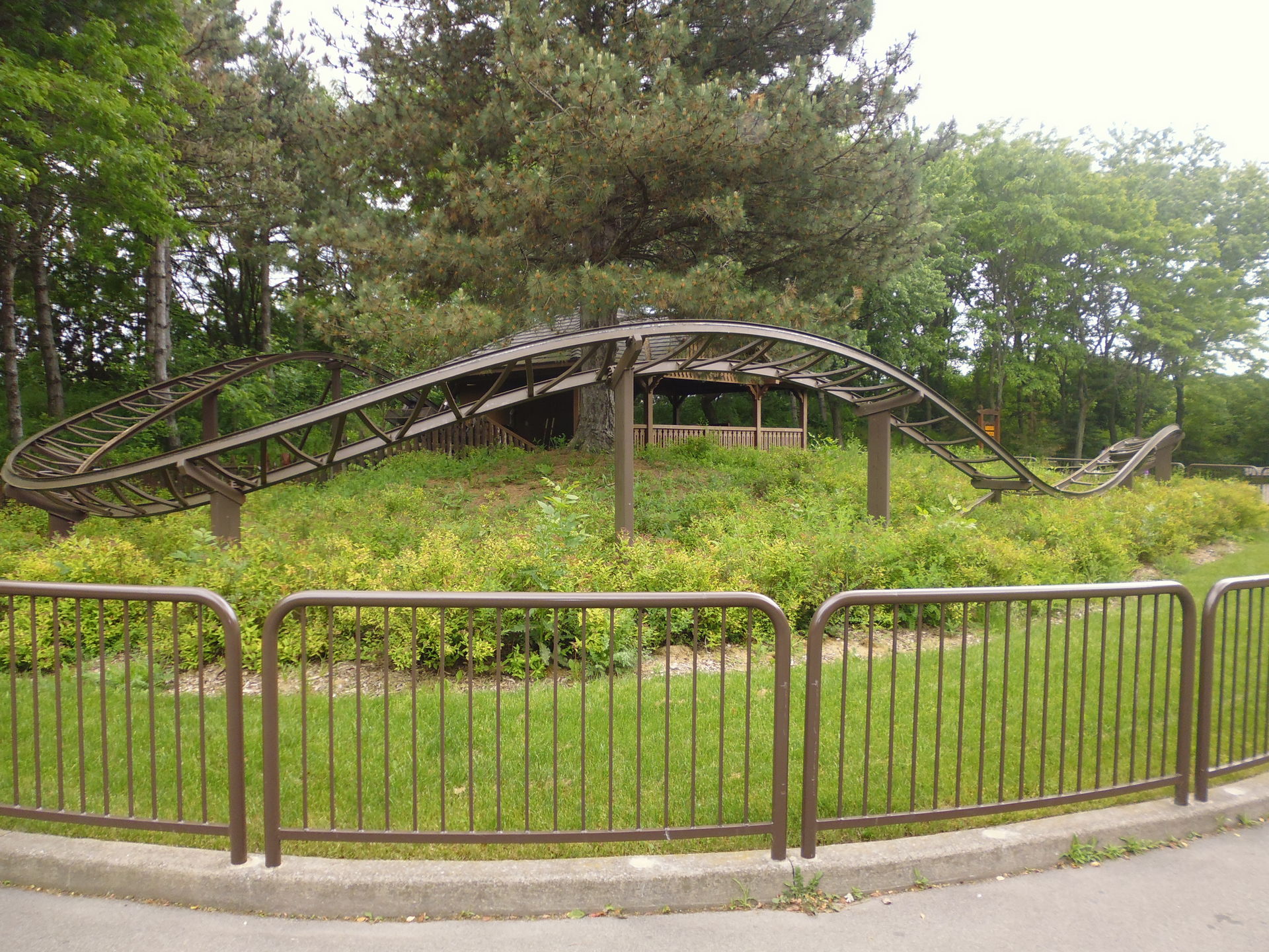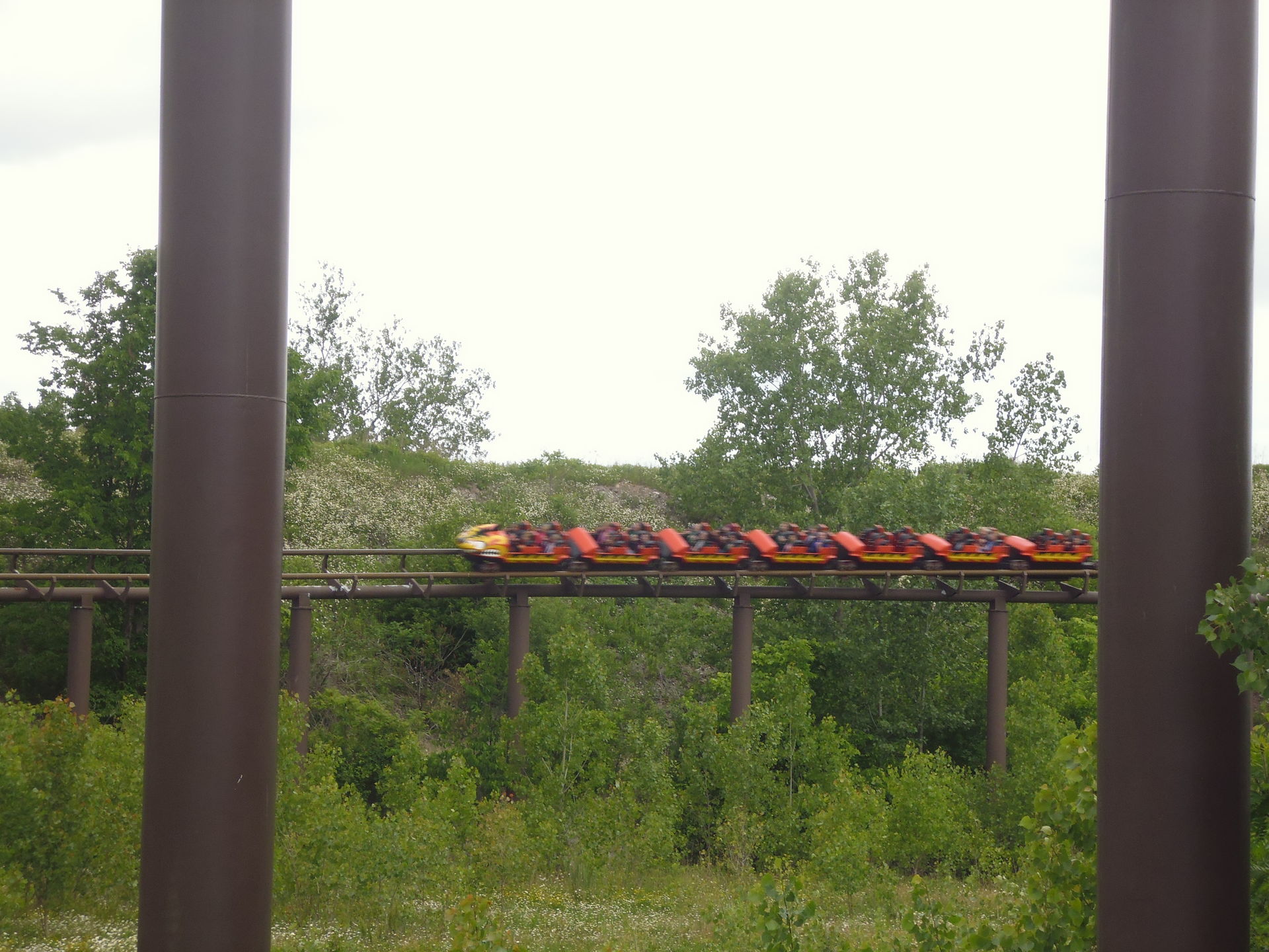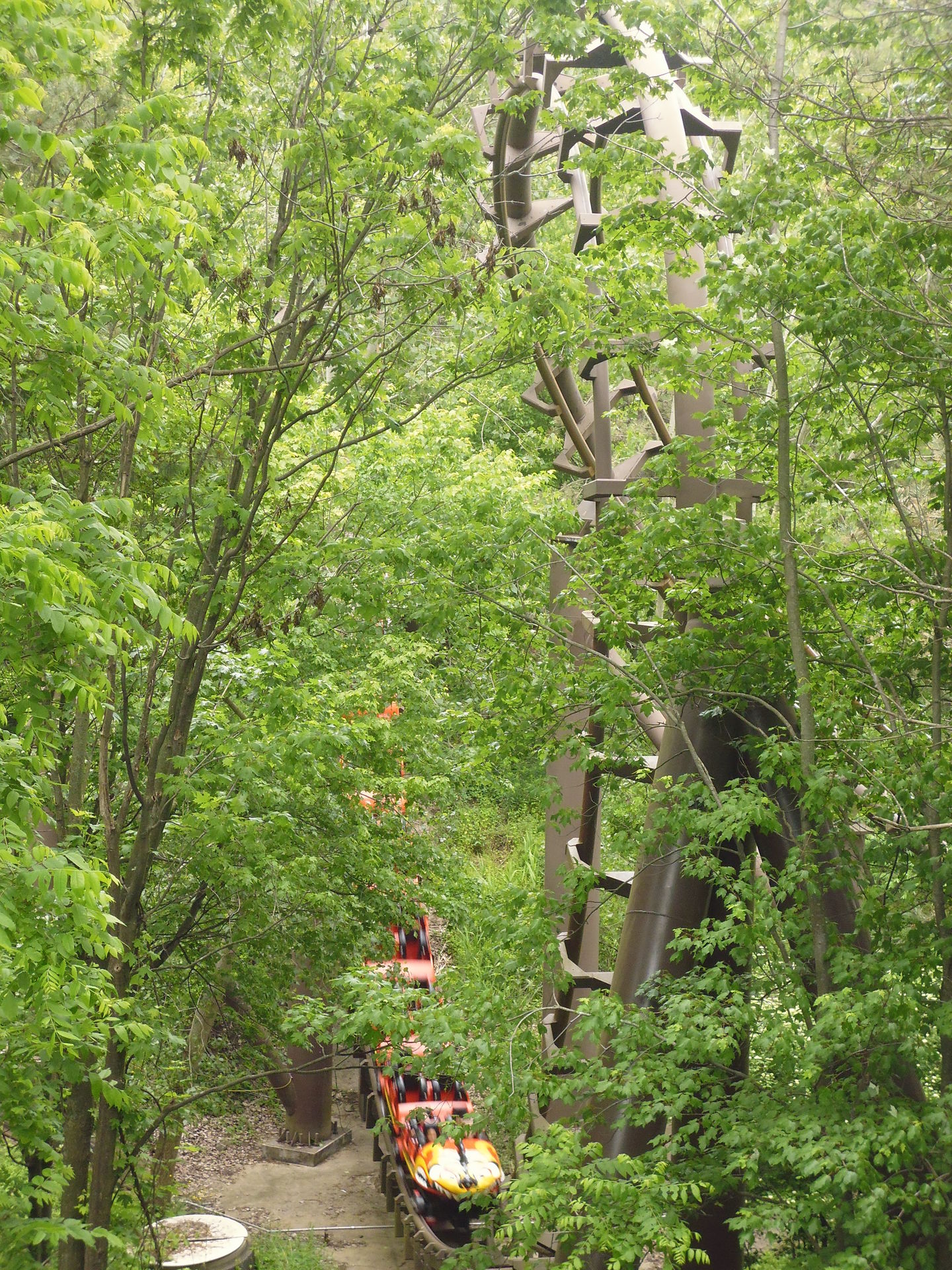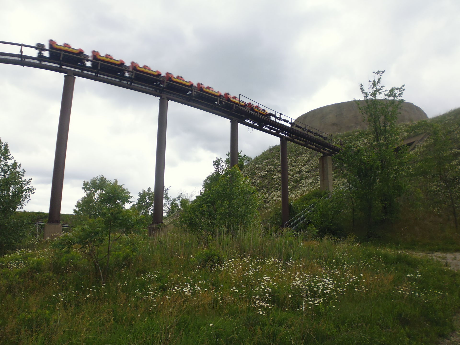 Luftbildern der Bahn nach wird wohl ein Wert zwischen 630 und 720° an Drehung vollzogen, dann verschwindet man über einen rasanten und etwas rau überrumpelten Dip in einem stockdunklen Erdloch und verlässt den Vulkan wieder. In diesem kontinuierlich abfallenden Tunnelteil noch mehr Schnelligkeit aufbauend schiesst man dann irgendwann wieder ans Tageslicht und durchflitzt eine sehr weite zuerst noch weiter abfallende und dann wieder aufsteigende Schwenkerkurve im hintersten Teil des Parks. Dieser Streckenabschnitt hat wohl die höchste Aufständerung der ganzen Bahn über Bodenniveau und bietet mit der Industrieromantik dahinter leider einen etwas starken Kontrast zur tollen Terrainausnutzung bis jetzt. Was ausserdem auffällt: hier scheint es keine wirkliche Parkgrenze zu geben und es hat absolut niemanden gestört, dass ich auf einem Kiespfad entlang des Rehgeheges noch etwas näher an die Bahn rangelaufen bin, um sie zu fotografieren. Hätte ich den noch weiter beschritten hätte ich womöglich ohne Weiteres aus dem Park raus spazieren können und wäre beim benachbarten Industriezubringer Stanley Avenue gelandet.