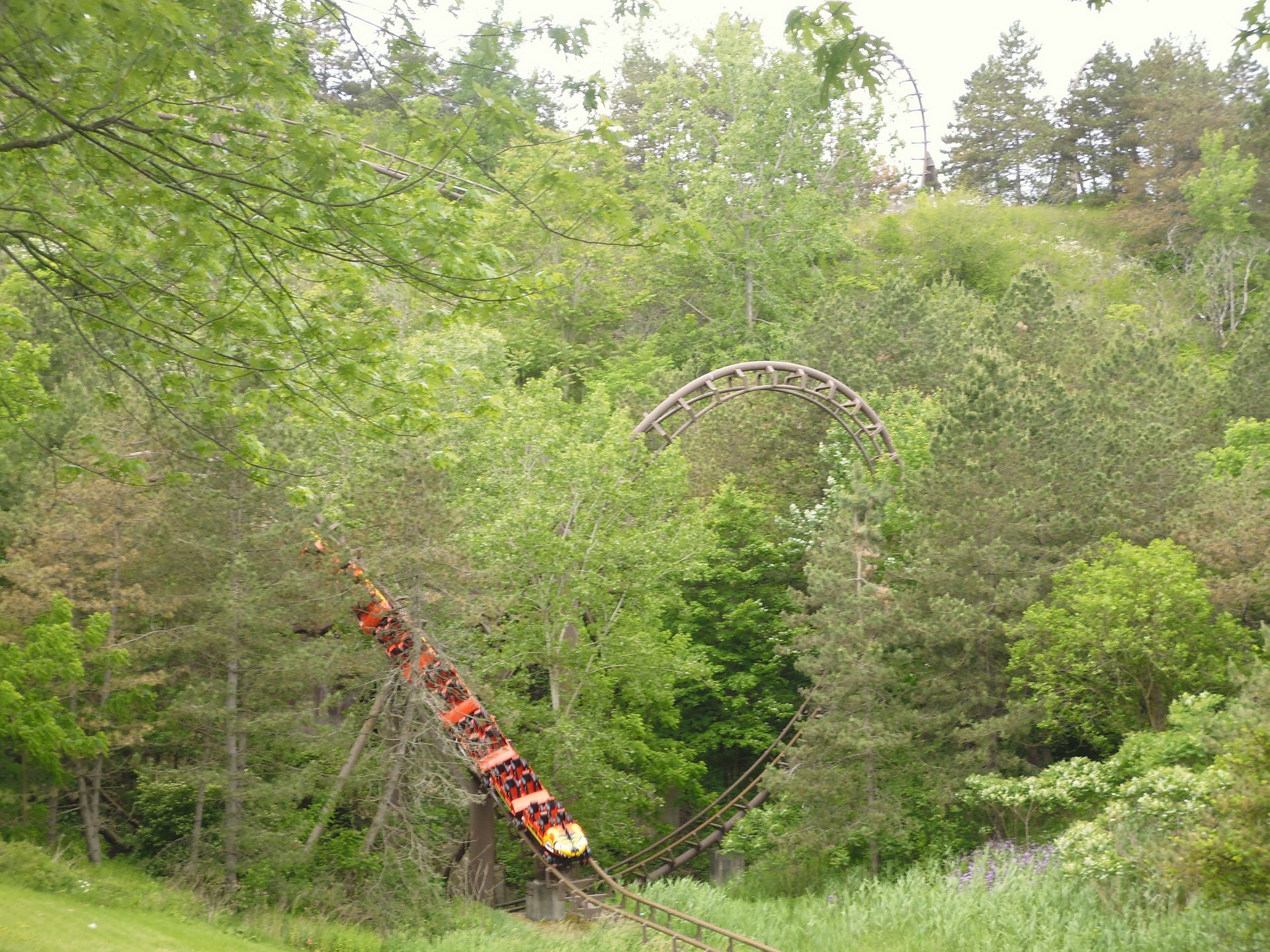 Einmal oben angekommen geht es dann immer noch in die Wiese eingebettet, aber streckenmässig sehr klassisch weiter: Pre-Drop, Kehrtwende und dann der geschätzt etwa 30 Meter hohe