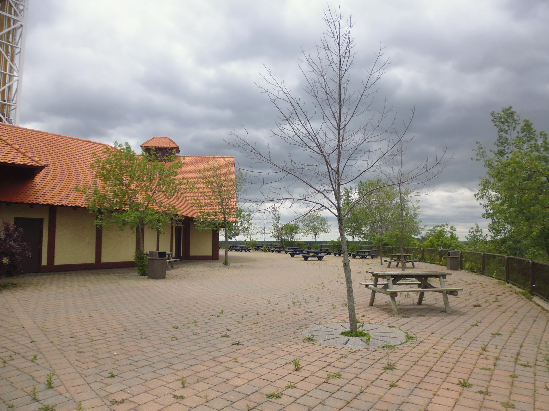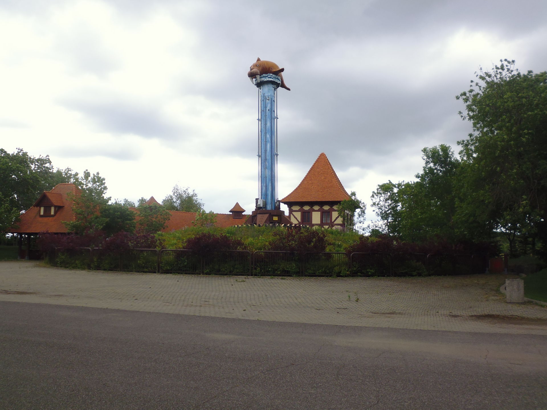 Der riesige Platz um den Sky Screamer herum ist irgendwie sinnbildlich für den ganzen halt schon eher traurig daherkommenden Park, der definitiv schon mal bessere Zeiten erlebt hat. Gras wächst durch alle Wegplattenritzen, auf denen wohl schon länger nicht mehr die Menschenmengen spazieren, mit denen man hier mal gerechnet hat. Auch das Restaurant Sky Grill daneben sieht nicht so aus, als ob es in diesem Jahr schon einmal Gäste empfangen durfte. Die Picknicktische werden wohl auch nur noch zur Schau rausgestellt und ihrem Schicksal überlassen... Trostlos ist gar kein Ausdruck.