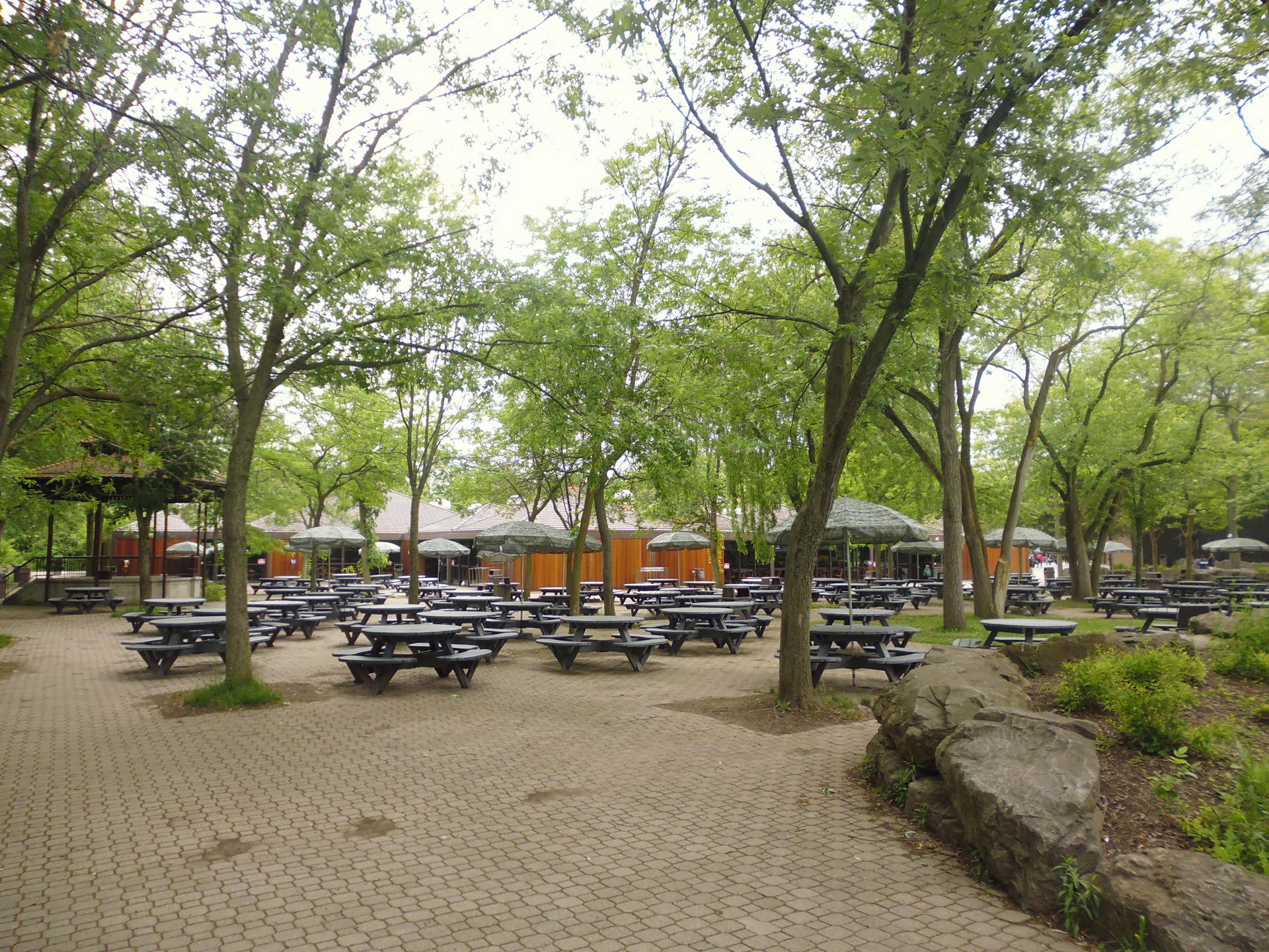Und mit diesem Bild vom ausgestorbenen Hungry Bear Restaurant schliesse ich die Revue nun ab. Ein Fazit zum Marineland zu ziehen fällt wahrlich nicht leicht. Wie gesagt hab ich eigentlich gewusst, dass ausser dem genialen Dragon Mountain hier nicht viel zu holen ist und es war mir auch bewusst, dass der fast ohne Rabattmöglichkeiten daherkommende Eintrittspreis für so einen Park rundherum schon ziemlich hoch angesetzt ist. Etwas naiv hab ich mir halt gedacht, dass die im Voraus gelesenen Reviews vielleicht schon etwas übertreiben und ich mit meinem Blick fürs Gute bestimmt auch etwas über das Arrow-Unikat hinaus hier finden werde, was den hohen Preis wieder etwas aufwiegt. Nur muss man im Nachhinein einfach sehen: die Hälfte der Fahrgeschäfte war geschlossen, ausser dem Sky Screamer hat keine der anderen Attraktionen so richtig überzeugen können und als Gast kam man sich abschnittweise richtiggehend als Fremdkörper vor auf diesem riesigen, irgendwie an der Realität vorbei geplanten, desolaten und stellenweise schlicht auch nicht gut in Schuss gehaltenen Gelände voll überbreiter Endlos-Wege und 70er-Jahre-Baucharme... Da wollte man nach ein paar Fahrten Dragon Mountain wahrhaftig einfach bloss noch weg, was ich gegen 14.00 Uhr ganz wie Paris Geller ("Yes! Bye!") dann auch getan hab. Im Endeffekt hab ich den Besuch zwar nicht unbedingt bereut, aber eine baldige Rückkehr ist in naher Zukunft dennoch kaum vorgesehen - selbst, wenn ich mich nochmals in Niagara Falls aufhalten würde. Summa summarum: für Hardcore-Fans von Arrow-Raritäten vielleicht eine Empfehlung wert, vielleicht aber auch nicht.