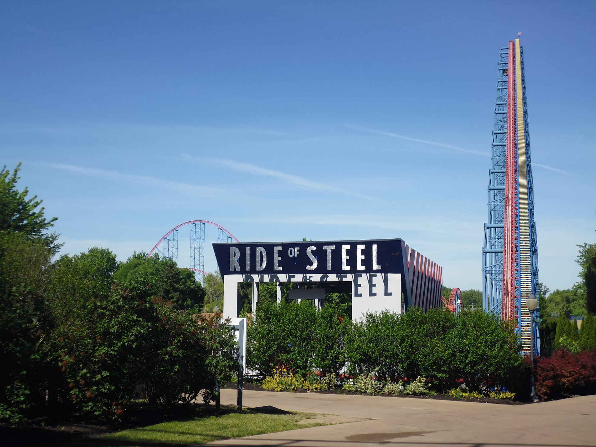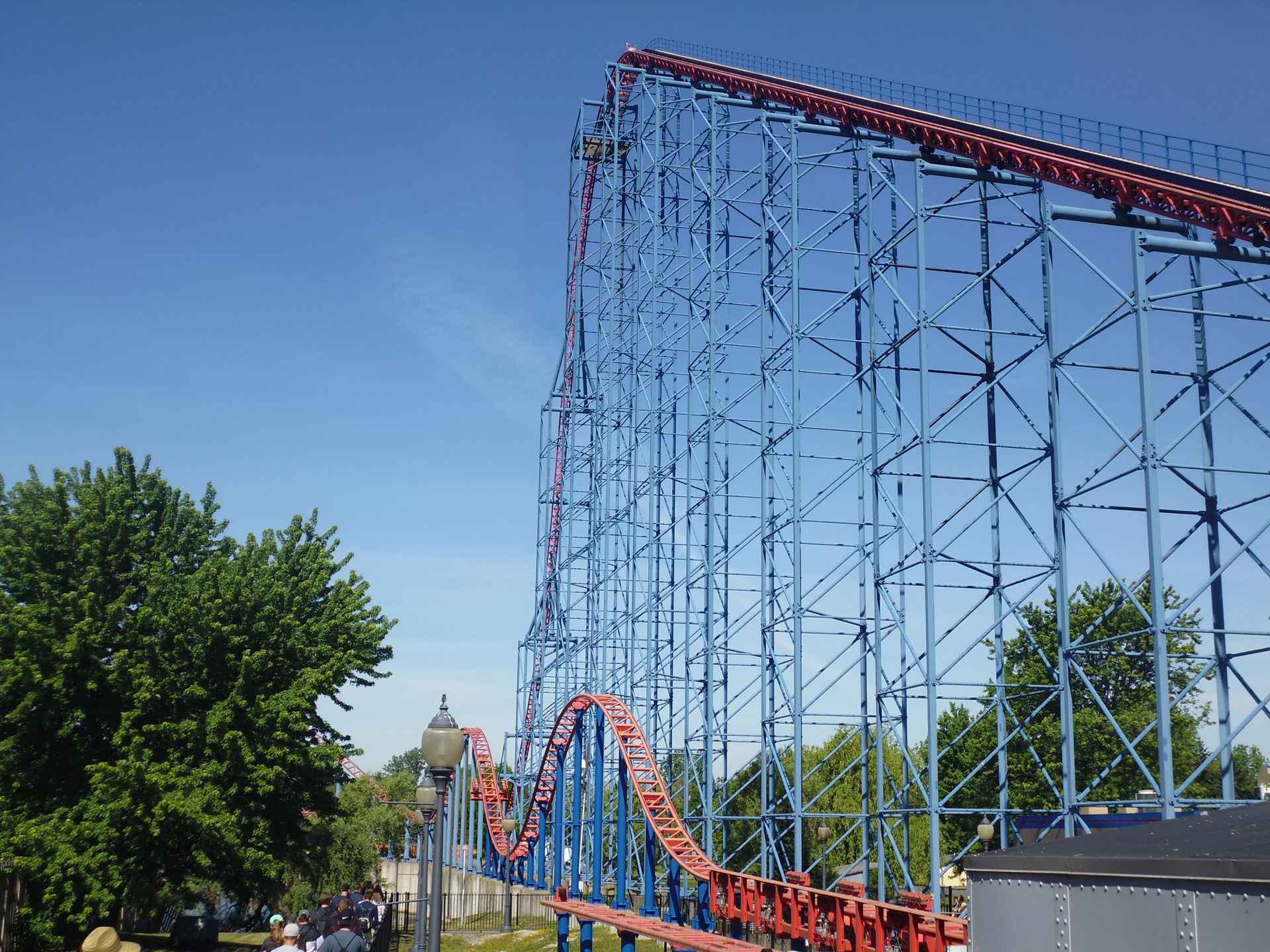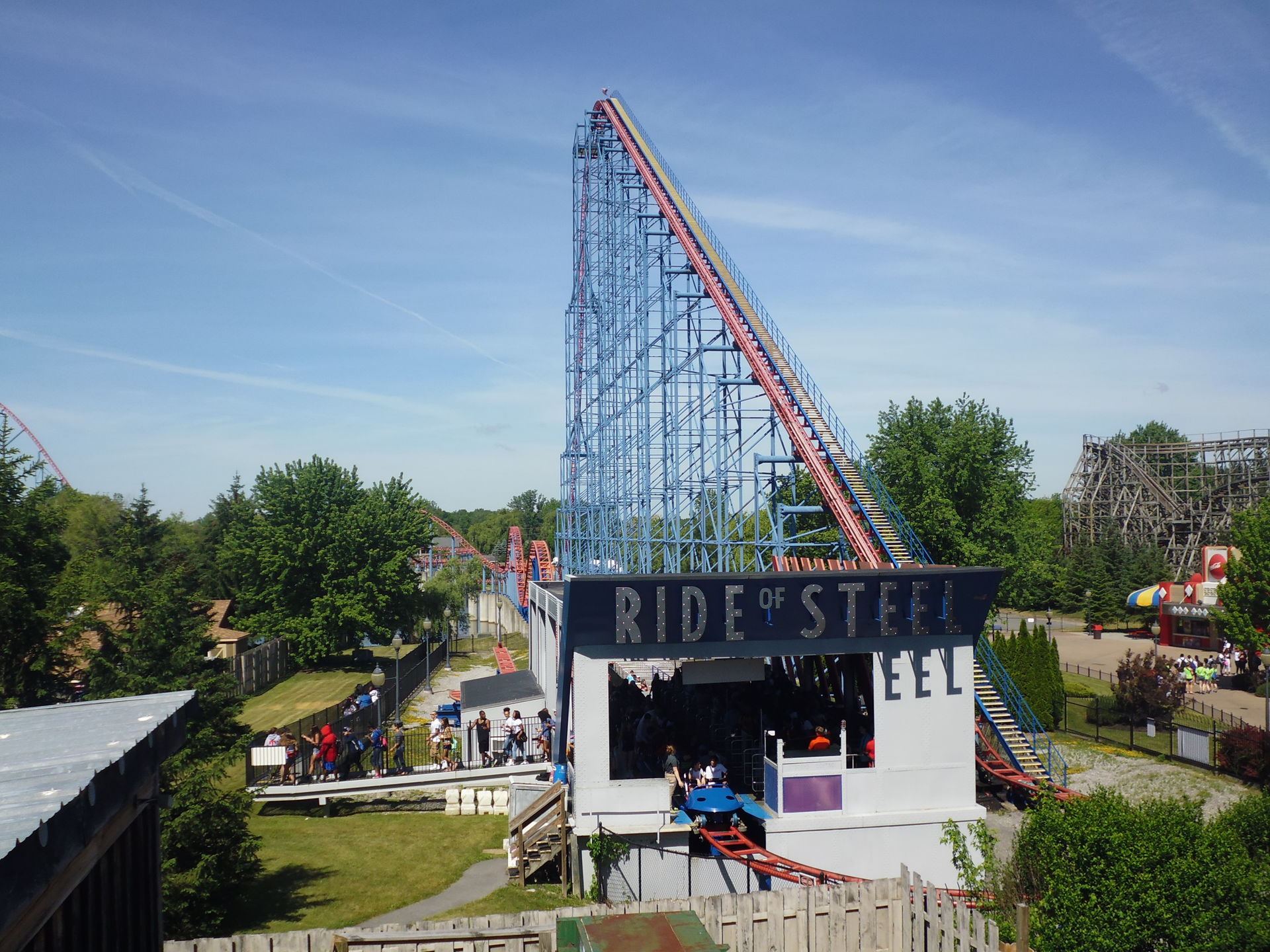Intamin Megacoaster Ride of Steel, ehemals einer von vielen Six Flags'schen Supermen und Schauplatz mindestens zweier tragischer Unfälle. Zwar konnte ich beim Heranlaufen schon eine Fahrt mit offenbar zwei Parkbesuchern in der Frontrow des Zugs beobachten, allerdings war das Eingangstor zur Attraktion bei meiner dortigen Ankunft doch geschlossen. Nicht enden wollende zehn Minuten hat es gedauert, bis ein Mitarbeiter die Kette endlich aufgemacht und der in dieser Zeit schon beachtlich weit nach hinten aufgestauten Menschenmasse den Zugang zum Wartebereich gewährte. Das fängt ja toll an.