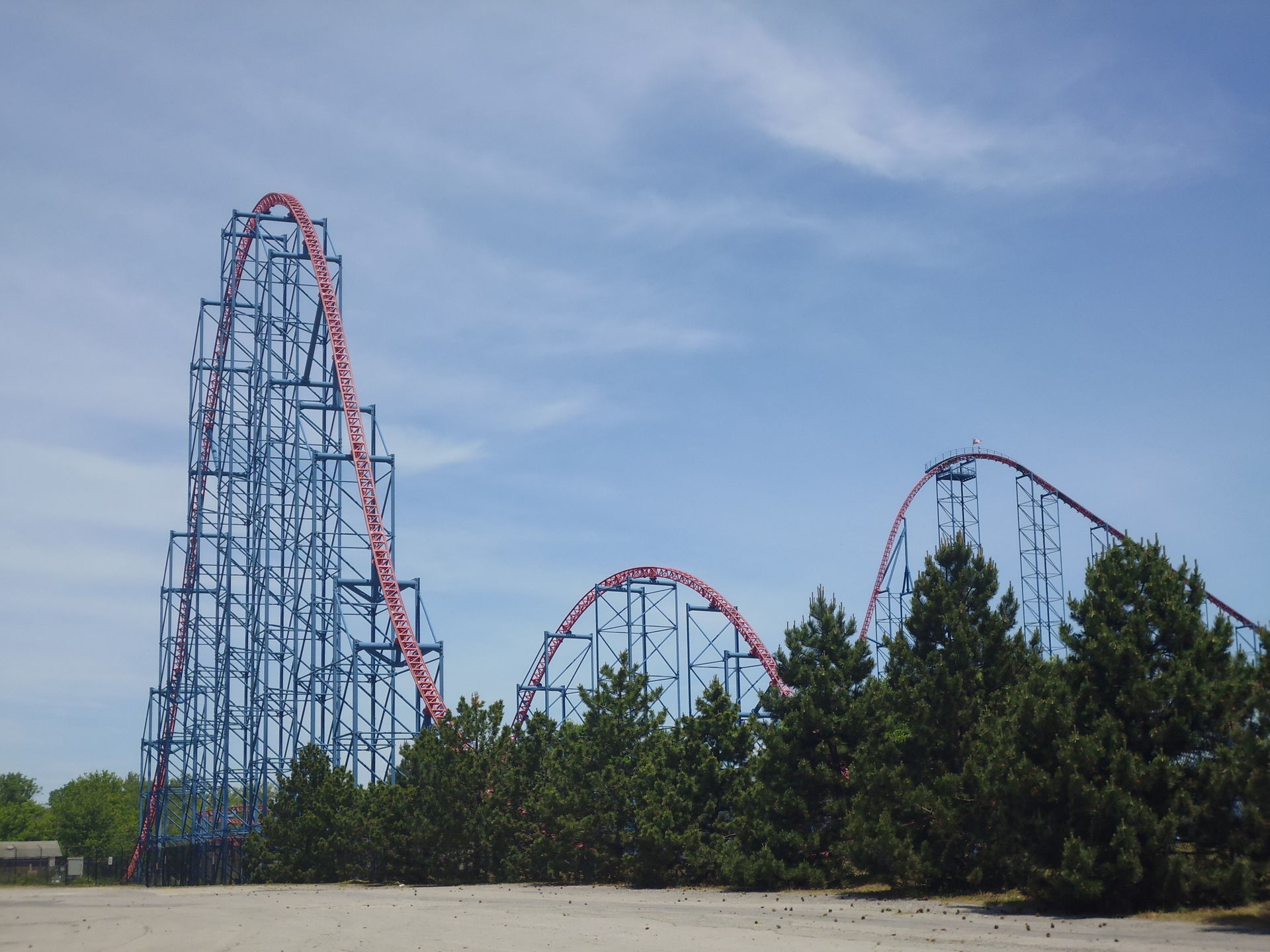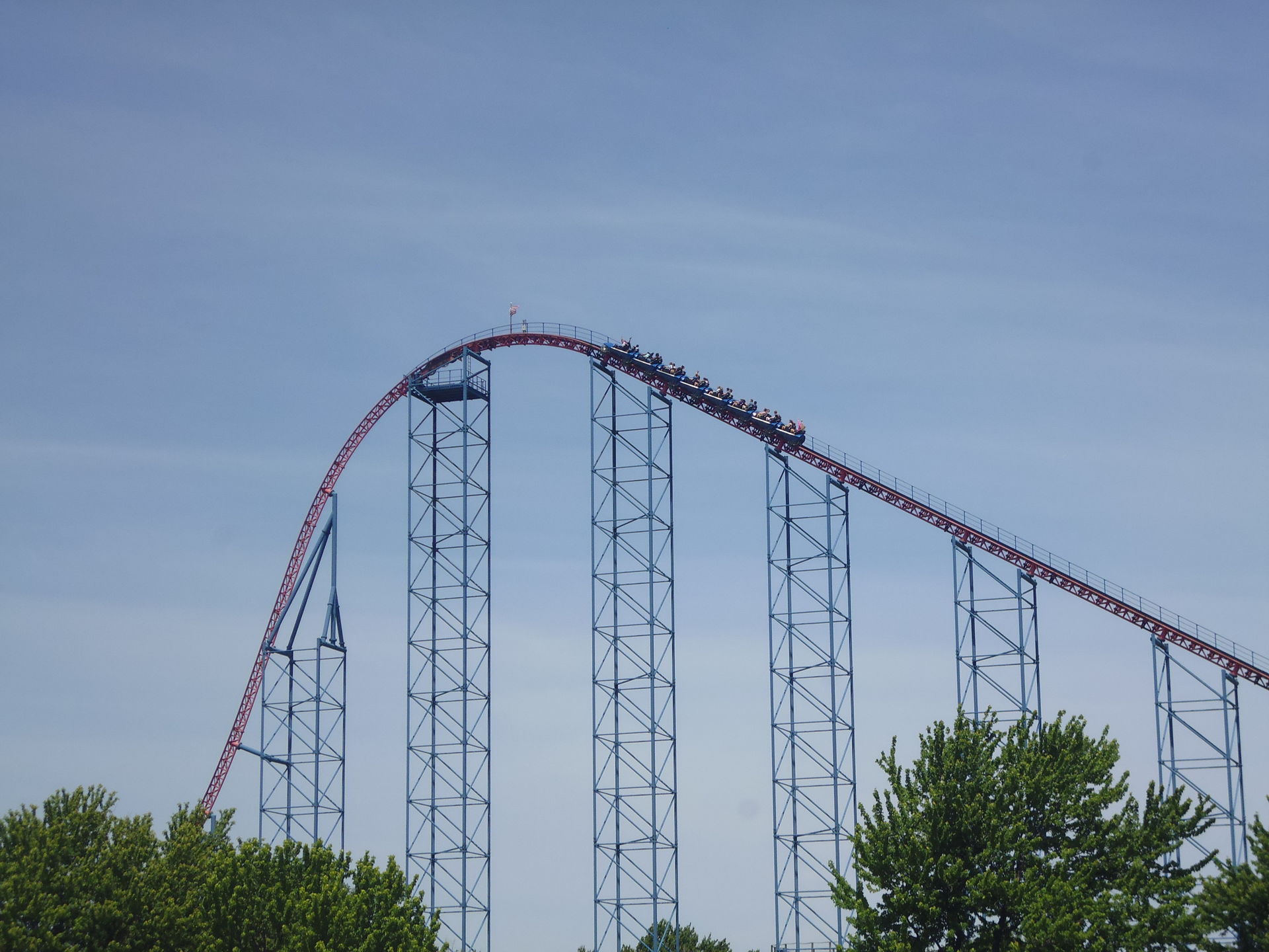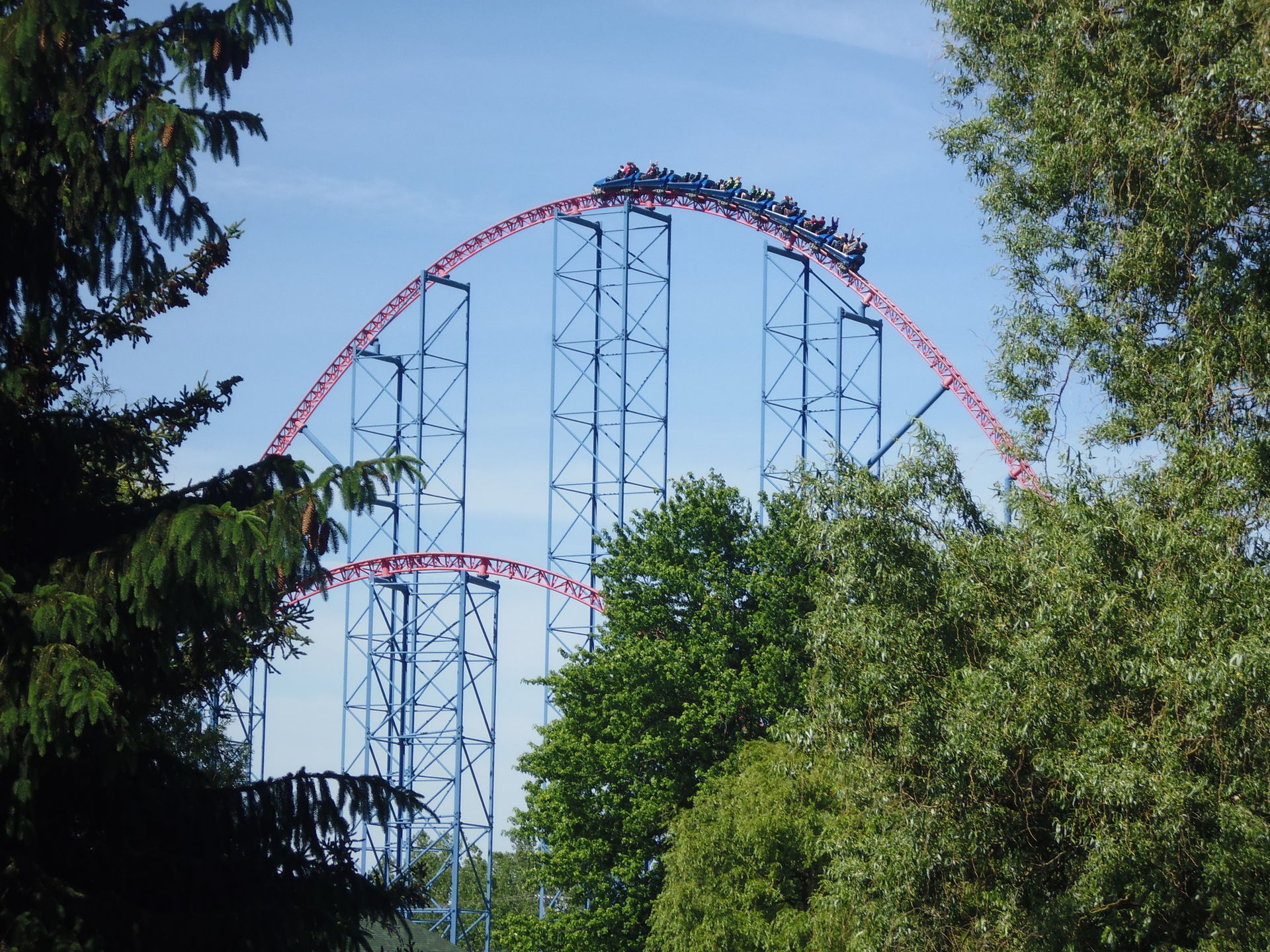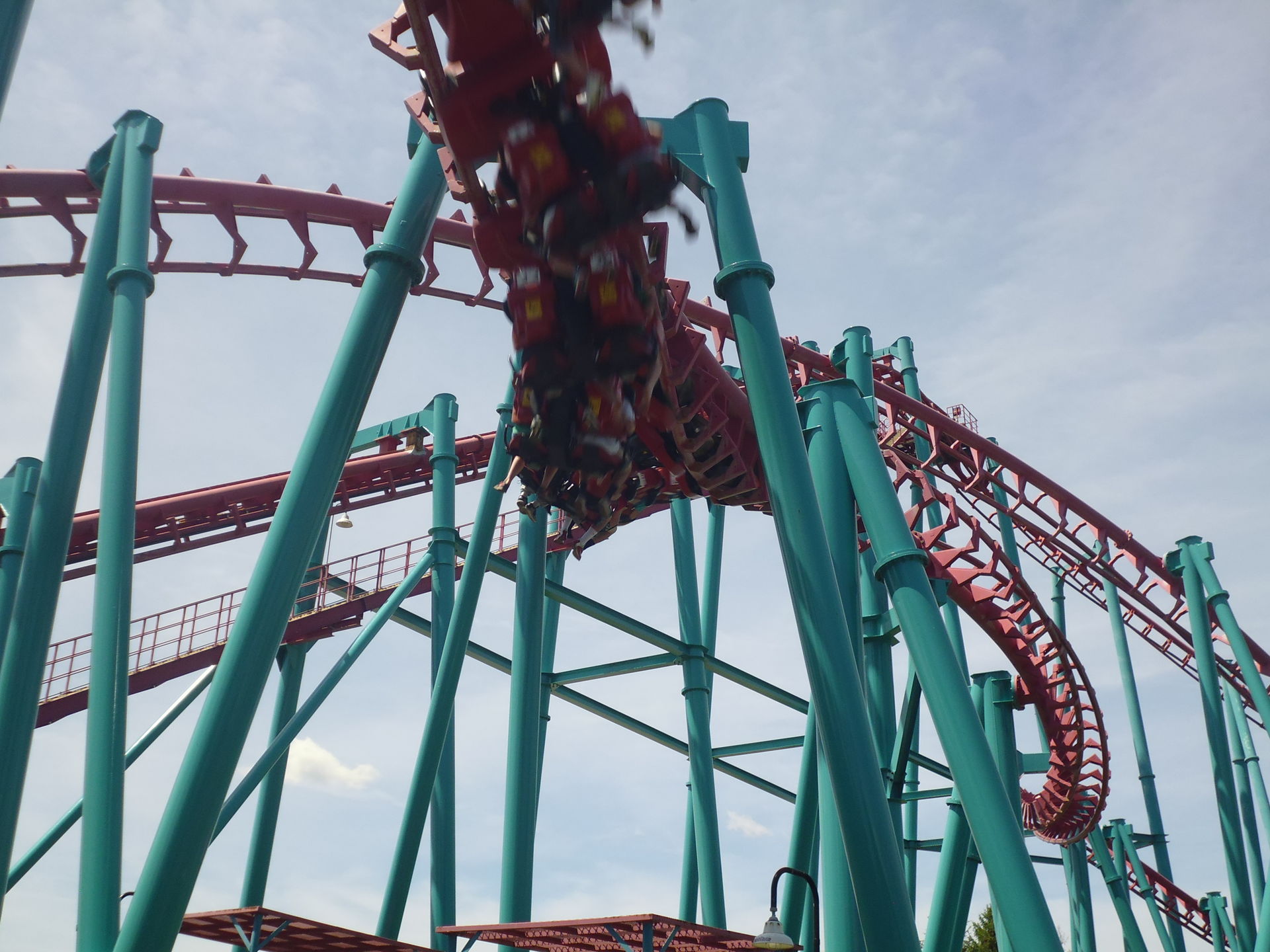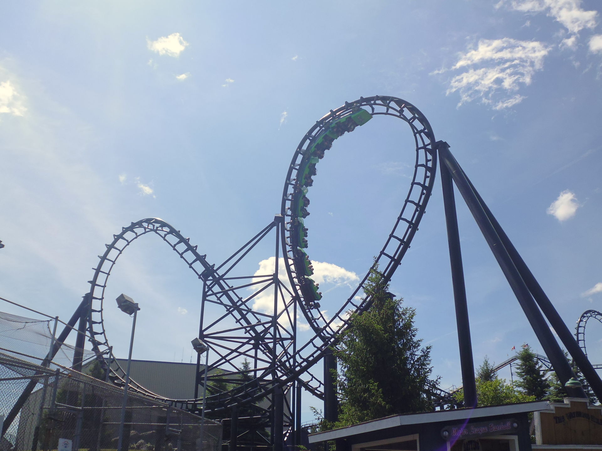 Ich nahm im zweithintersten Wagen Platz und nach korrektem Festzurren aller Fahrgäste ging es auch schon los! Aus 62.5 Metern Höhe nimmt man Anlauf und mit den erreichten 117.5 km/h flitzt man dann durch eine gespiegelte Version des Layouts, das mir bereits von der ehemaligen Schwesterbahn in Six Flags America her bekannt ist. Obgleich streckenführungsmässig nicht sonderlich einfallsreich hat mir die Fahrt hier genau gleich gut gefallen wie damals bei Washington. Die erste Schussfahrt ist fantastisch, die grossen Hügel sind auch hier überraschend steil, durch die oft bemängelten Riesen-Helices ist man herrlich schnell durchgeflitzt und die abschliessenden Bunnyhops bieten ansehnlich starke