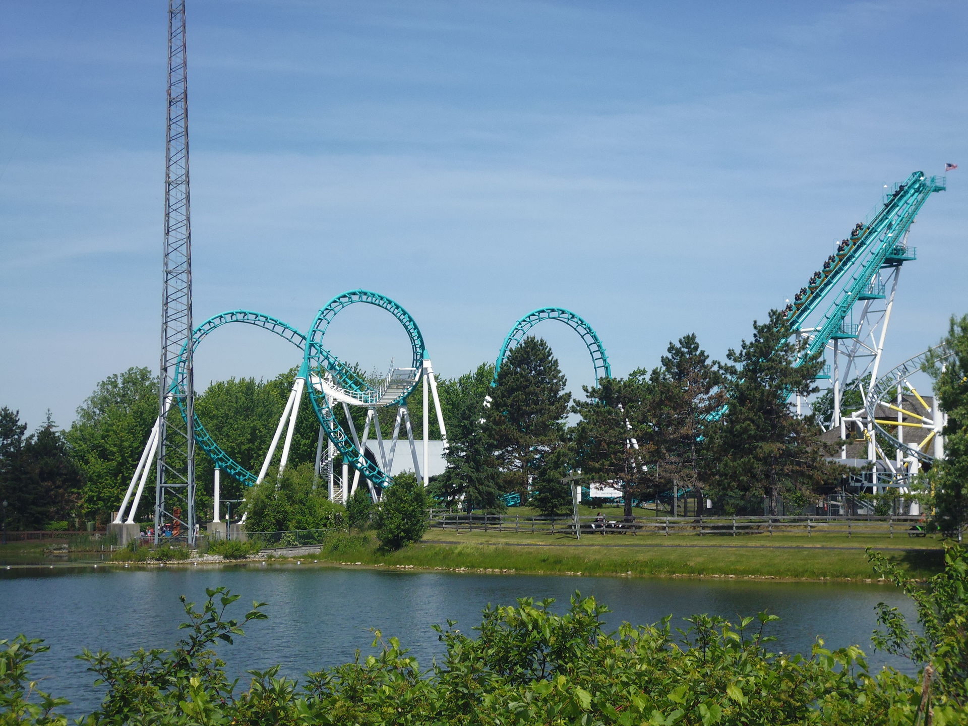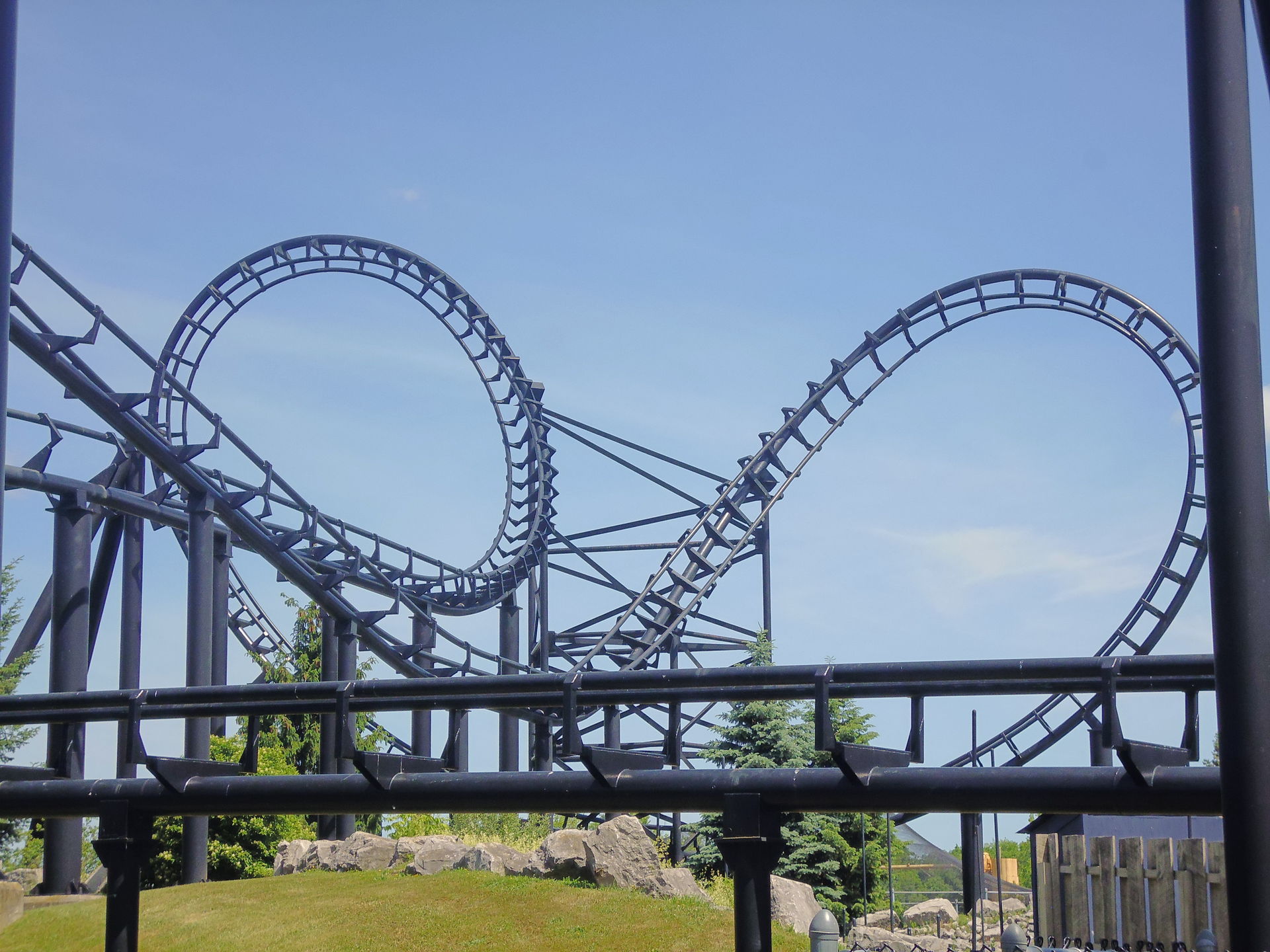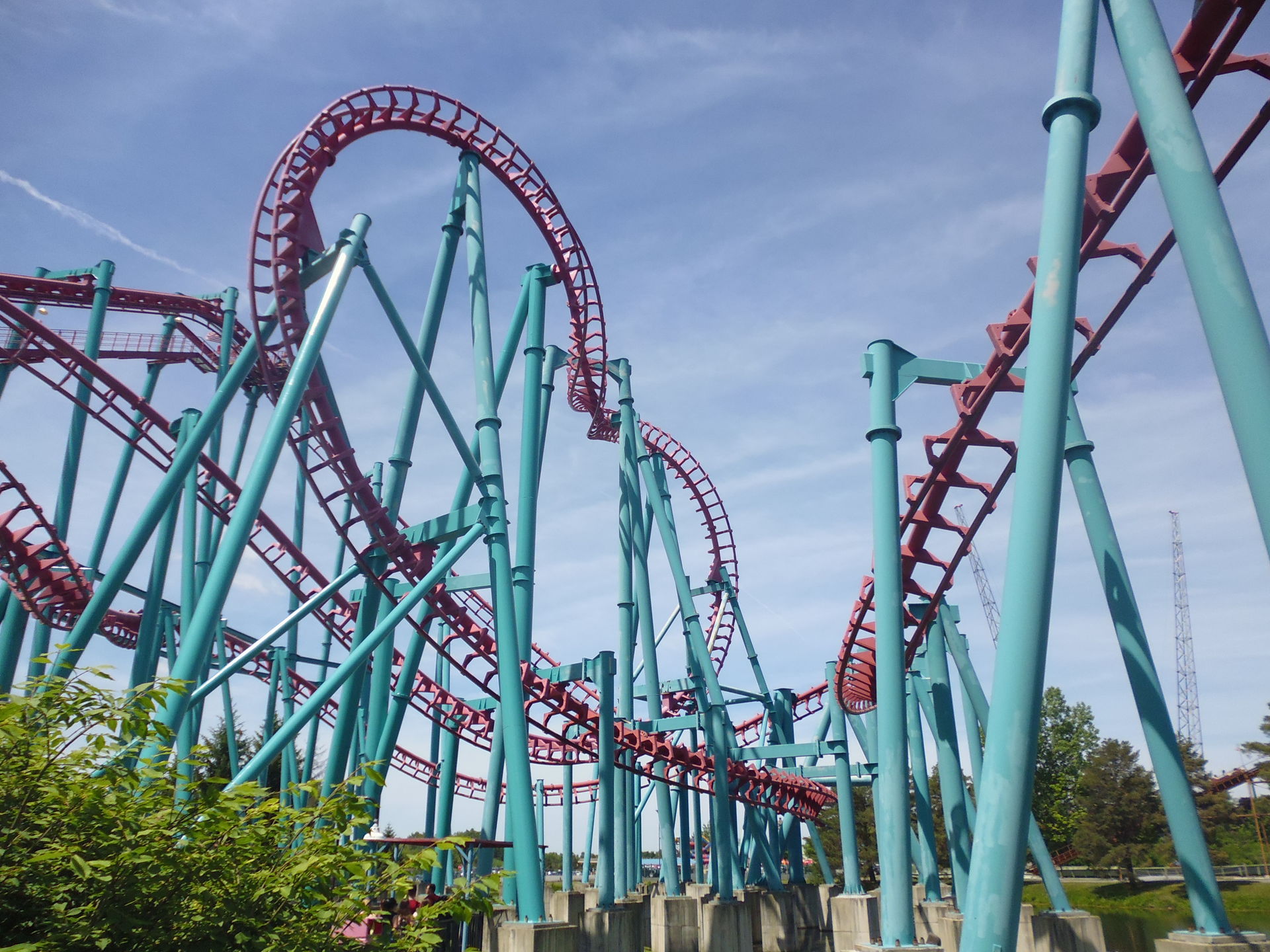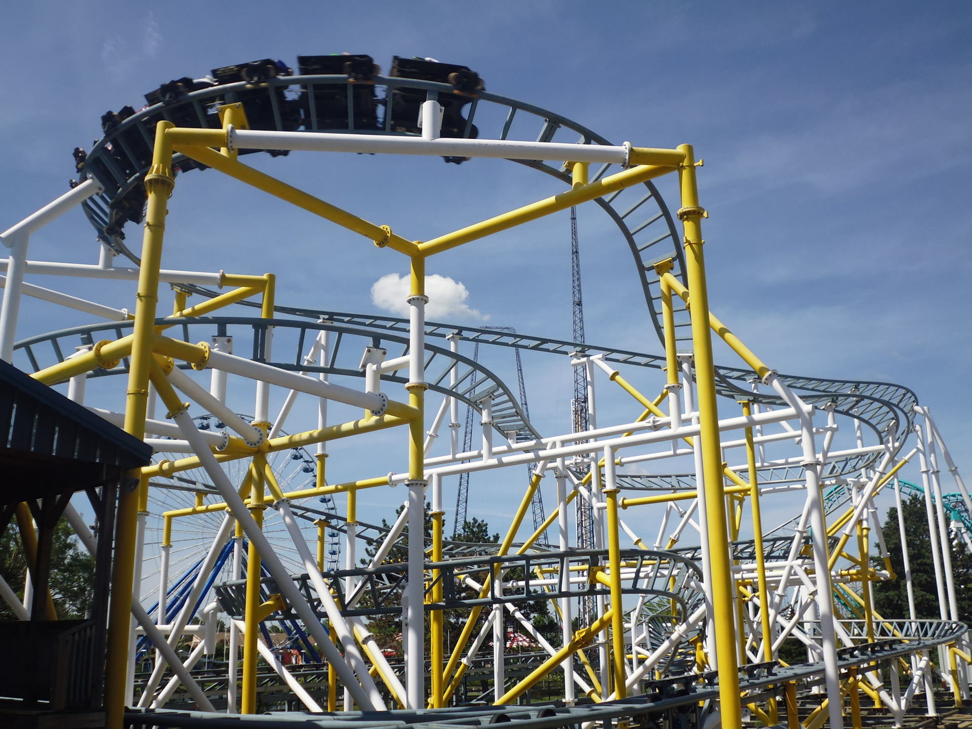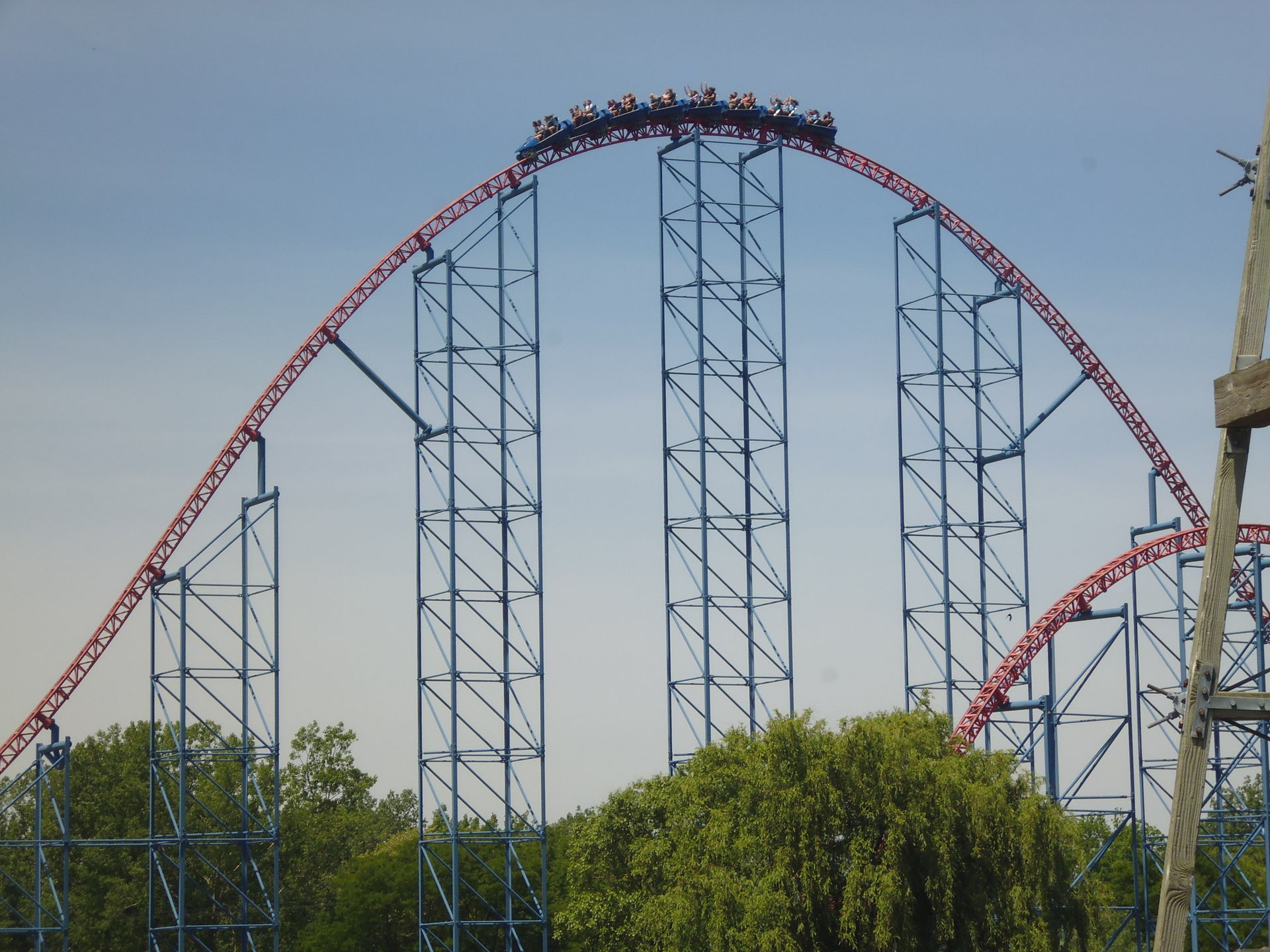 Ich nahm im zweithintersten Wagen Platz und nach korrektem Festzurren aller Fahrgäste ging es auch schon los! Aus 62.5 Metern Höhe nimmt man Anlauf und mit den erreichten 117.5 km/h flitzt man dann durch eine gespiegelte Version des Layouts, das mir bereits von der ehemaligen Schwesterbahn in Six Flags America her bekannt ist. Obgleich streckenführungsmässig nicht sonderlich einfallsreich hat mir die Fahrt hier genau gleich gut gefallen wie damals bei Washington. Die erste Schussfahrt ist fantastisch, die grossen Hügel sind auch hier überraschend steil, durch die oft bemängelten Riesen-Helices ist man herrlich schnell durchgeflitzt und die abschliessenden Bunnyhops bieten ansehnlich starke