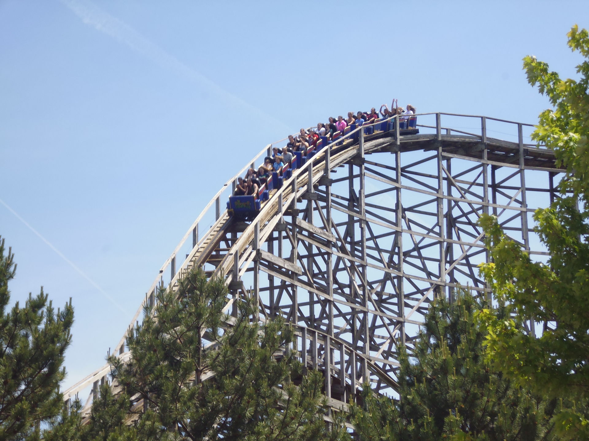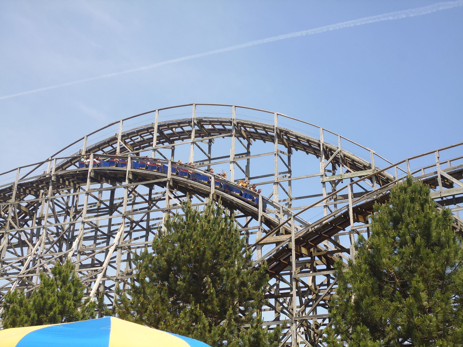 Airtime im Backseat noch einigermassen Spass, danach wird man schwerfällig durch den zweiten Teil kriechend einfach nur noch in einem Masse verprügelt, das nicht mehr lustig ist. Insbesondere in einigen der Täler geht das wirklich in die Rippen und auf den Magen - noch nicht ganz Mean-Streak-artig, aber schon deutlich schlimmer als auf den beiden Cedar-Fair-Hurlern. Besonders auf den letzten Hügelchen wundert man sich darüber, wie hier der Saft dermassen raus sein kann, man jedoch immer noch mit Gewalt so zwischen den Sitztrennern rumpoltert. Da hilft es auch nicht, dass es hier die vollständig mit Kunstleder gepolsterten Kleinmodelle sind, die das ansonsten ja gut dämpfen oder zumindest erträglicher gestalten. Laut den Angaben im TPR-Thread ist der zurzeit hier eingesetzte Zug ebenfalls der einzige noch vorhandene - ich vermute mal, dass es der von Holiday Worlds Voyage geerbte ist, da der ja noch etwas neuer sein dürfte. Allerdings hat man hier ja eindringlich am eigenen Leib erfahren: auch dieser Umstand kann eine solche Bahn nicht mehr retten.