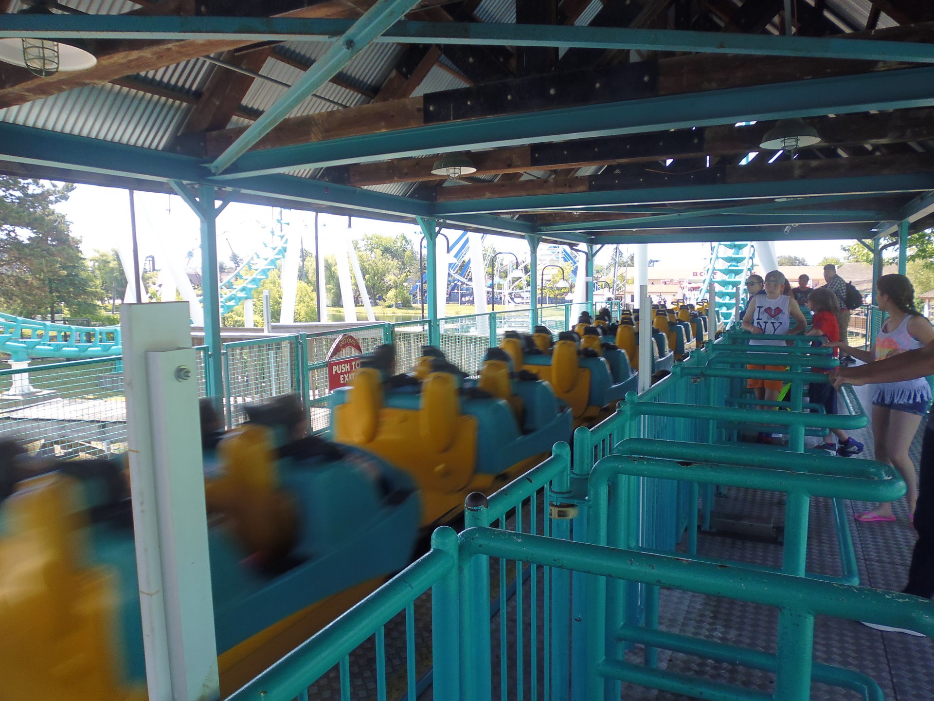 Boomerang auf dieser Reise war, wo man direkt an den Gates warten durfte, während der Zug noch unterwegs ist, aber so sicher bin ich da im Nachhinein gar nicht mehr - am Bat in Canada's Wonderland zumindest dürfte das auch so gewesen sein. Auf jeden Fall trifft das aber zu, wenn man die Anlage des ausgestossenen Darien Lake denjenigen seiner ehemaligen Six-Flags-Halbgeschwister Great Escape und La Ronde gegenüberstellt. Auch hatte dieses Exemplar hier im Gegensatz zu den dortigen eine zentral gesteuerte Verriegelung aller Waggons. Sich von Six Flags abzukehren hat manchmal auch kapazitätstechnische Minimalvorteile.