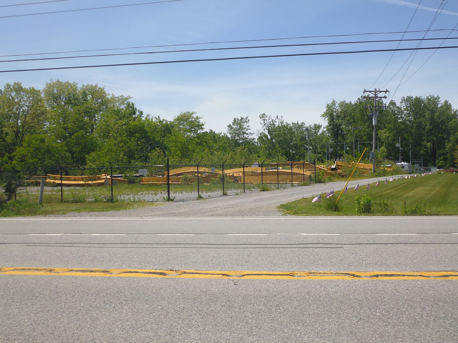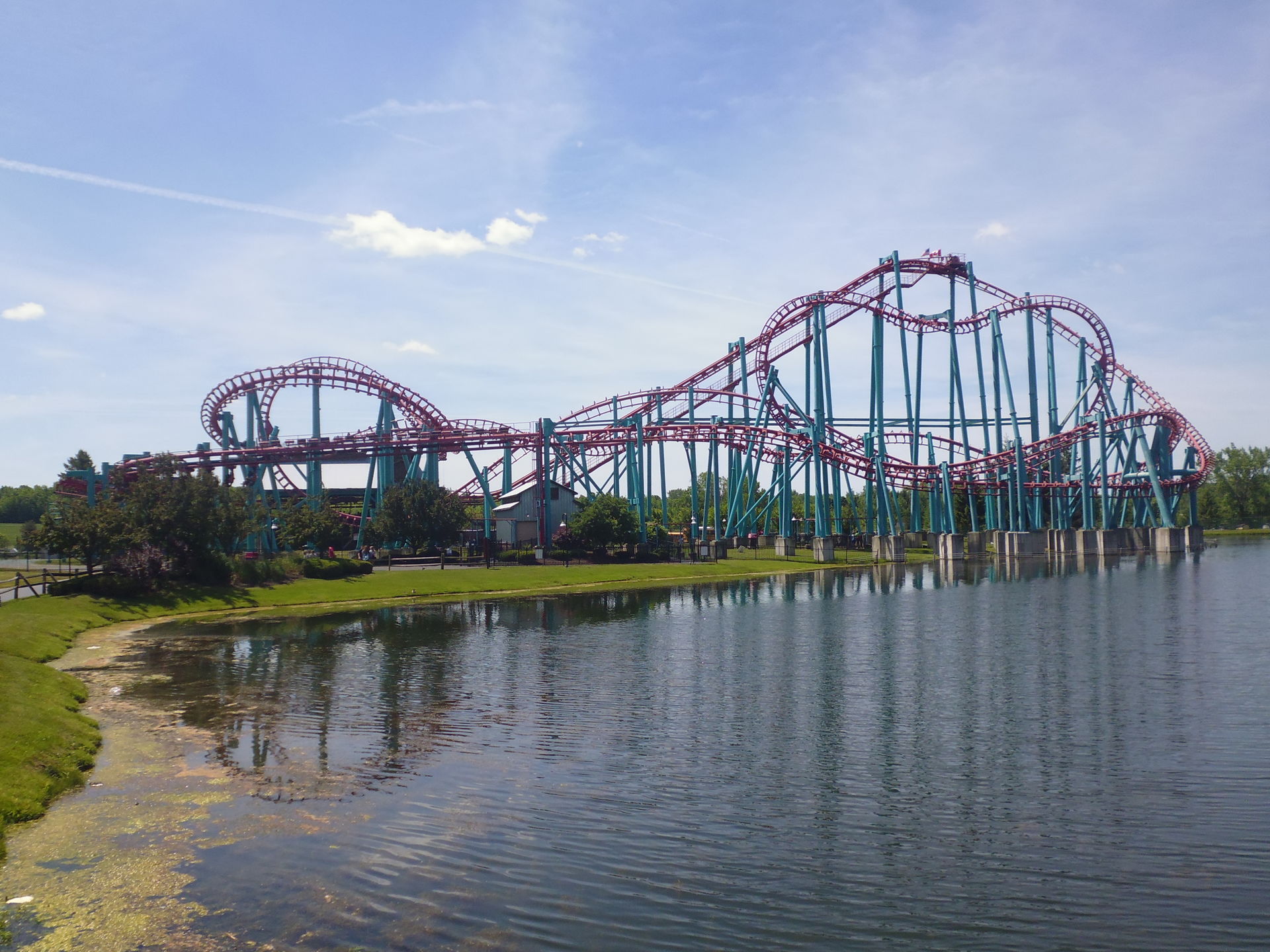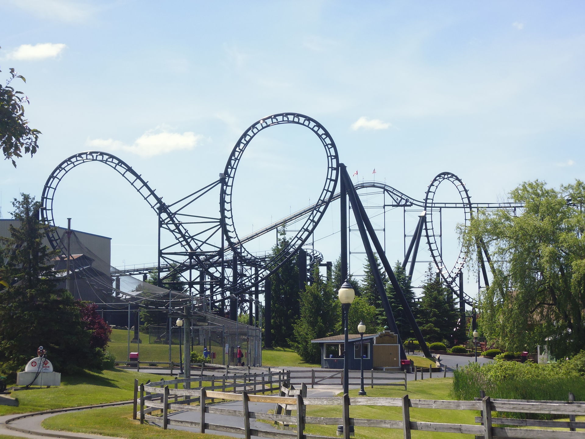 Aaanyhow: mit dem vergünstigten Ticket von AAA bewaffnet, das wie im Hersheypark sogar mit einem Voucher fürs Parkieren daherkam, machte ich mich tags darauf also auf den etwa halbstündigen Weg zum Park. Und dieser war sogar erfreulich einfach zu bewältigen, da ich idealerweise einfach die Genesee Street weiter nach Osten befahren konnte, an der auch mein Quality Inn lag. Etwas ausserhalb der Stadtgrenze mutierte diese zum Highway 33, der durch mehrere nette Dörfer und schliesslich direkt ins verschlafene kleine Corfu führt, das nur noch einen Katzensprung nördlich von Darien Lake liegt. Bald sah ich dann endlich den rot-blauen Riesen am Horizont und bog um kurz vor 10.00 Uhr tatsächlich kostenfrei auf den Parkplatz vom Ort des heutigen Geschehens ein. Allerdings hab ich wohl das entscheidende Einbiegemanöver zwischen den aufgestellten Hütchen verpasst, die hier als veritable Steeldrums daher kamen, denn ich landete im Gegensatz zu den meisten Fahrzeugen auf dem "Zweitlot" irgendwo bei Mind Eraser hinten. Auch egal.