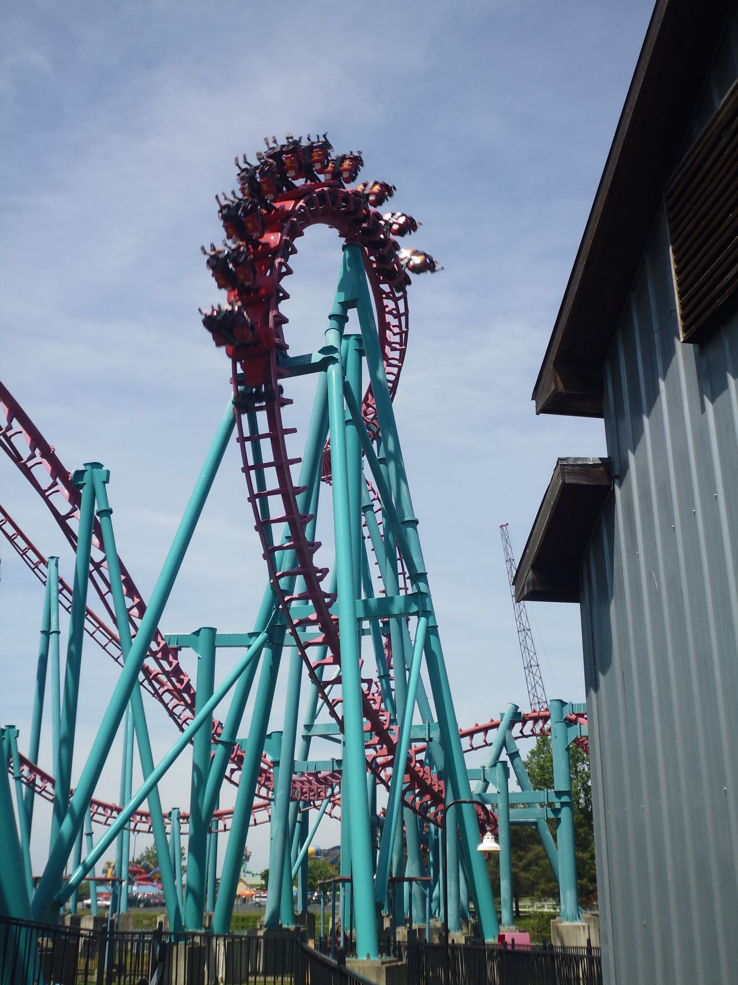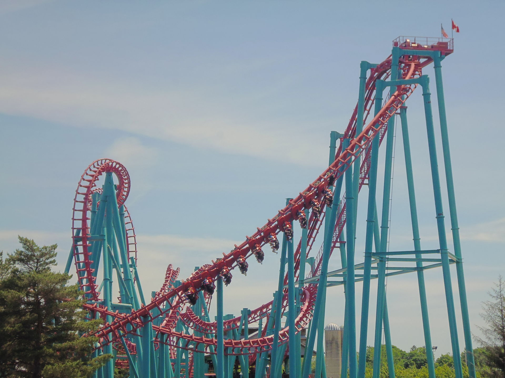 Looping, daraufhin durch einen die Fahrgäste zweimal auf den Kopf stellenden